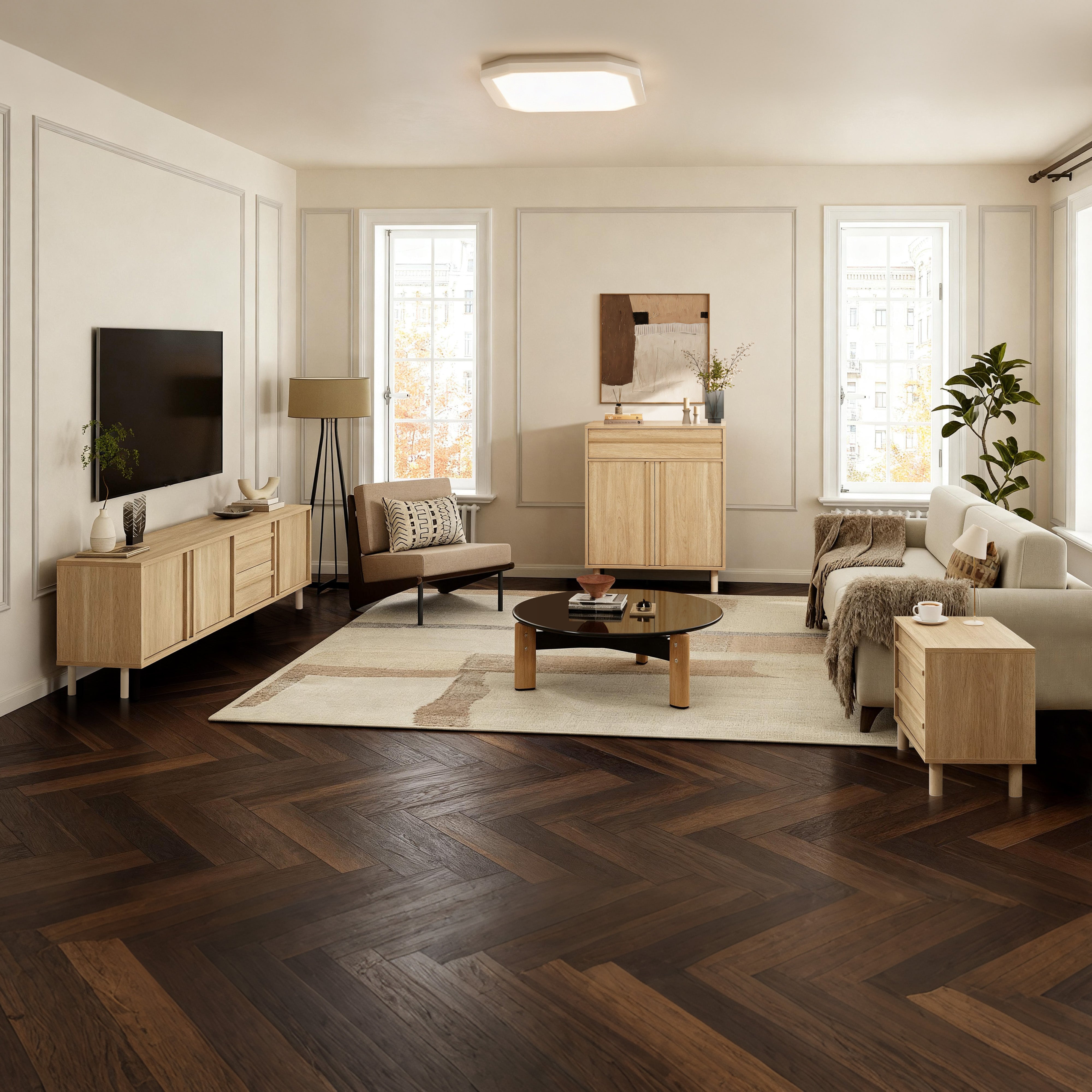 - Japandi Modern Design: Warm oak tones with clean architectural lines