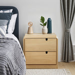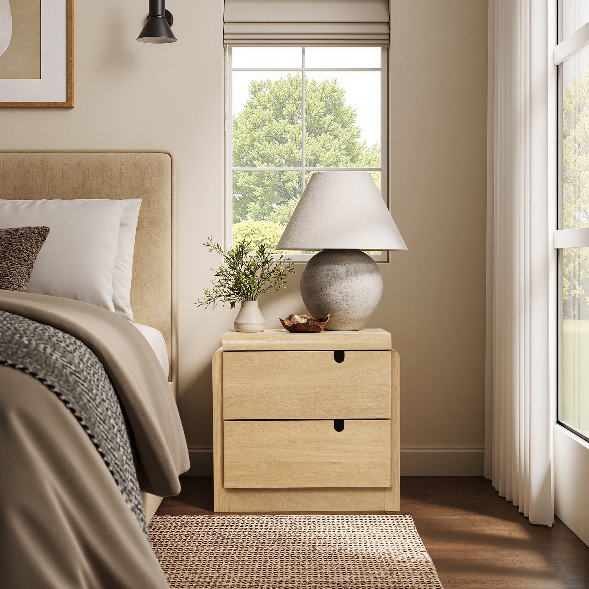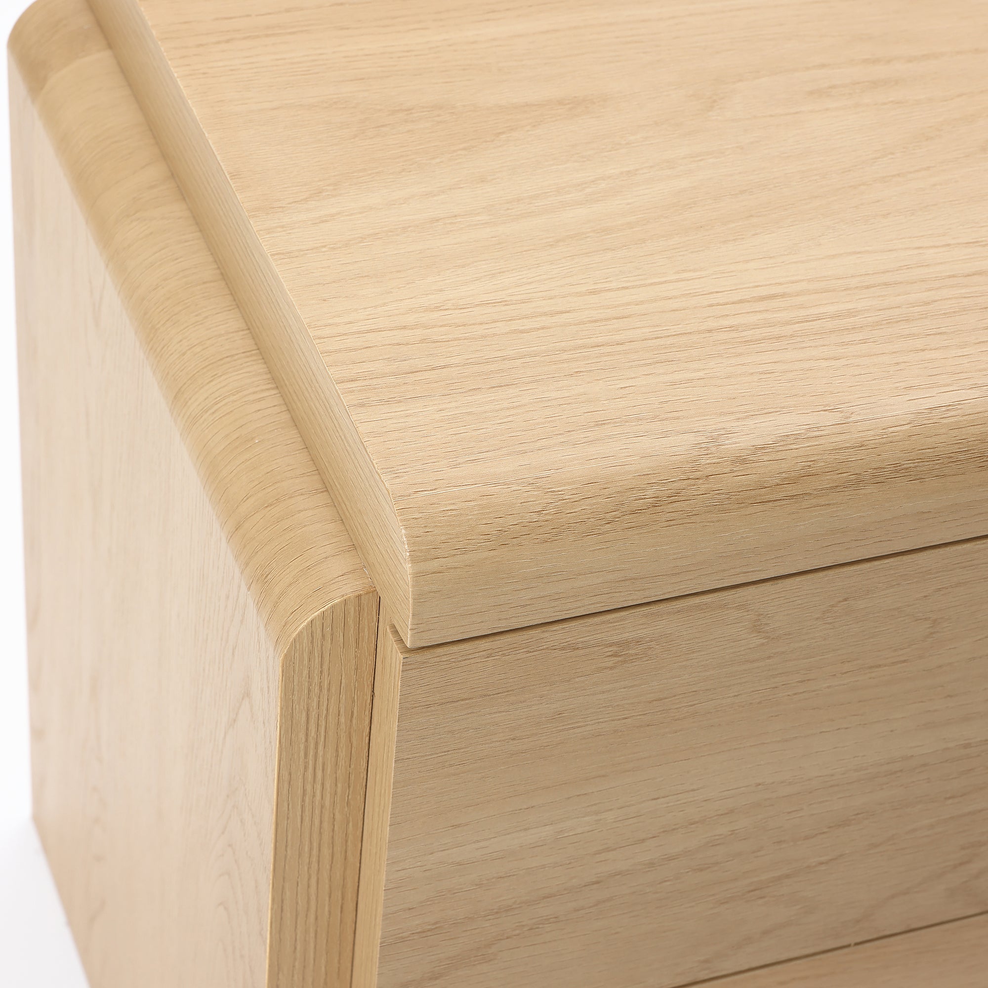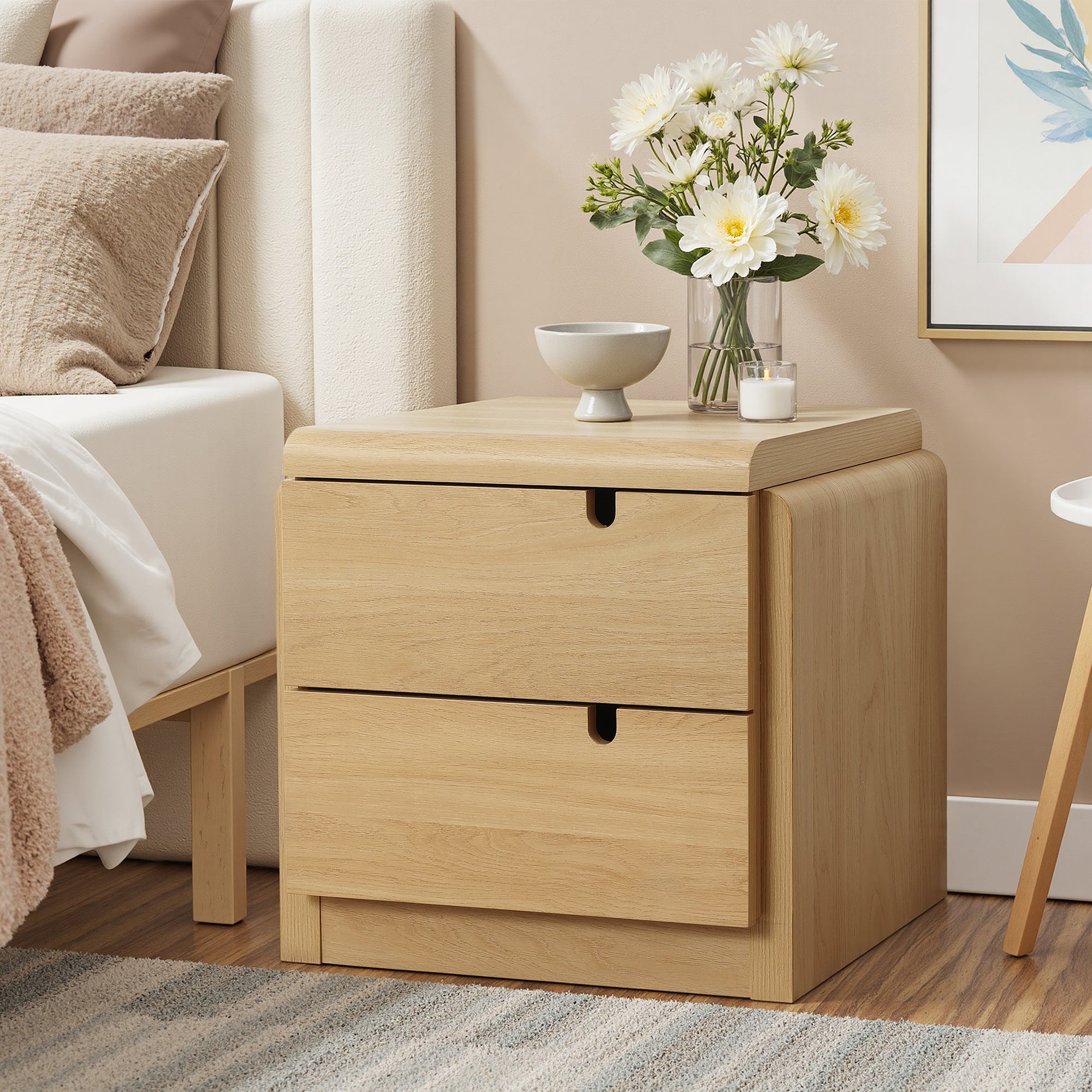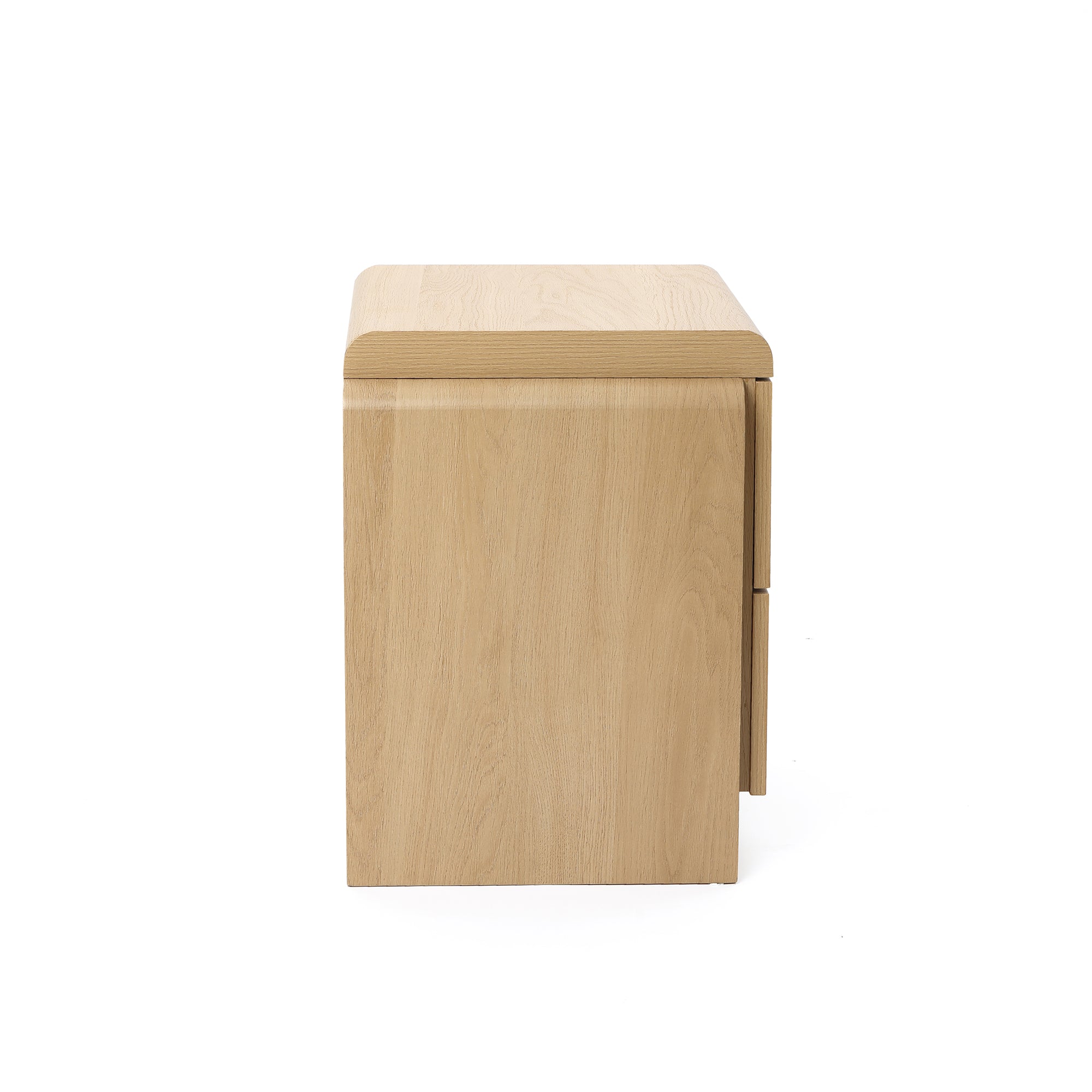 Features a sleek floor-standing structure. The two spacious drawers offer convenient. The soft, curved edges and half-moon drawer pulls provide a visually soothing touch. Crafted from high-quality MDF with a white oak veneer.