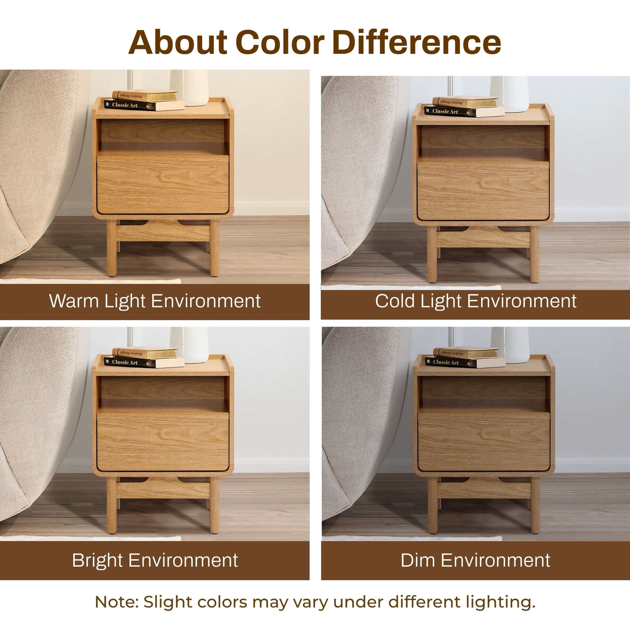 If you're searching for an end table for the family room or a bedside nightstand, check out our Summer Oak Engineered Wood Table with Storage. It combines mid-century elegance with modern aesthetics, crafted from engineered wood and finished in a rich oak color for both sturdiness and durability. The wood finish highlights the natural grain, while the rounded wooden legs and elevated side panels provide solid support and prevent items from falling, adding both security and warmth. This table features one open shelf and one drawer, offering ample storage space that balances practicality with style which is ideal for both storage and display purposes. Additionally, the drawer is equipped with metal slides, allowing it to open and close smoothly and silently, which helps to reduce any accidental slamming. This multifunctional side table can enhance your living room or bedroom, making your home life more comfortable and of higher quality.