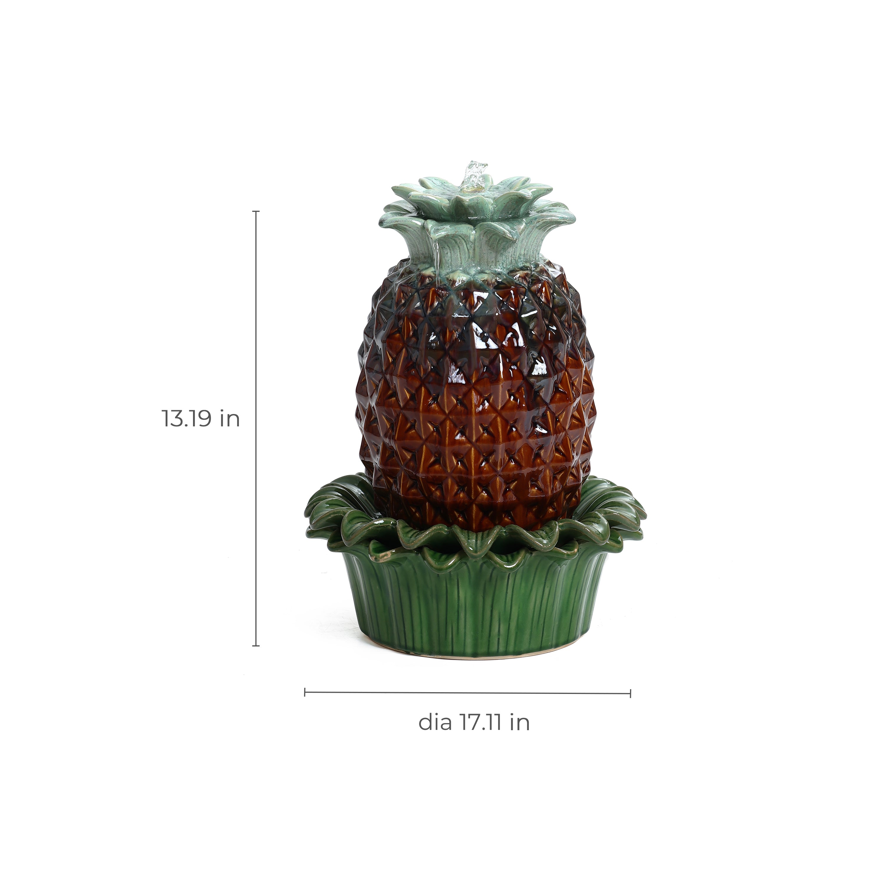 Add tropical charm to your home or patio with this ceramic water fountain featuring a vibrant green pineapple top. Crafted from high-quality glazed ceramic, this 17.1-inch tabletop fountain is ideal for both indoor and outdoor use. Water gently bubbles from the top, creating a relaxing sound that enhances any space. The compact size makes it perfect for tabletops, shelves, or garden corners, while the glossy finish offers timeless style. This ceramic water fountain is both decorative and functional—easy to set up, low maintenance, and built to last. Whether placed on a balcony or used as a playful accent in your entryway, it brings motion, sound, and a tropical aesthetic into your environment.