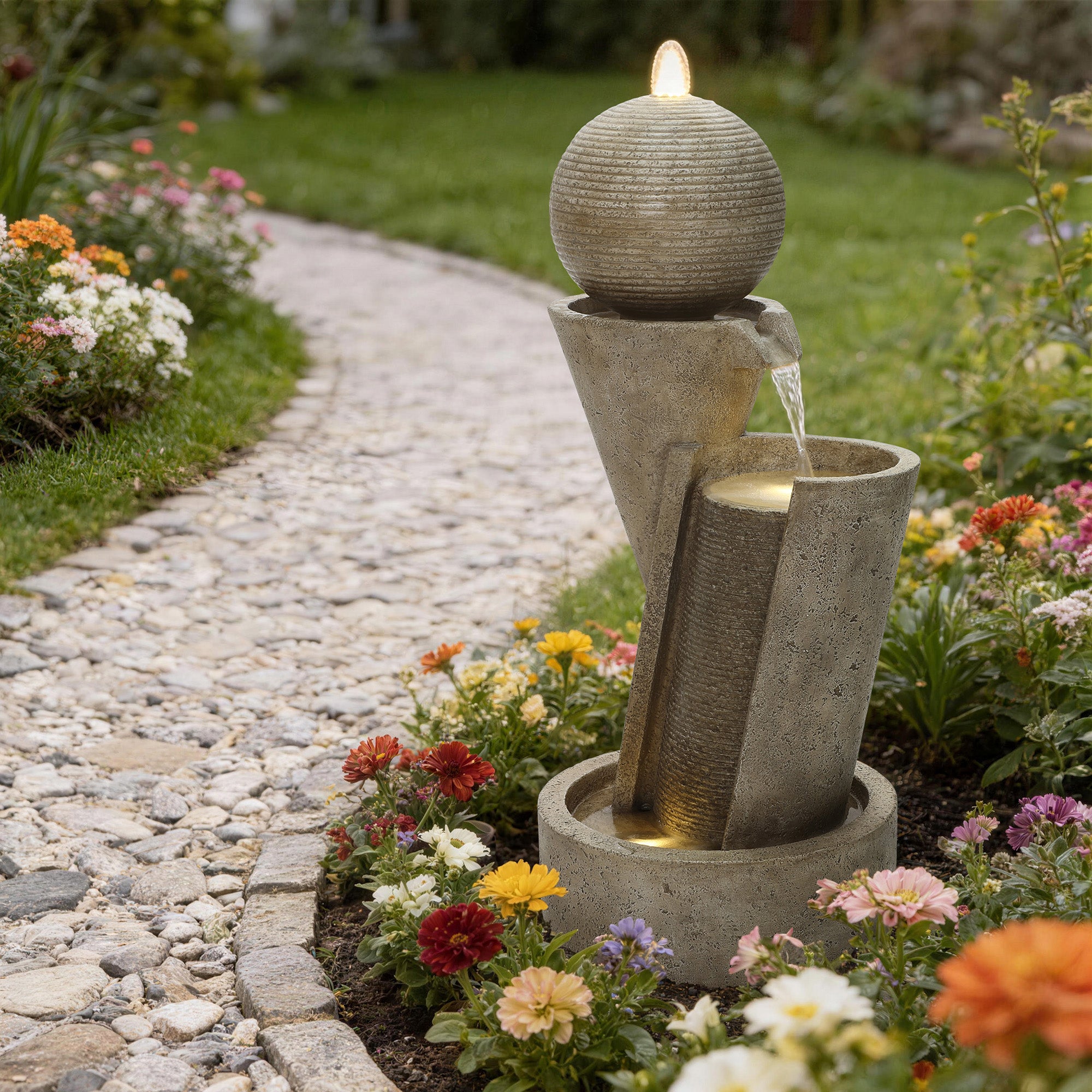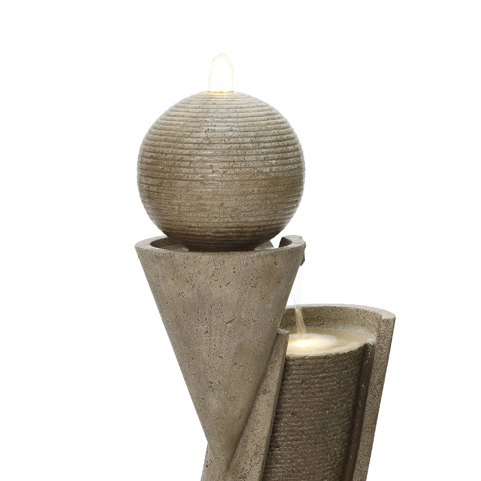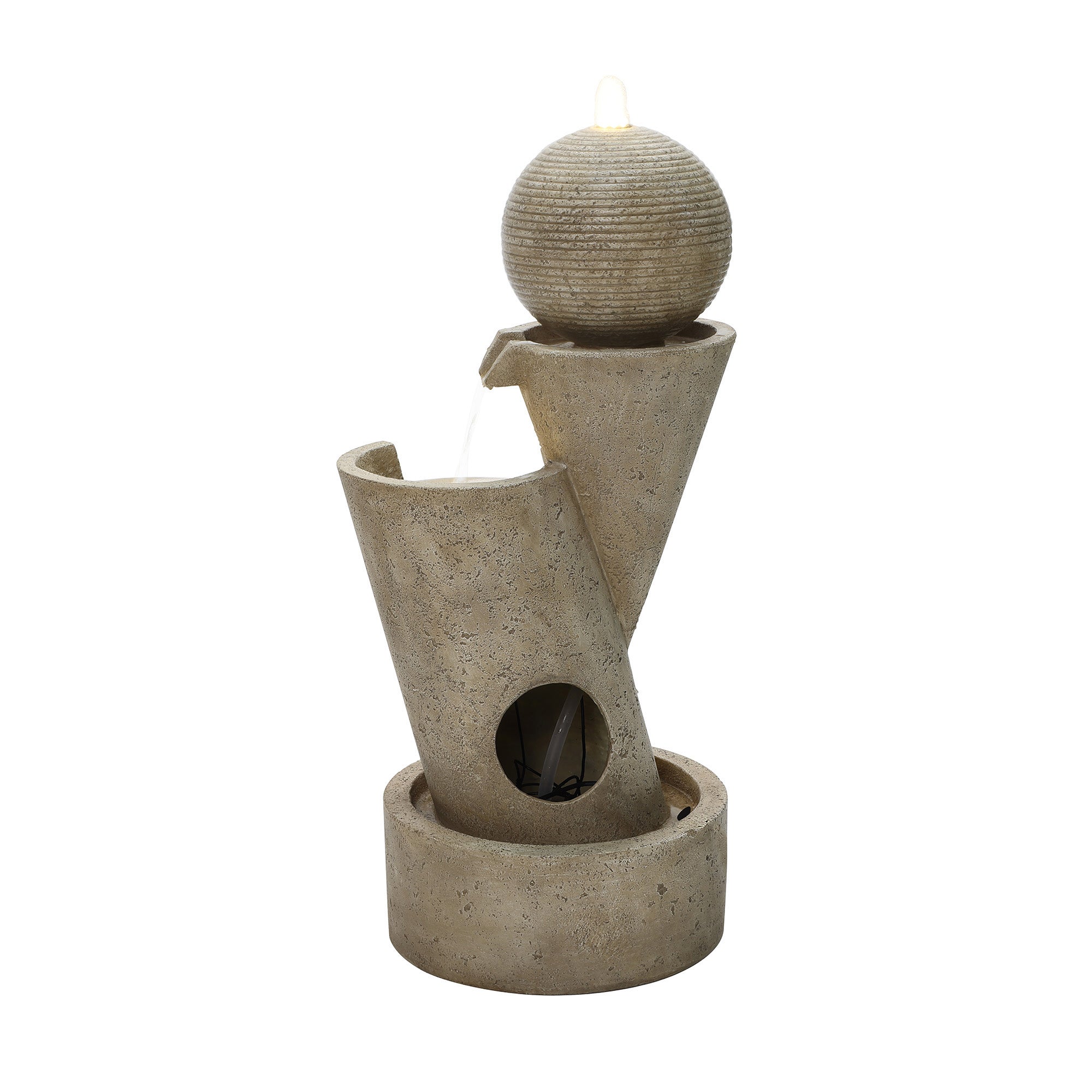 - Modern Sculptural Design: Geometric stacked form with sphere accent creates striking water fountain outdoor focal point.