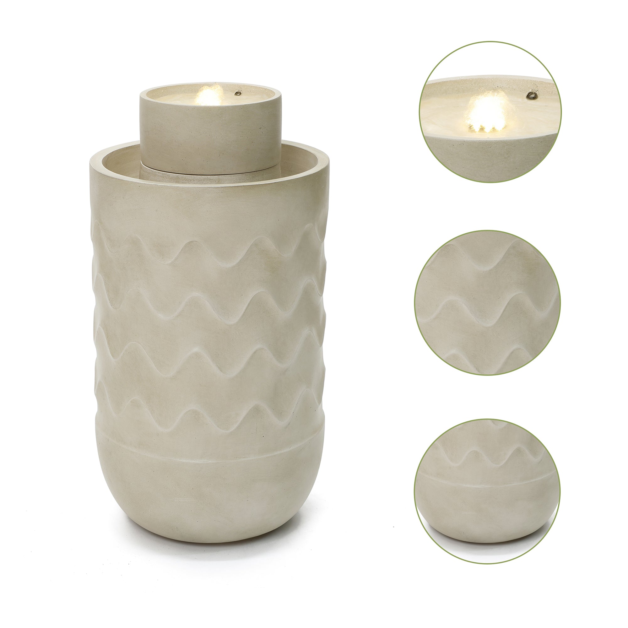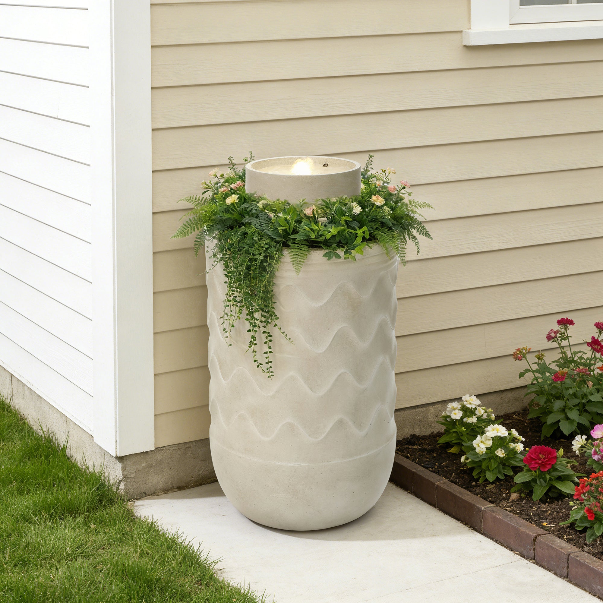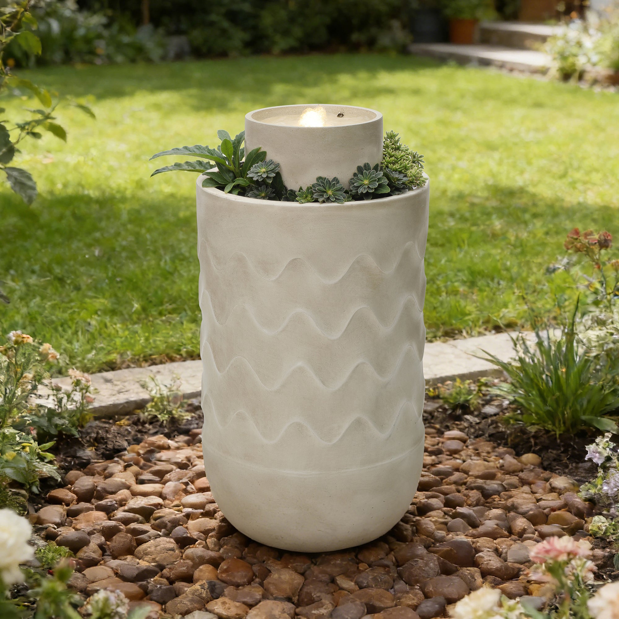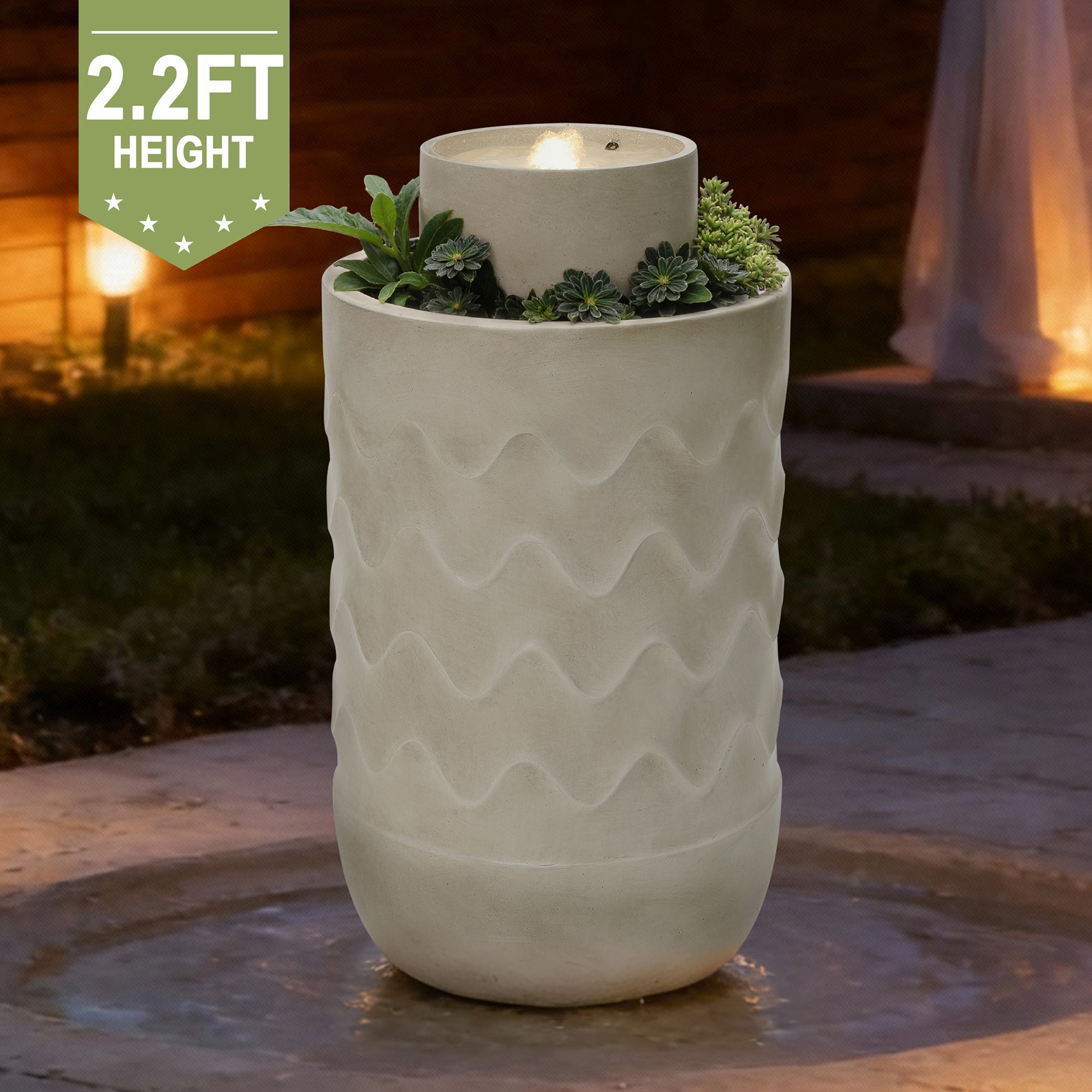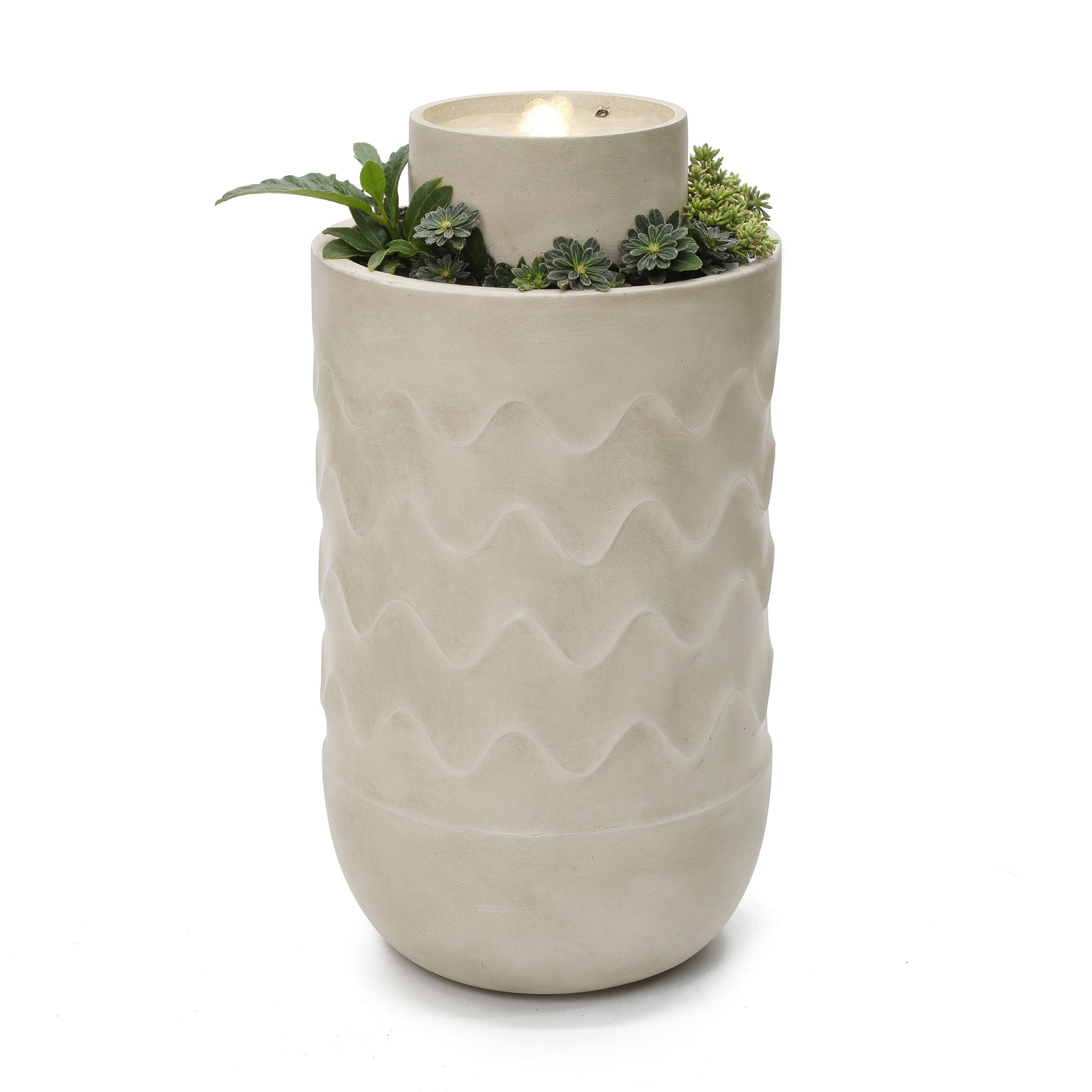 - Modern Sculptural Design: Cylindrical water fountain outdoor with textured wave pattern and integrated planter accent.
