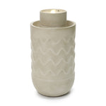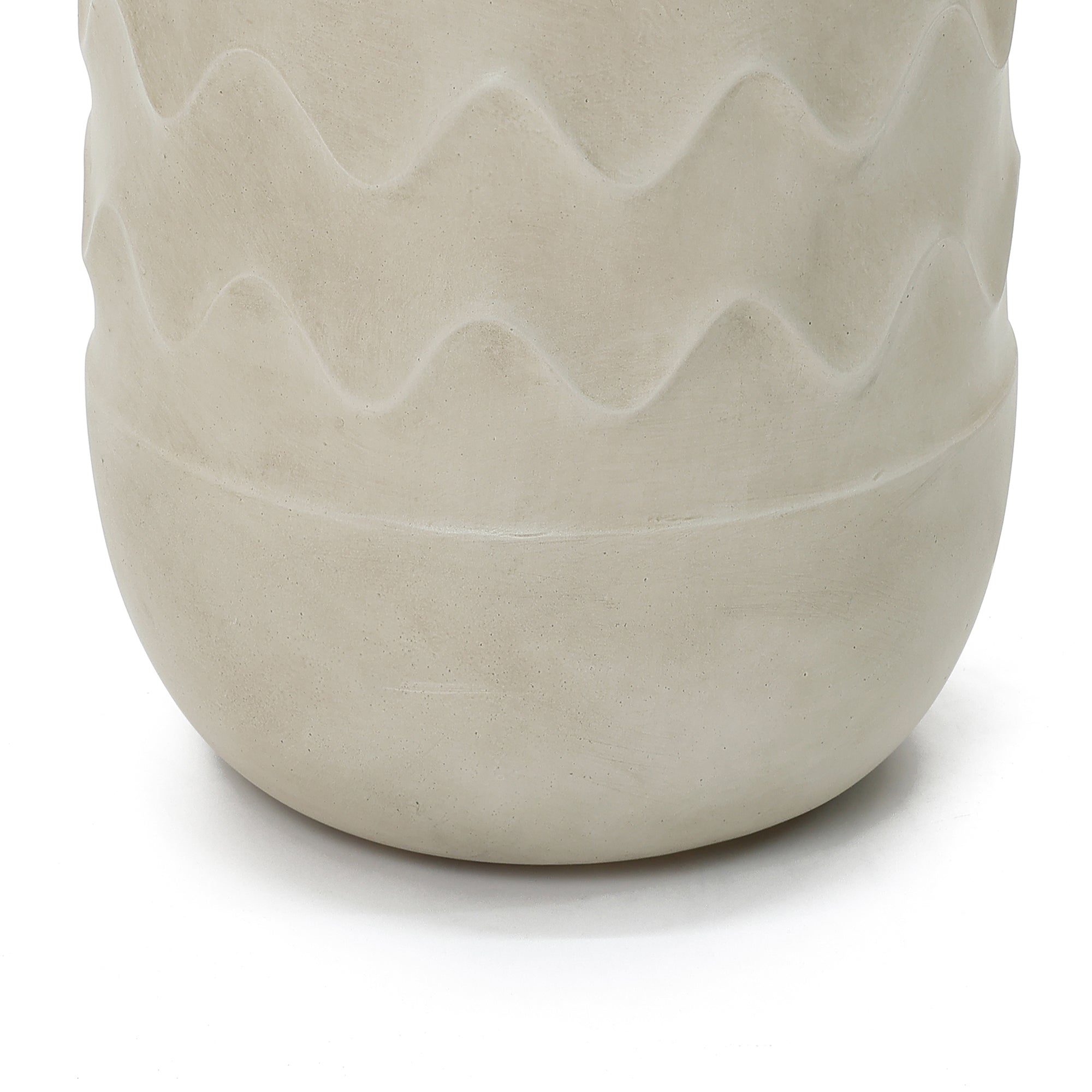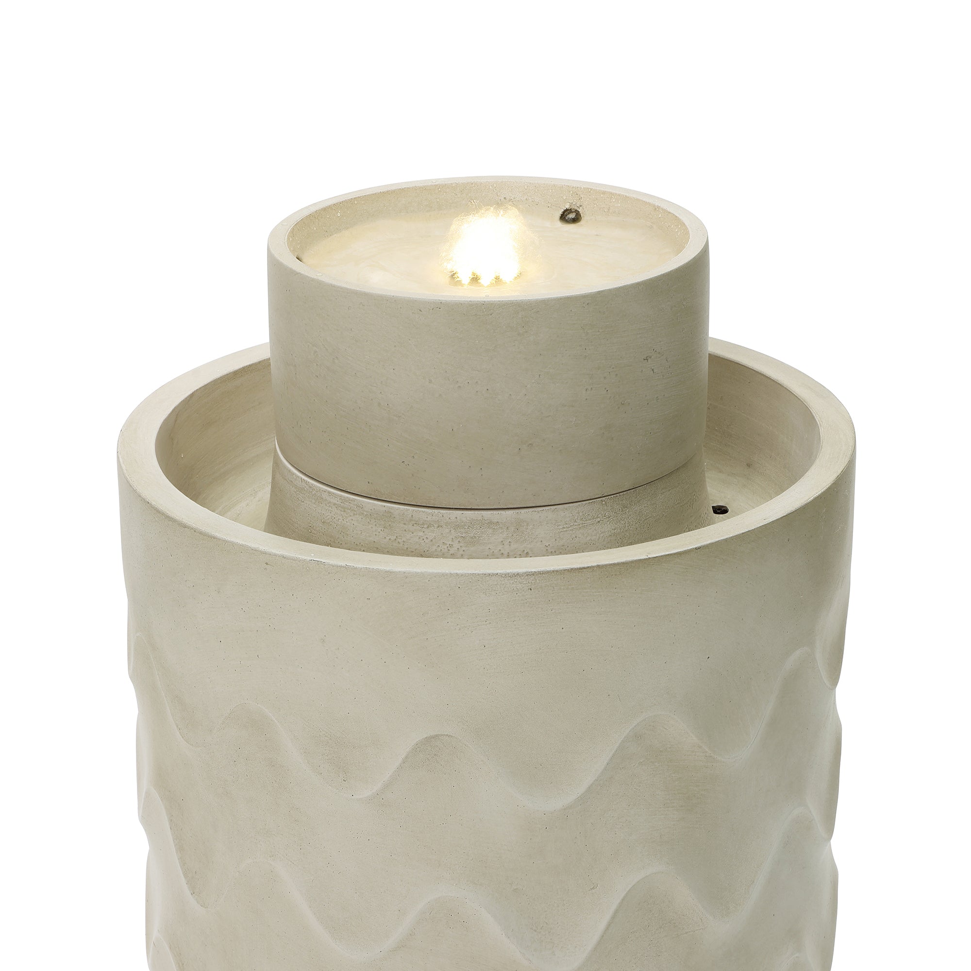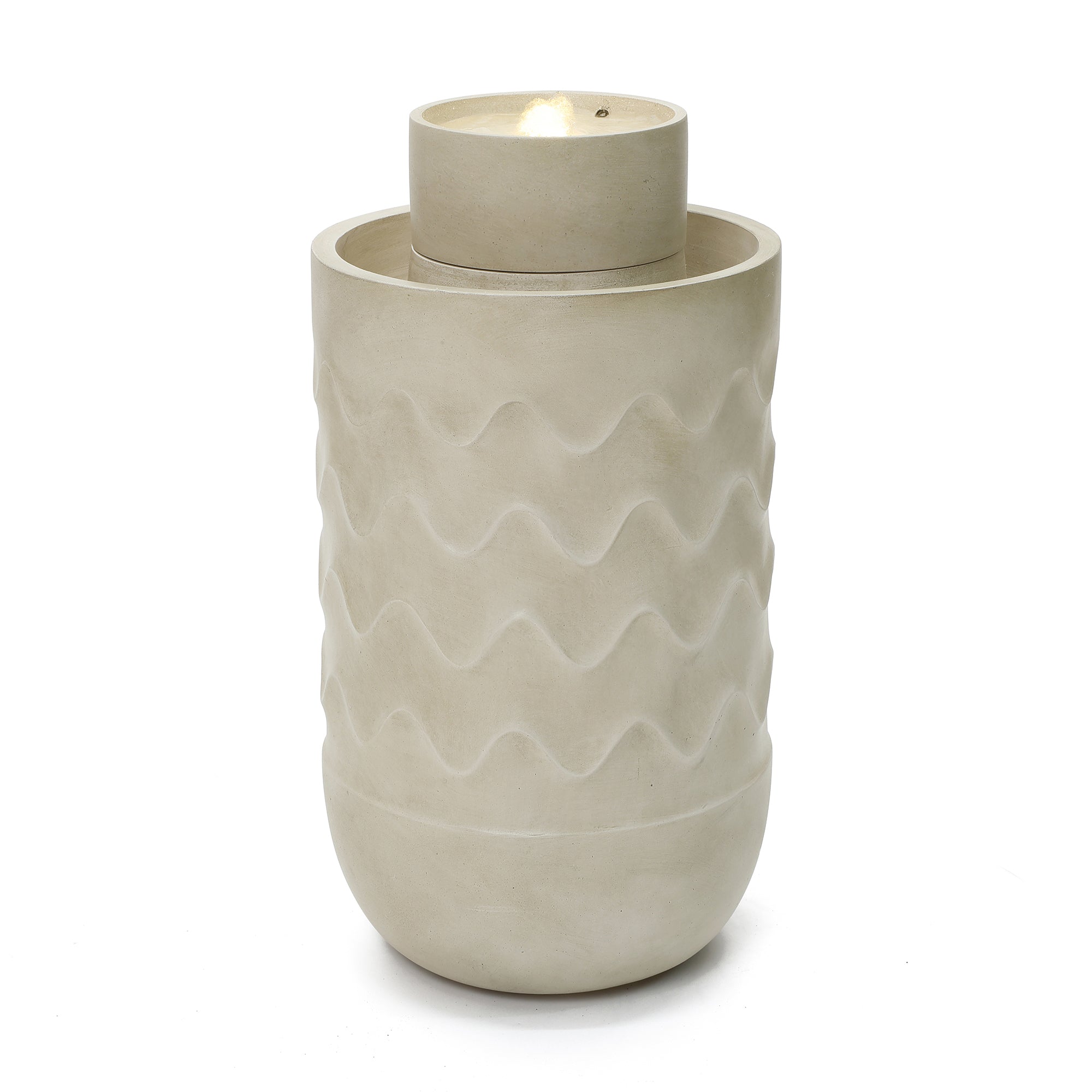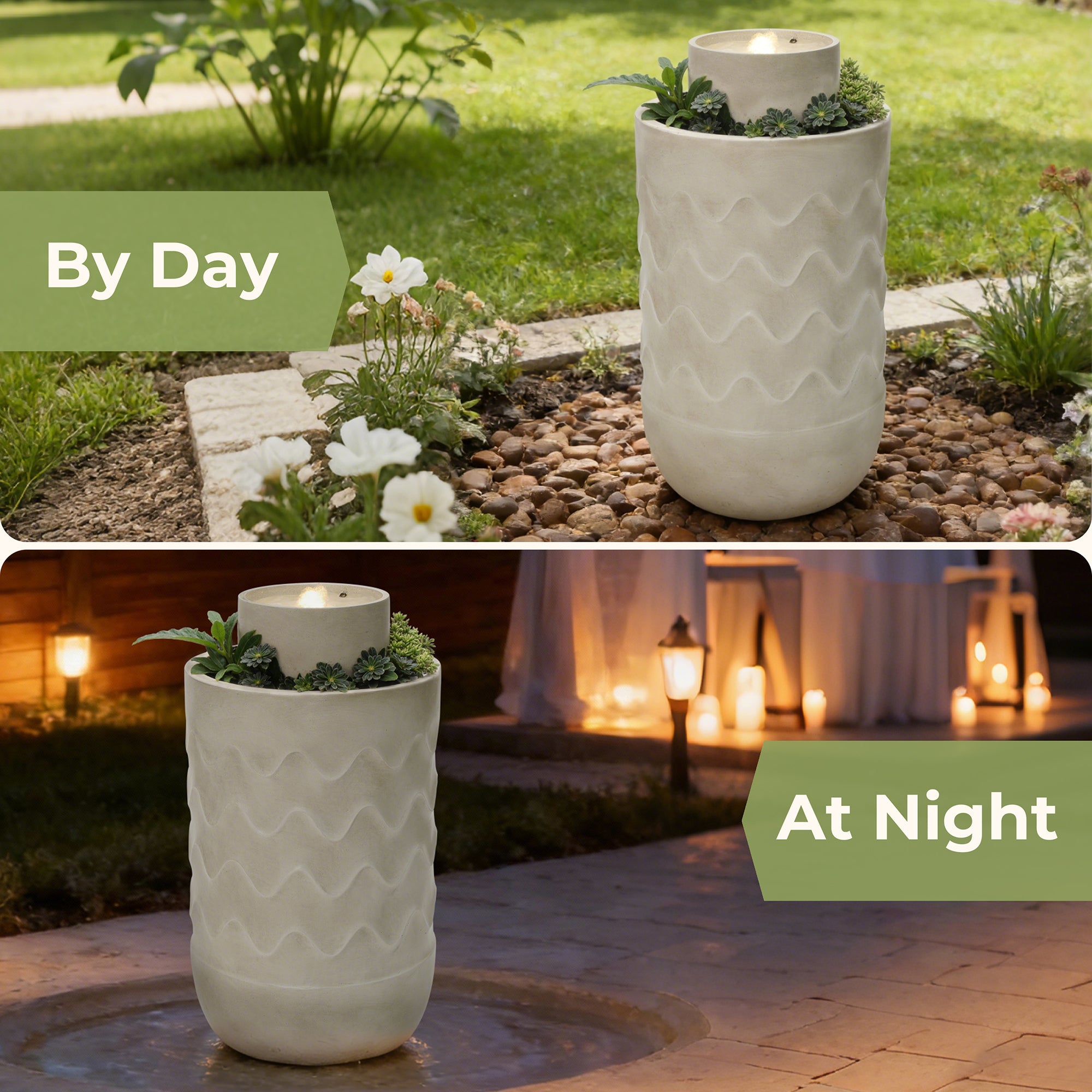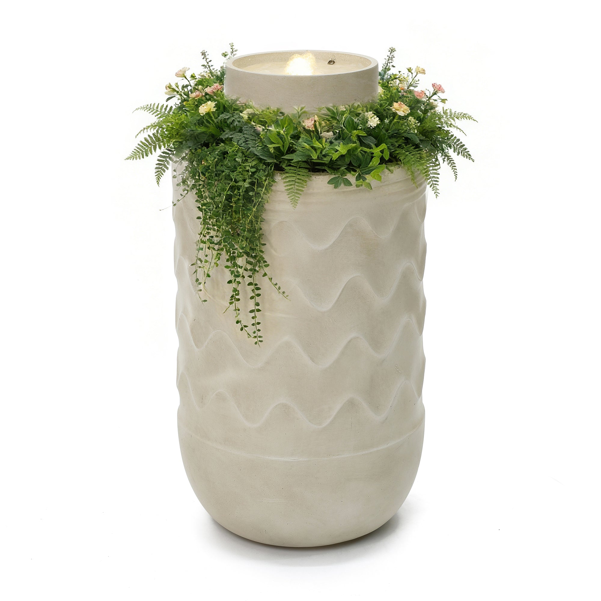 - Modern Sculptural Design: Cylindrical water fountain outdoor with textured wave pattern and integrated planter accent.