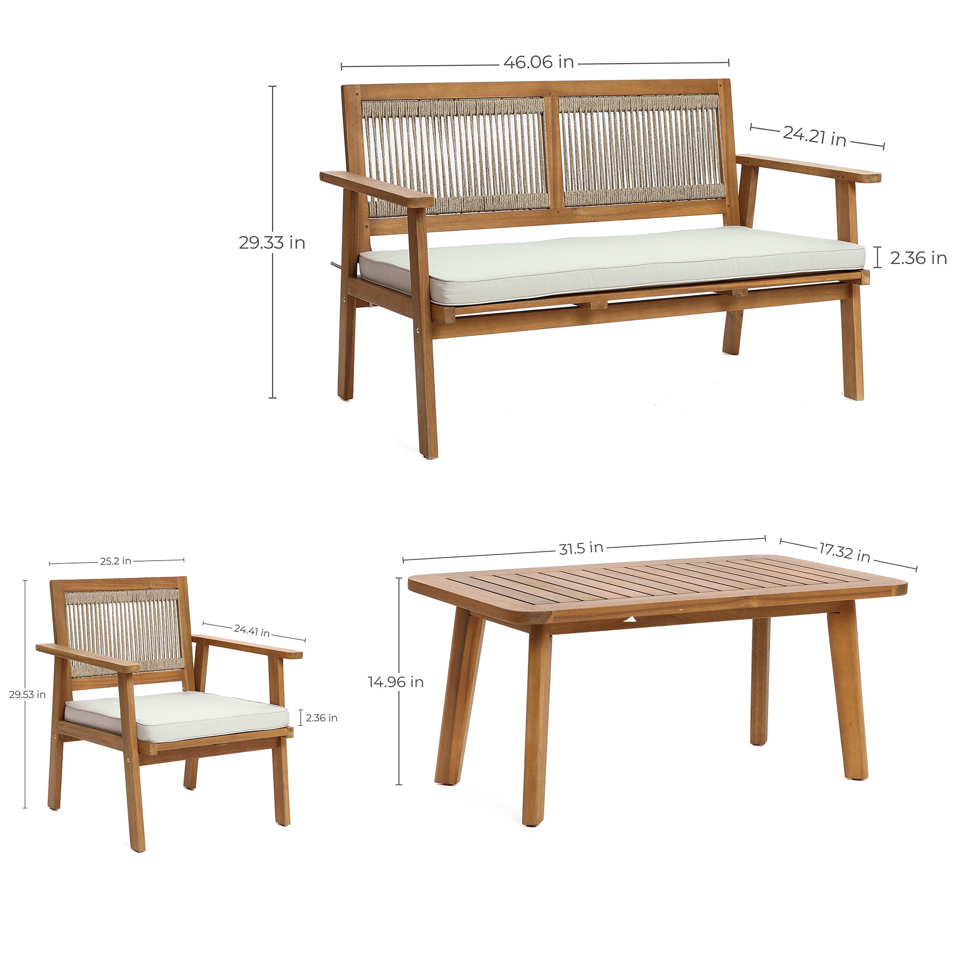 Tuscany outdoor acacia wood & rope conversation set, 2 armchairs, 1 coffee table, 1 loveseat