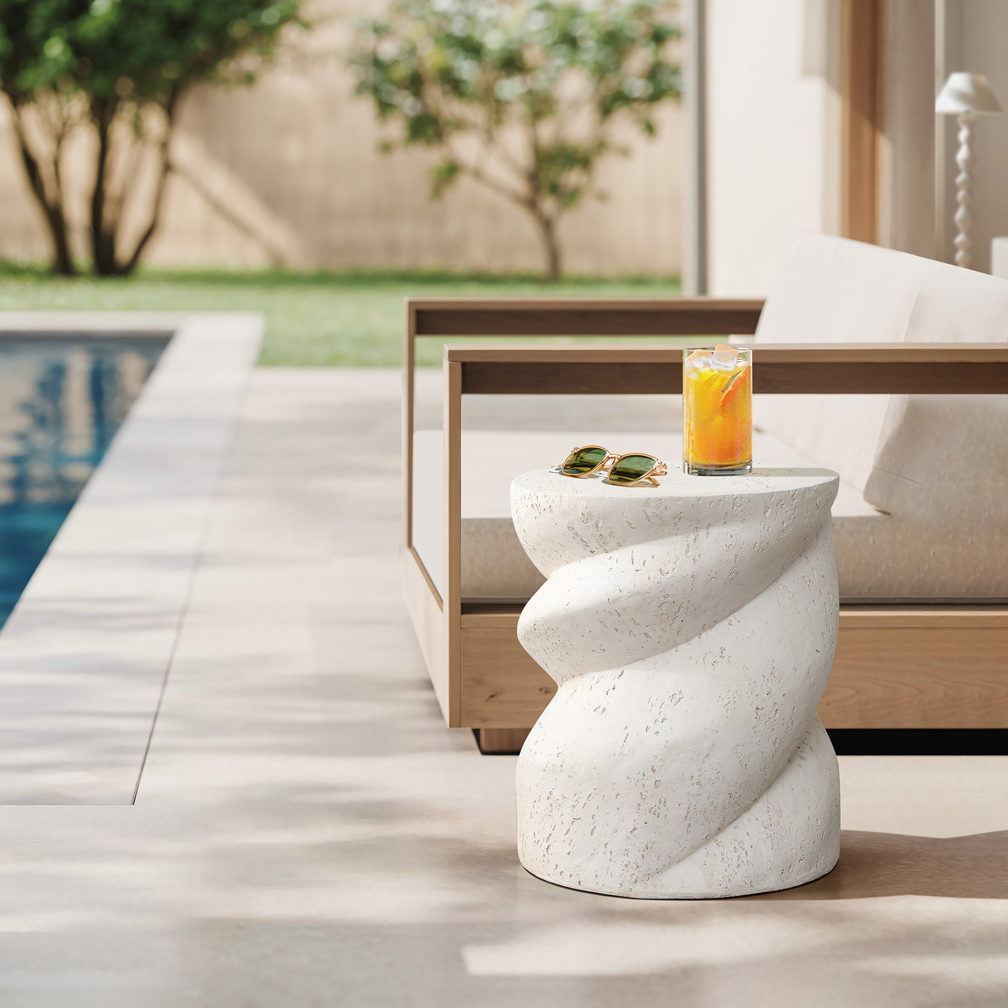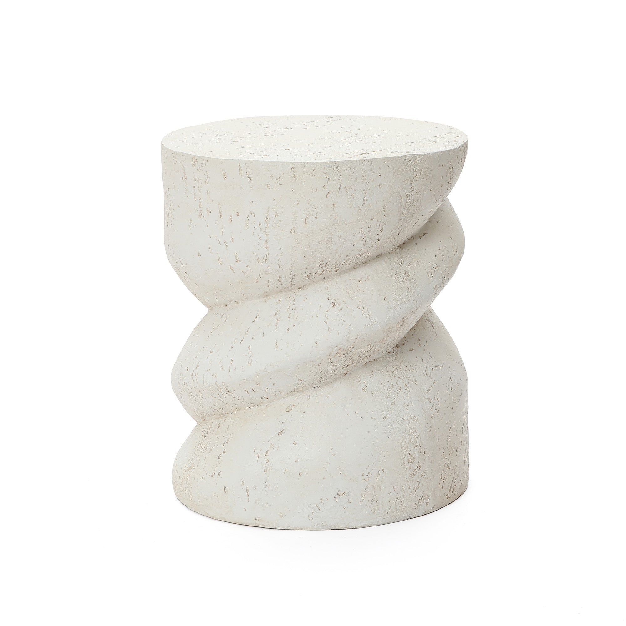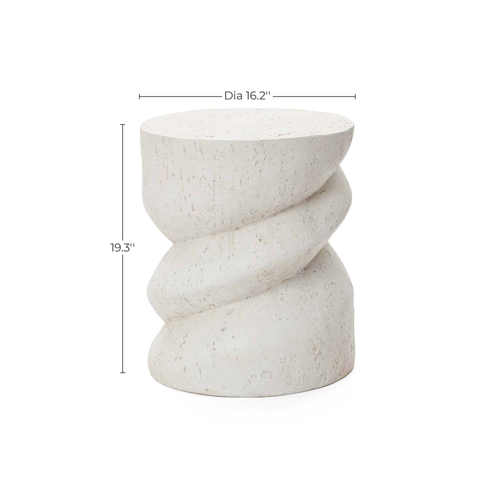 Add a sculptural touch to your patio with this outdoor patio side table, featuring a unique spiral silhouette and antique white finish. Combines artistic design with functional use.