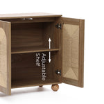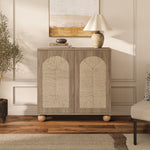 - Minimal Japandi: Japandi-style cabinet with natural wood finish, arched rope-woven doors, and pine ball legs.