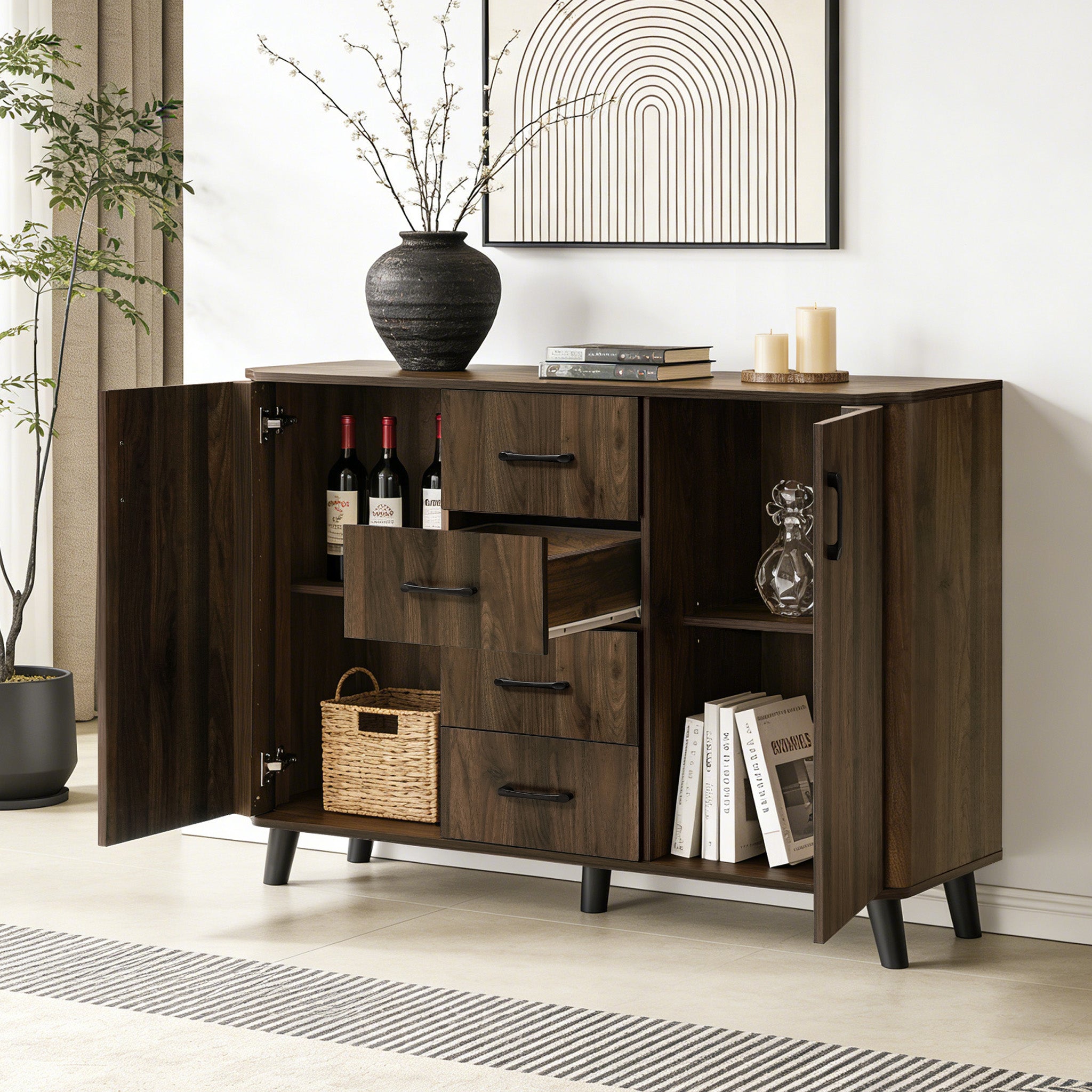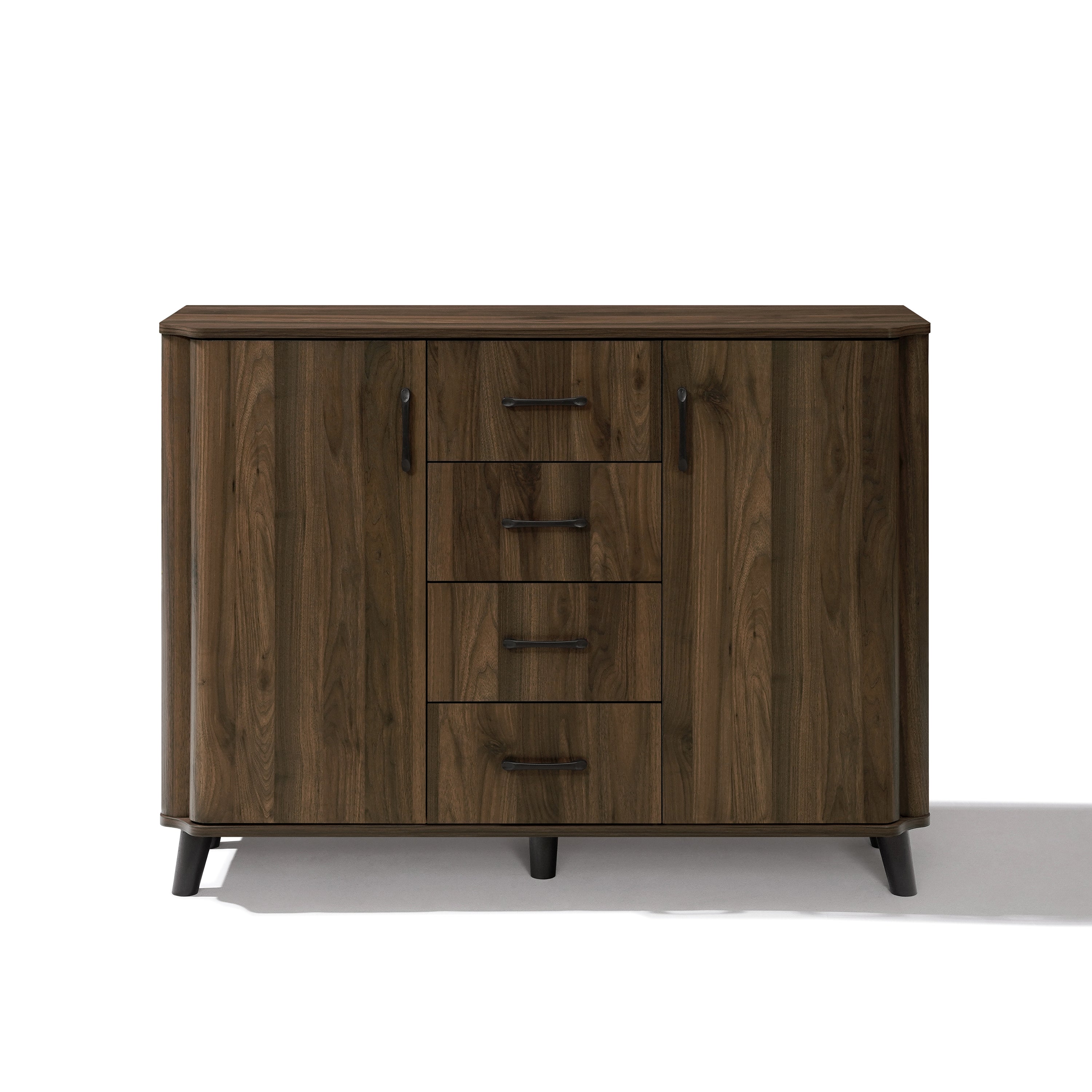 With double doors, adjustable shelves, and four spacious drawers, provides ample storage. Crafted from durable engineered wood with a walnut veneer, features sleek plastic handles and tapered legs for sturdy support.