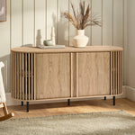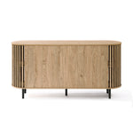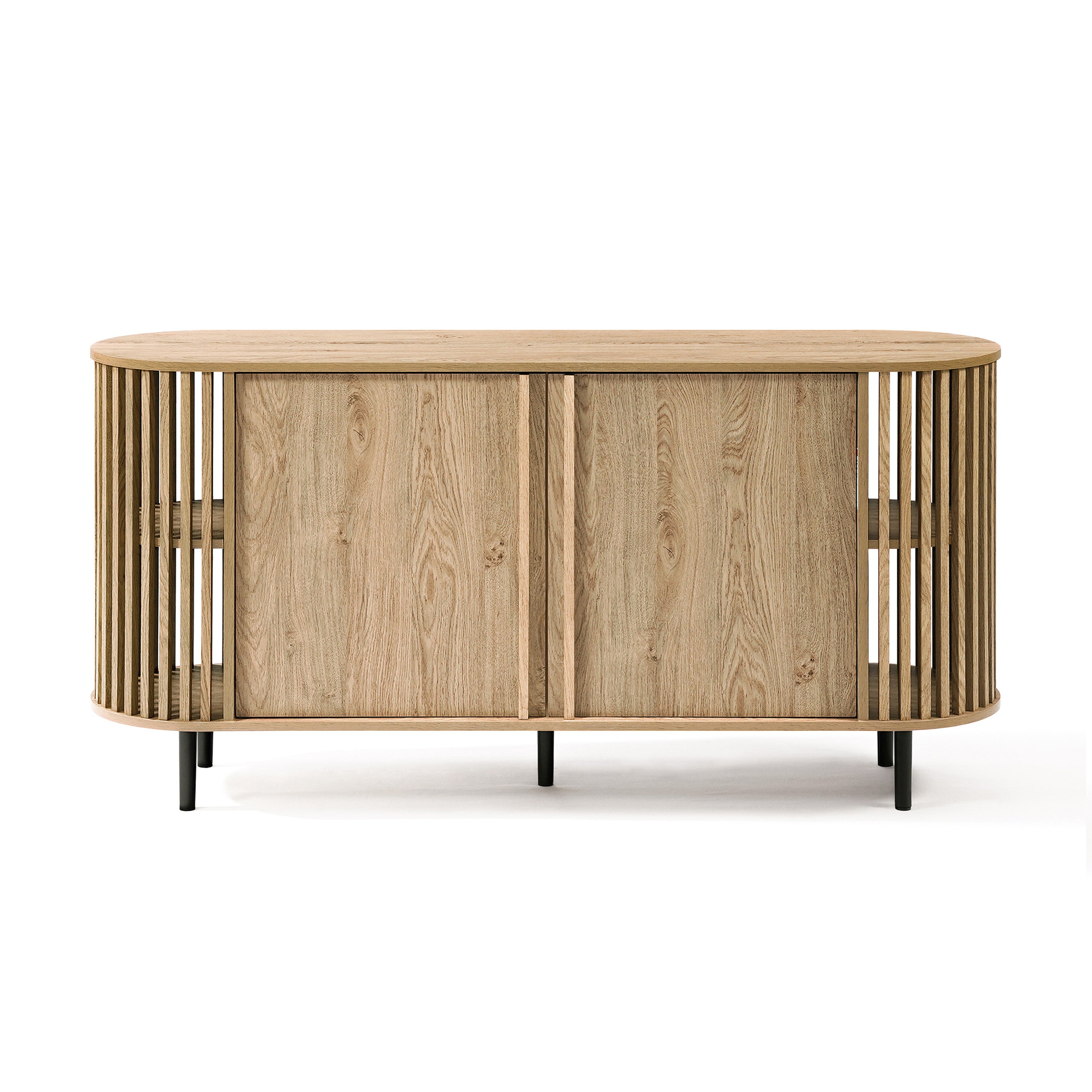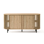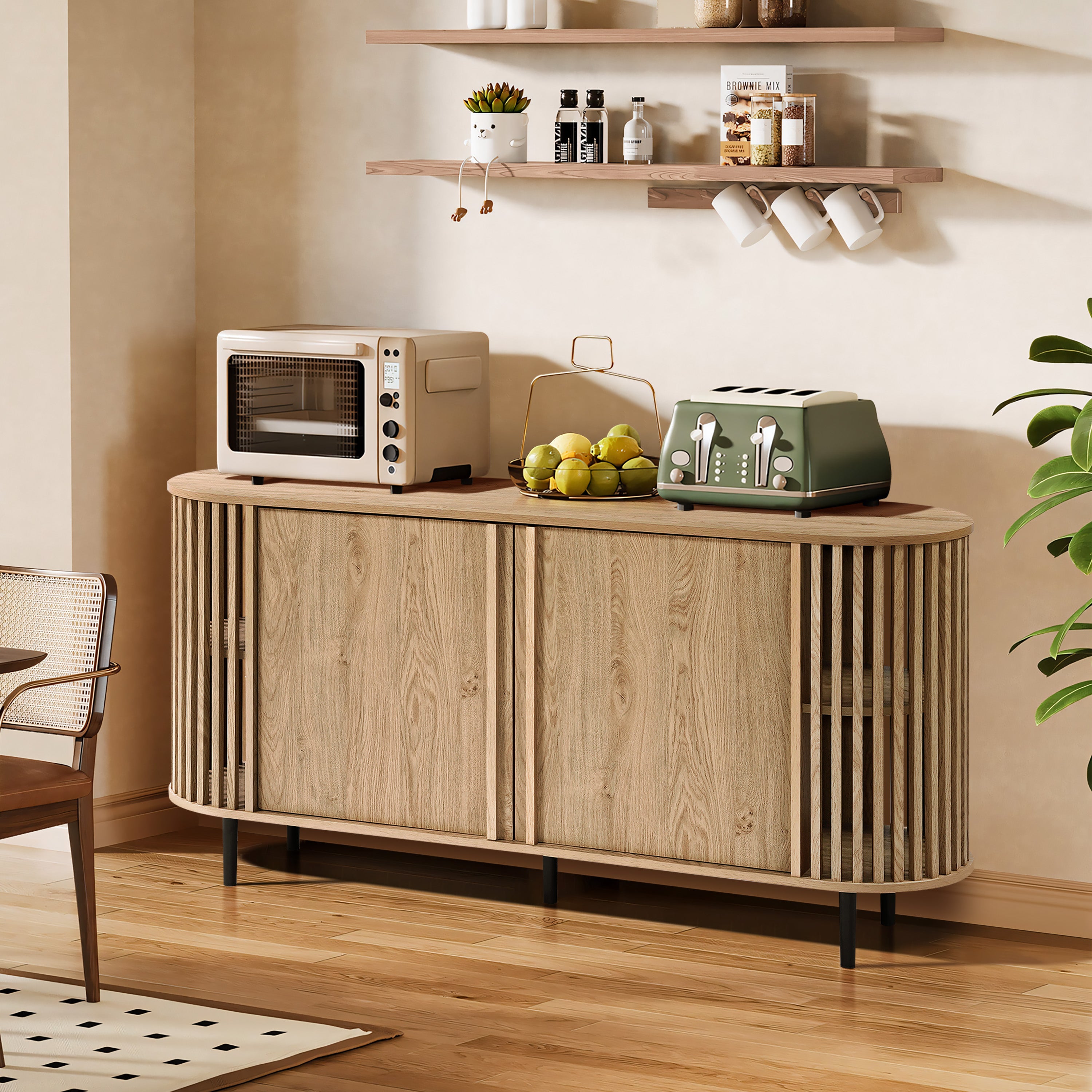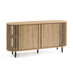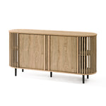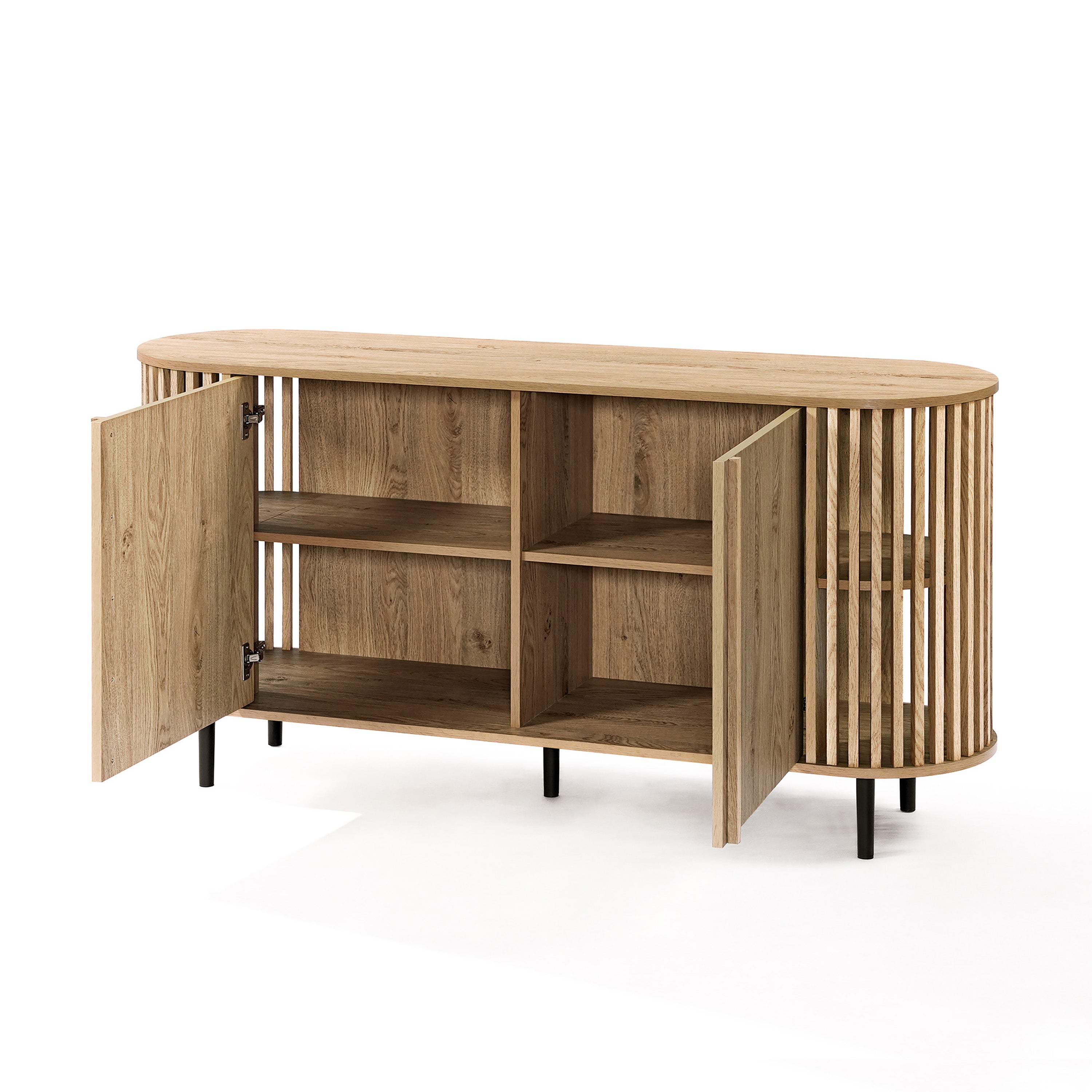 Enhance your home with the perfect combination of utility and aesthetics through this mid-century modern-style buffet cabinet. Crafted from high-quality manufactured wood with an oak wood grain finish, this cabinet not only offers sturdiness and durability but also adds a touch of natural beauty to your space. The buffet cabinet features two doors, two layers of storage space, and four compartments, providing ample options for organizing various items. The vertical bar grid design on both sides enhances visual transparency while adding a unique style to the cabinet. Supported by sleek black metal legs, it ensures stable support and contributes a modern touch to the overall design. Versatile in function, this decorative cabinet can serve as a storage unit or console in the living room, a sideboard buffet in the dining room or kitchen, a floor storage cabinet in the office, an entryway cabinet in the hallway, or even as a coffee bar cabinet. Its design allows it to seamlessly blend into any room, adding an elegantly natural charm to your home.