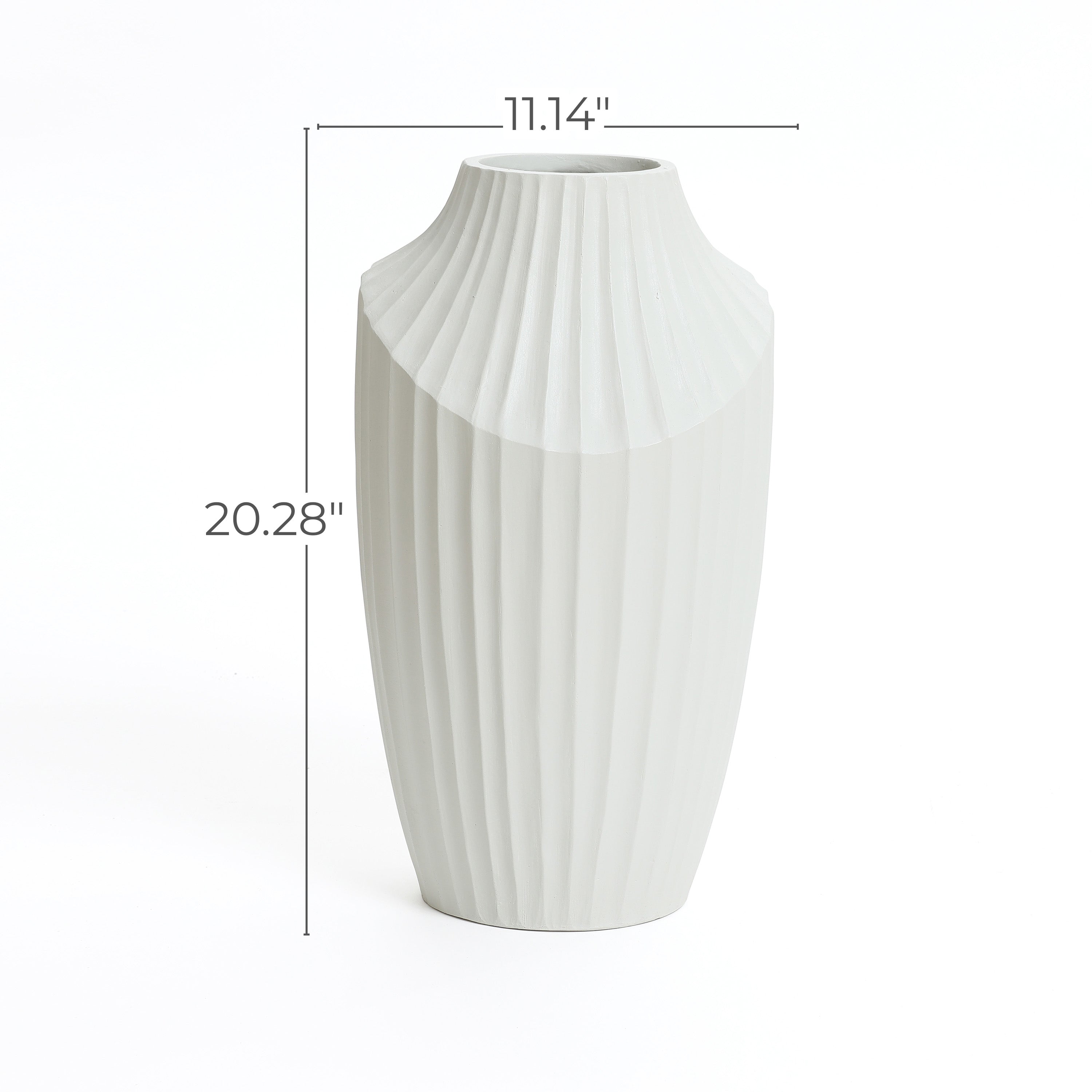 A white vase with a ribbed texture, resembling a modern abstract sculpture, stands elegantly against a plain background. Perfect as a decorative piece, its dimensions are marked: 20.28 inches tall and 11.14 inches wide, making it ideal for contemporary home decor.