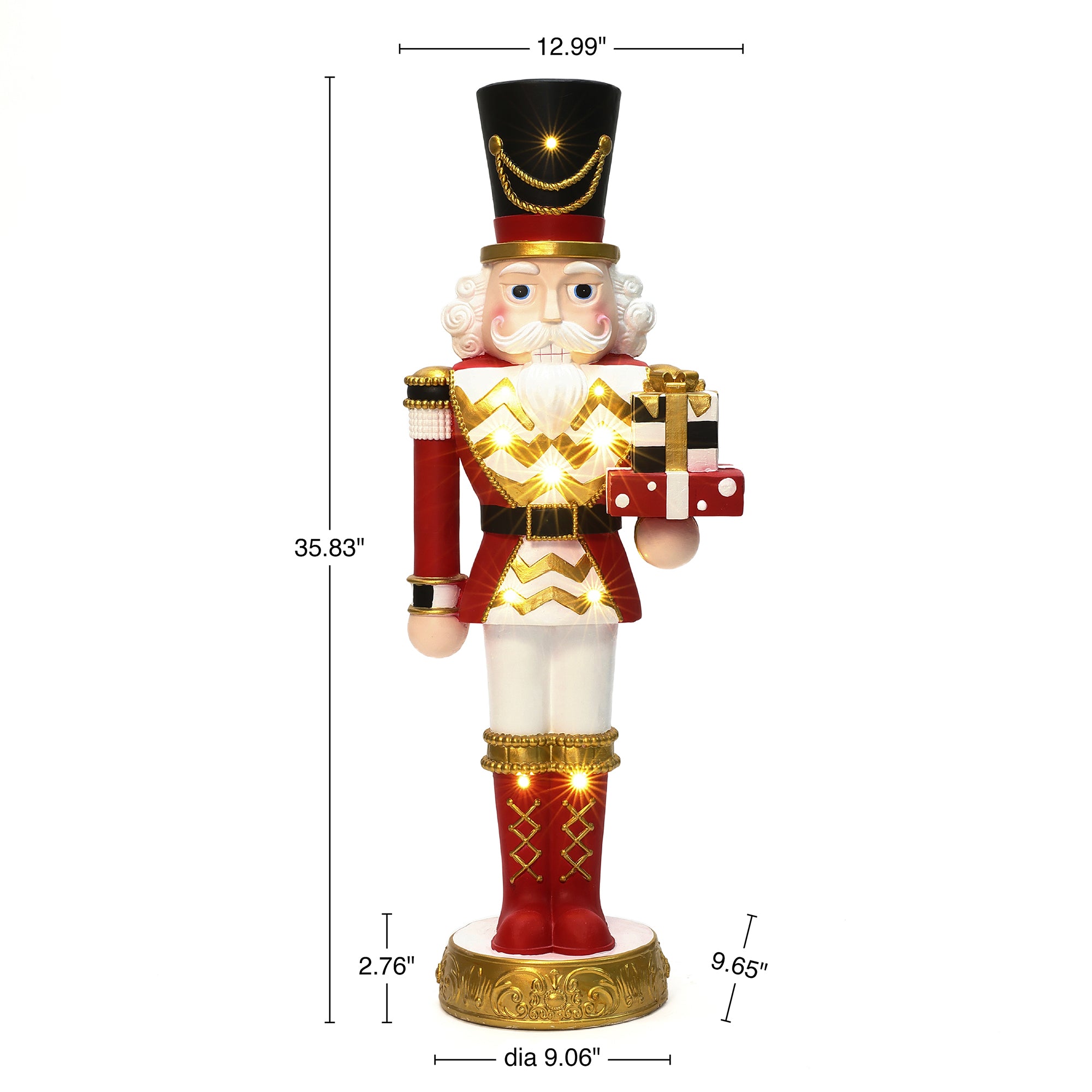 This 3ft Nutcracker Red Soldier adds a festive touch to your holiday décor with red, gold, white colors. Holding a gift box that symbolizes the joy of the season , perfect holiday figurine to brighten your space.