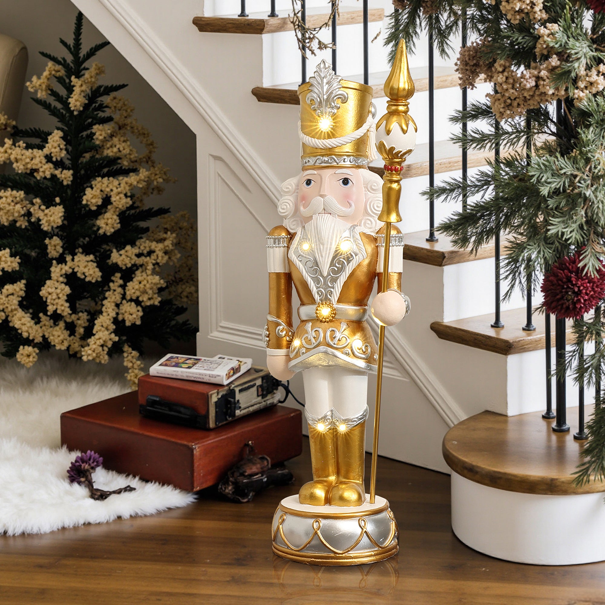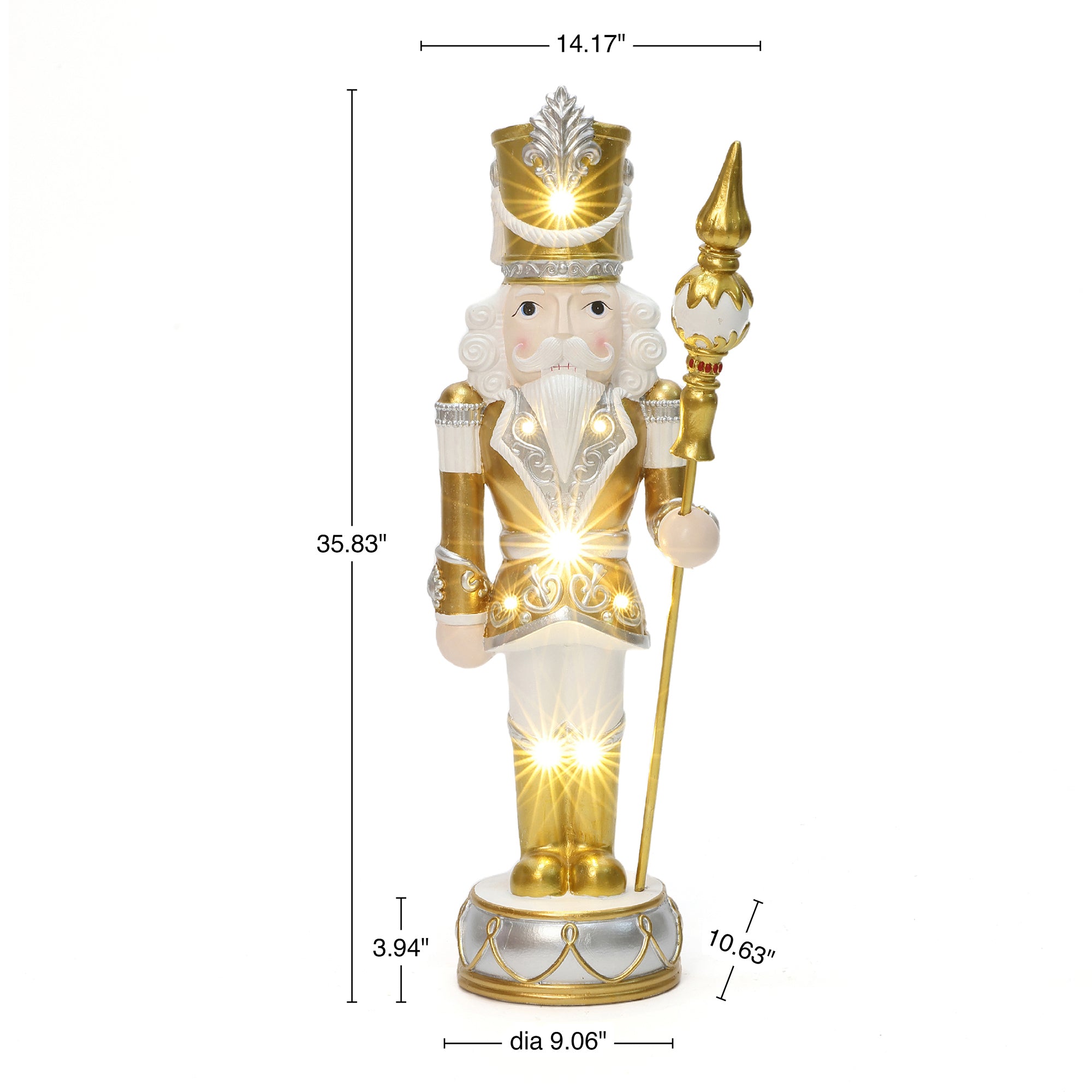 Standing at 35.83" tall, this soldier offers a refined, glittering finish.Crafted with meticulous detail, features gleaming silver,gold uniform adorned with intricate scrollwork. The built-in warm LED lights create cozy vibe, the durable MgO construction ensures stability ,long-lasting charm. Battery-powered for easy placemen.