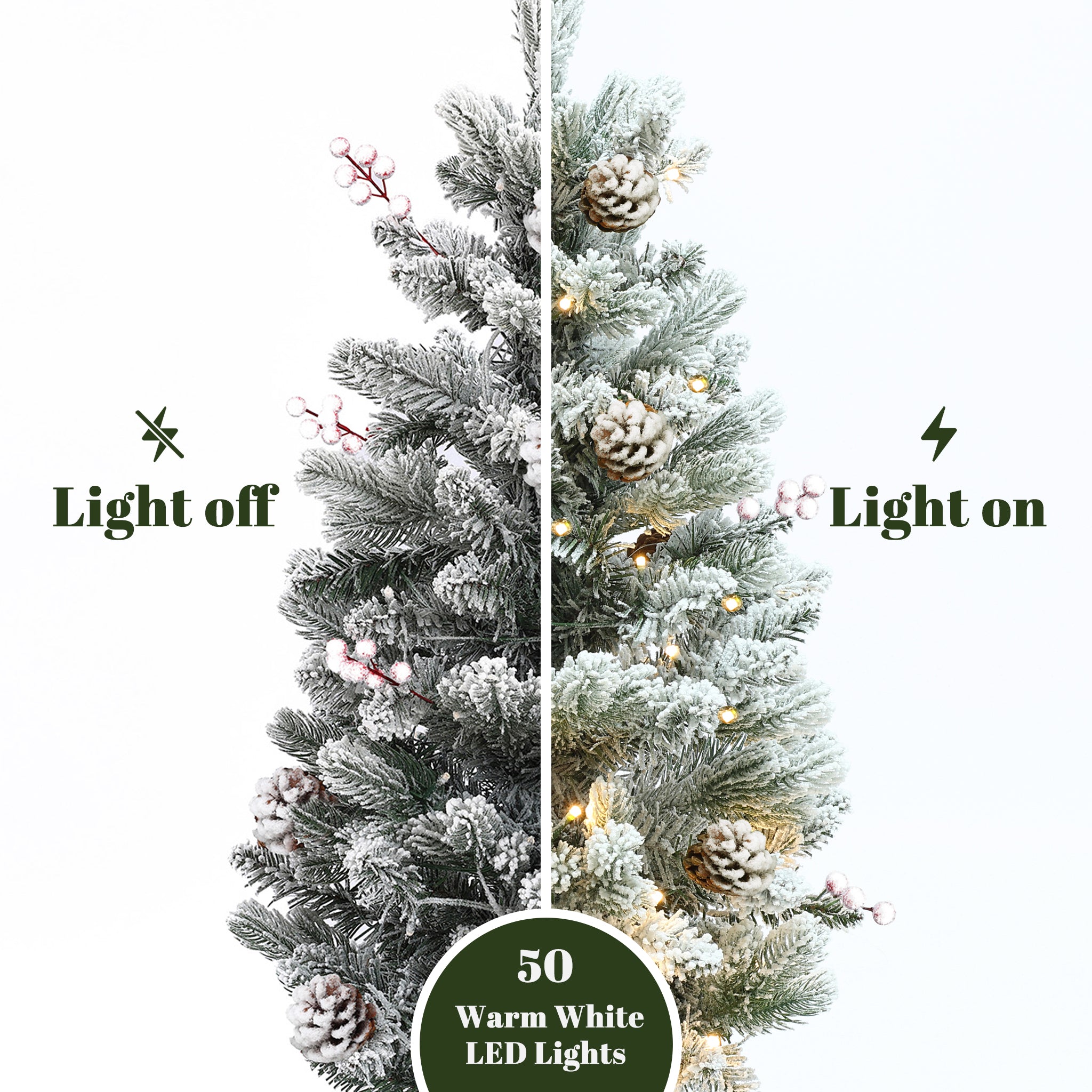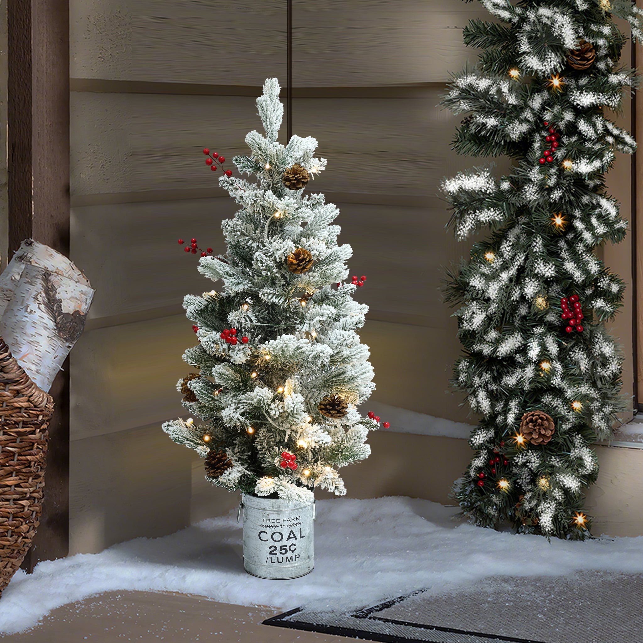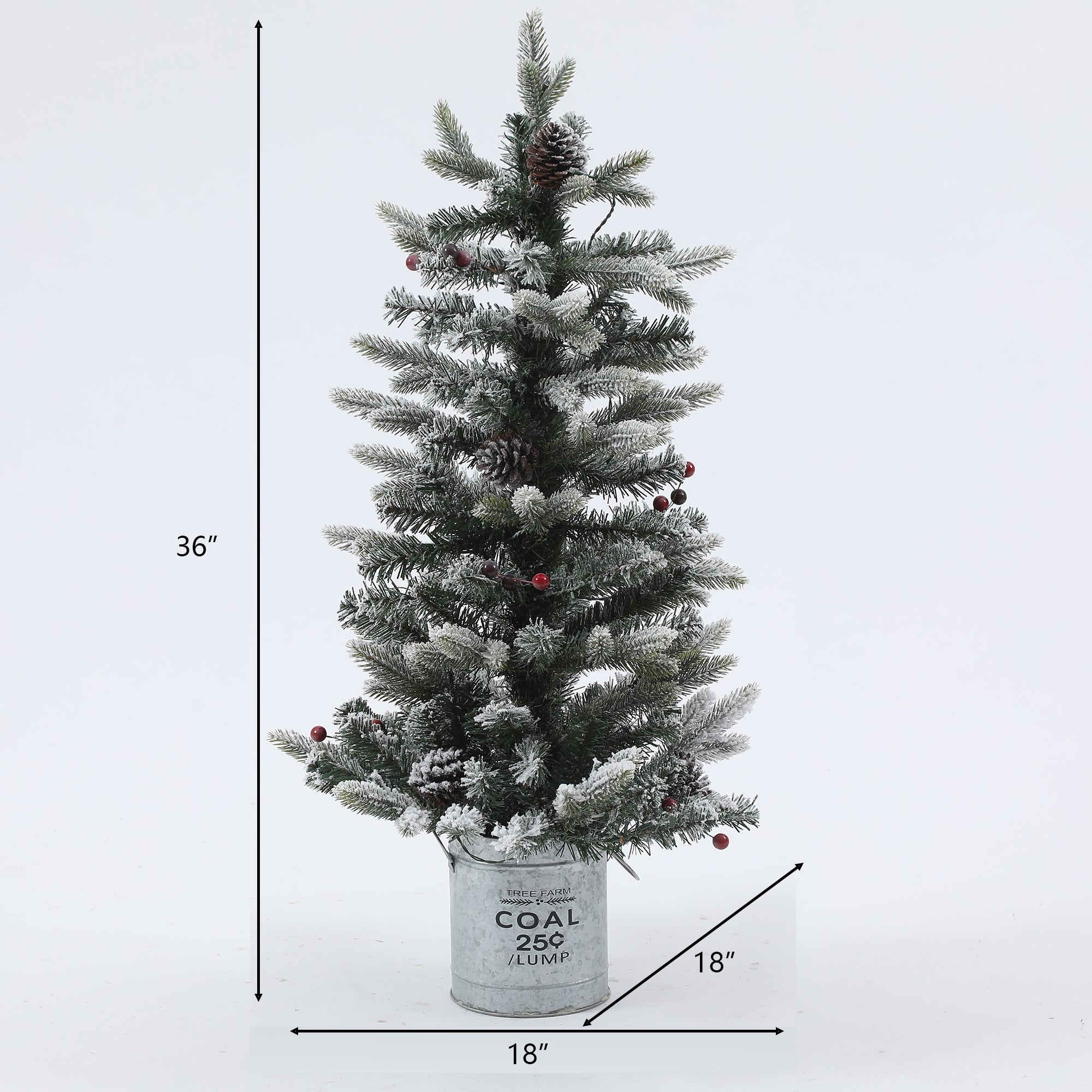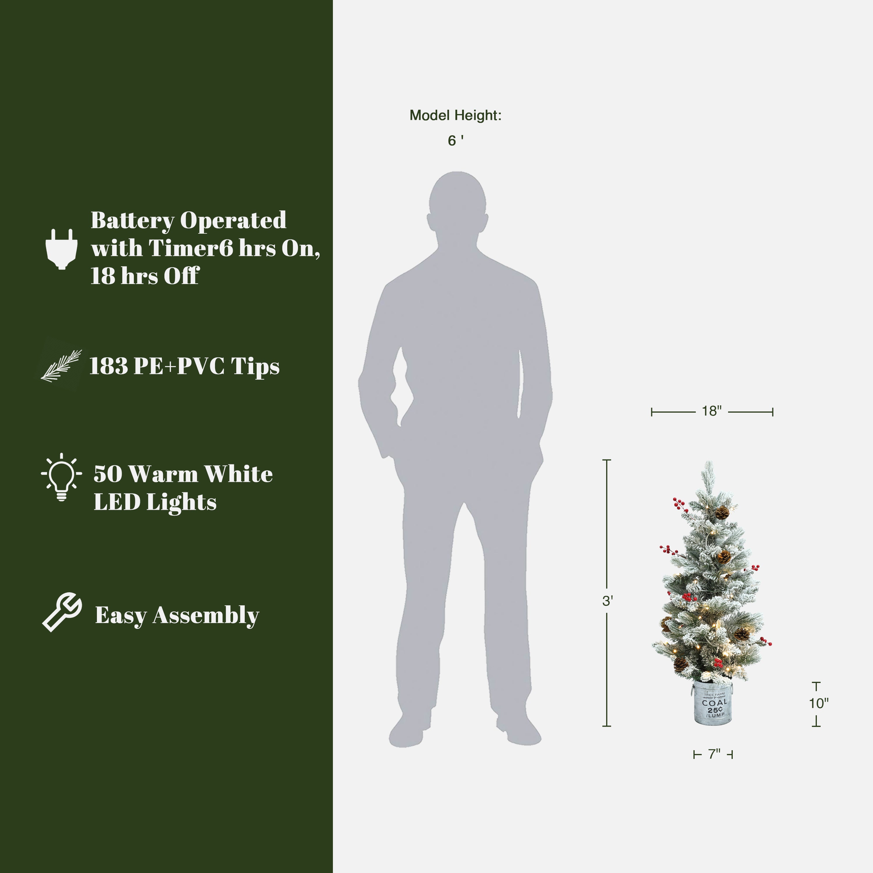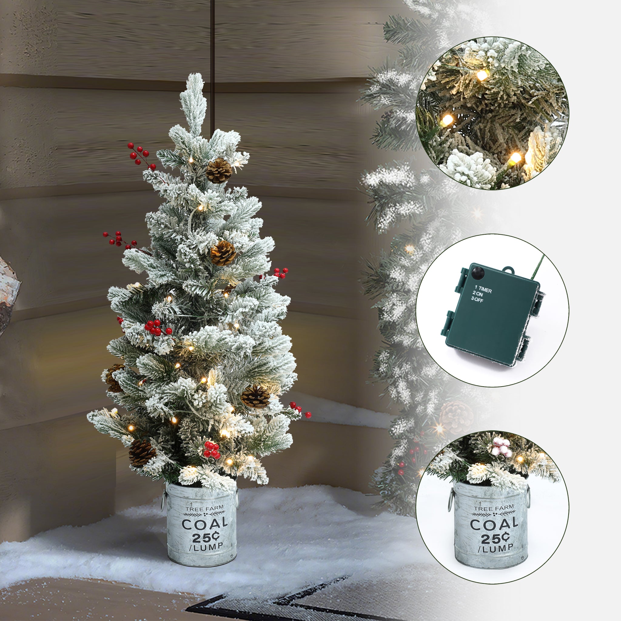 3Ft Pre-Lit Artificial Flocked Pine Christmas Tree with Pine Cones, Berries, and Metal Pot