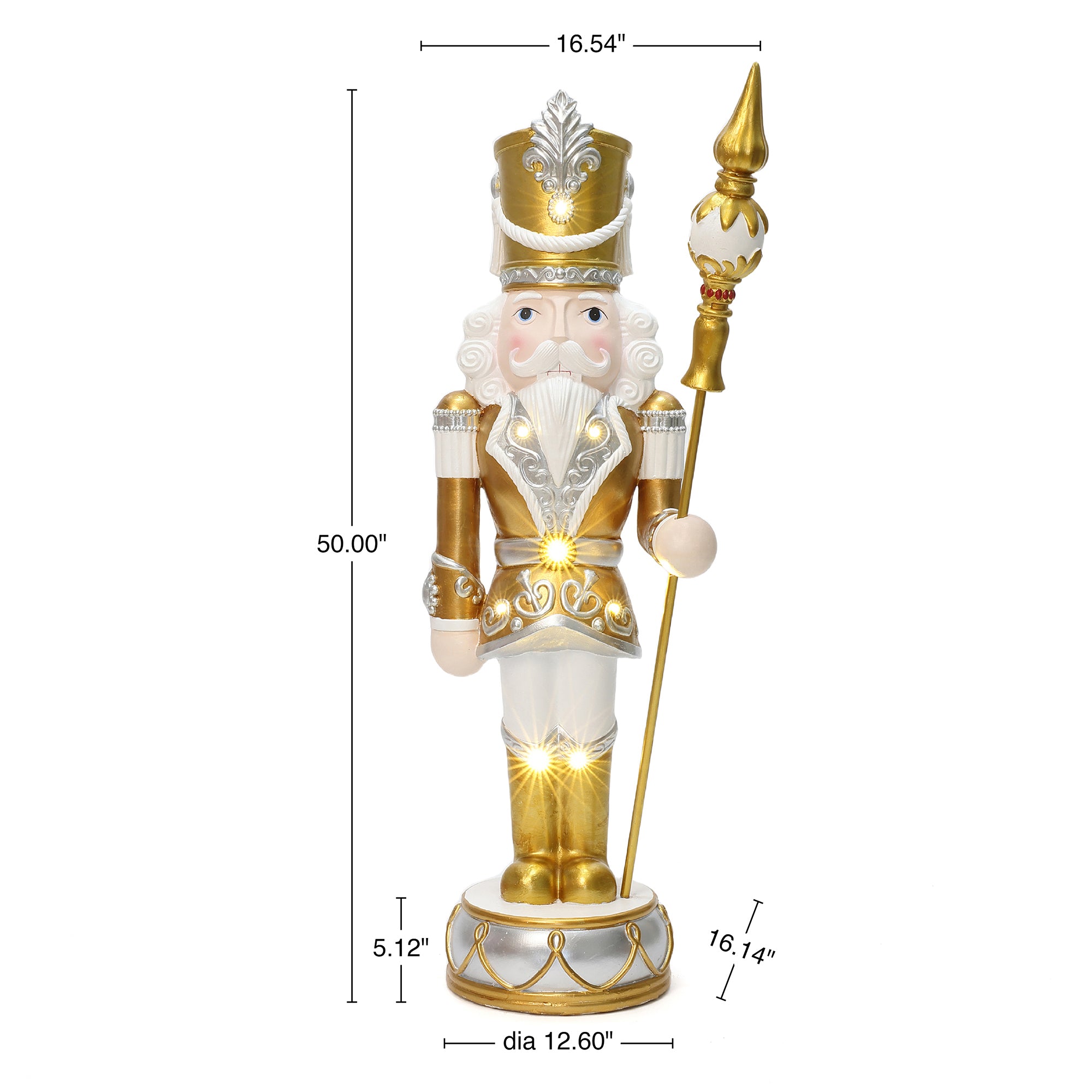 Standing at 50" tall, this soldier offers a refined, glittering finish.Crafted with meticulous detail, features gleaming silver,gold uniform adorned with intricate scrollwork. The built-in warm LED lights create cozy vibe, the durable MgO construction ensures stability ,long-lasting charm. Battery-powered for easy placemen.