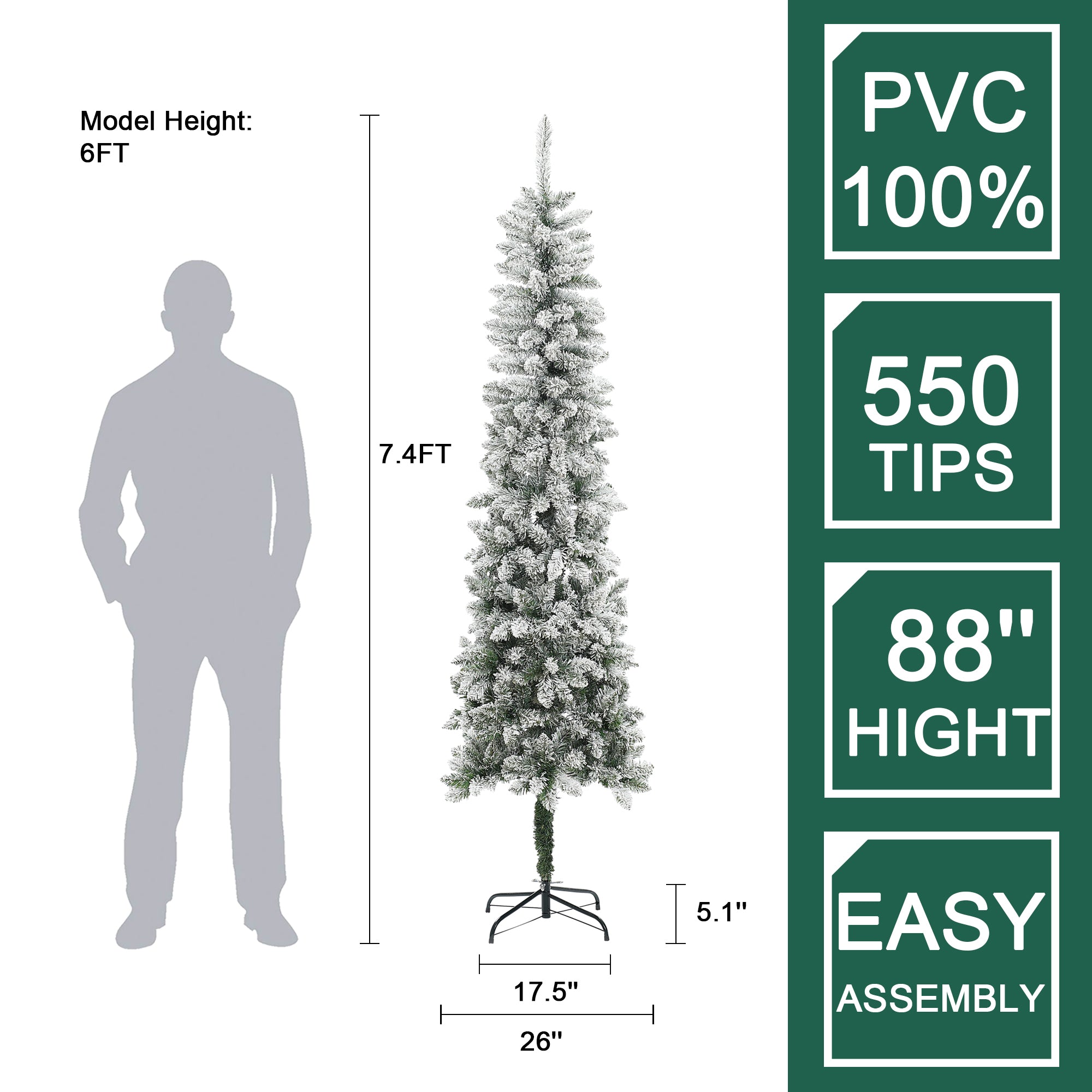 Create a festive atmosphere in your home with the slim artificial Christmas tree, blending the charm of freshly fallen snow with the convenience of an artificial tree. Made from high-quality PVC flocked branch tips, this 7.4ft tree boasts strong and sturdy branches that can support garlands and all your favorite ornaments to achieve a personalized look. The slim pencil design of this tree is perfect for your living room, office, or classroom, adding a touch of delicate beauty and warmth to your space. Your family and guests will cherish the unforgettable memories of a winter wonderland right in your own home this holiday season.
