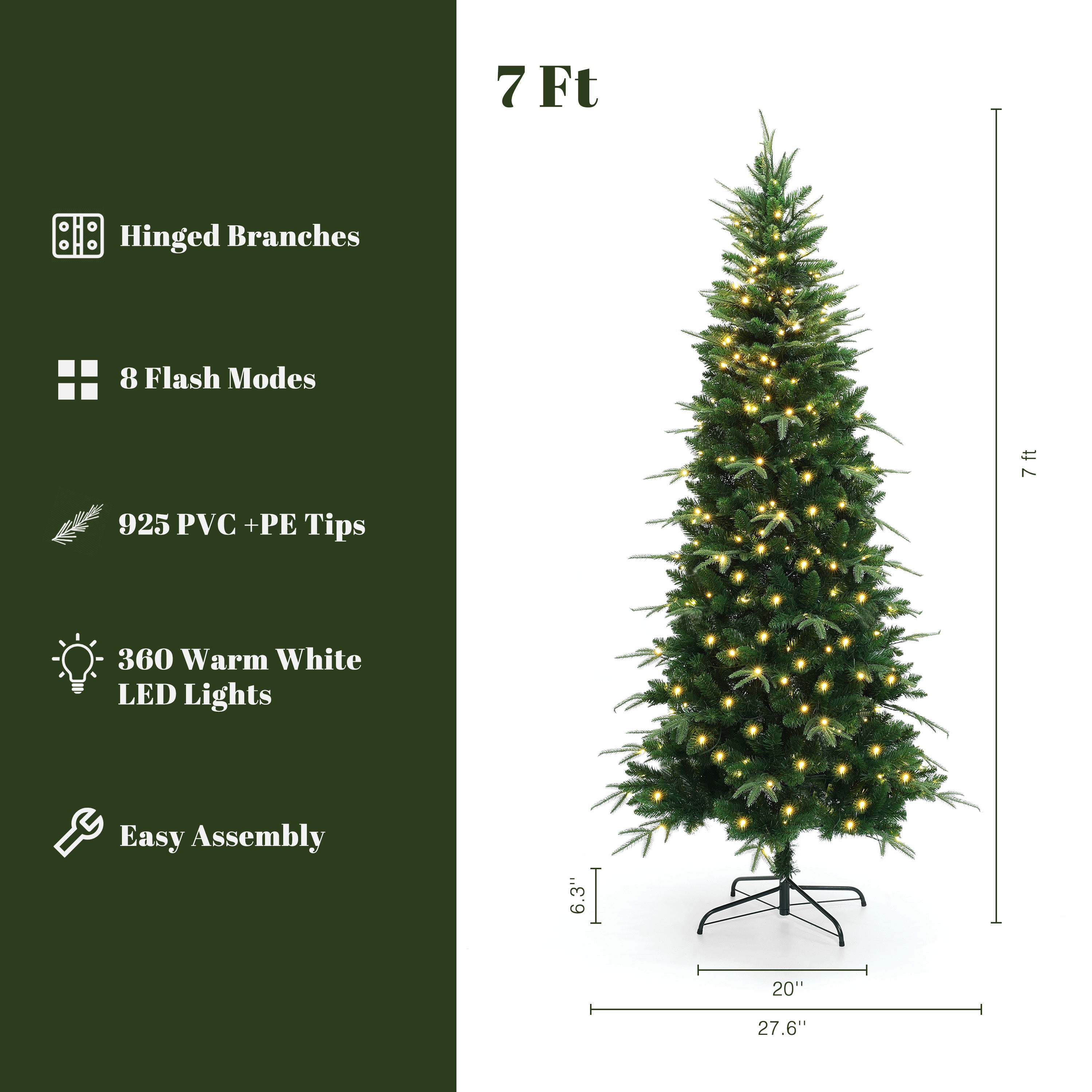 Prepare to brighten your holiday season with our 7-foot Pre-Lit Christmas Tree. This festive masterpiece brings the magic of Christmas right into your home with its enchanting glow. The tree comes pre-strung with 360 brilliant warm white LED lights, creating a merry and bright atmosphere. Crafted with 925 meticulously designed PE and PVC tips, this tree boasts a lush and lifelike appearance that will impress even the keenest eye. Designed with convenience in mind, this tree features hinged branches that make assembly effortless, allowing you to transition from box to full bloom in mere moments. The robust metal stand included ensures your tree stands tall and stable throughout the festive season, ready to hold an abundance of decorations. Perfect for indoor spaces, this Christmas tree with lights is more than just a decoration; it's a dazzling centerpiece that brings family and friends together. With eight enchanting light modes, you can customize your holiday display and create an ambiance that's uniquely yours.