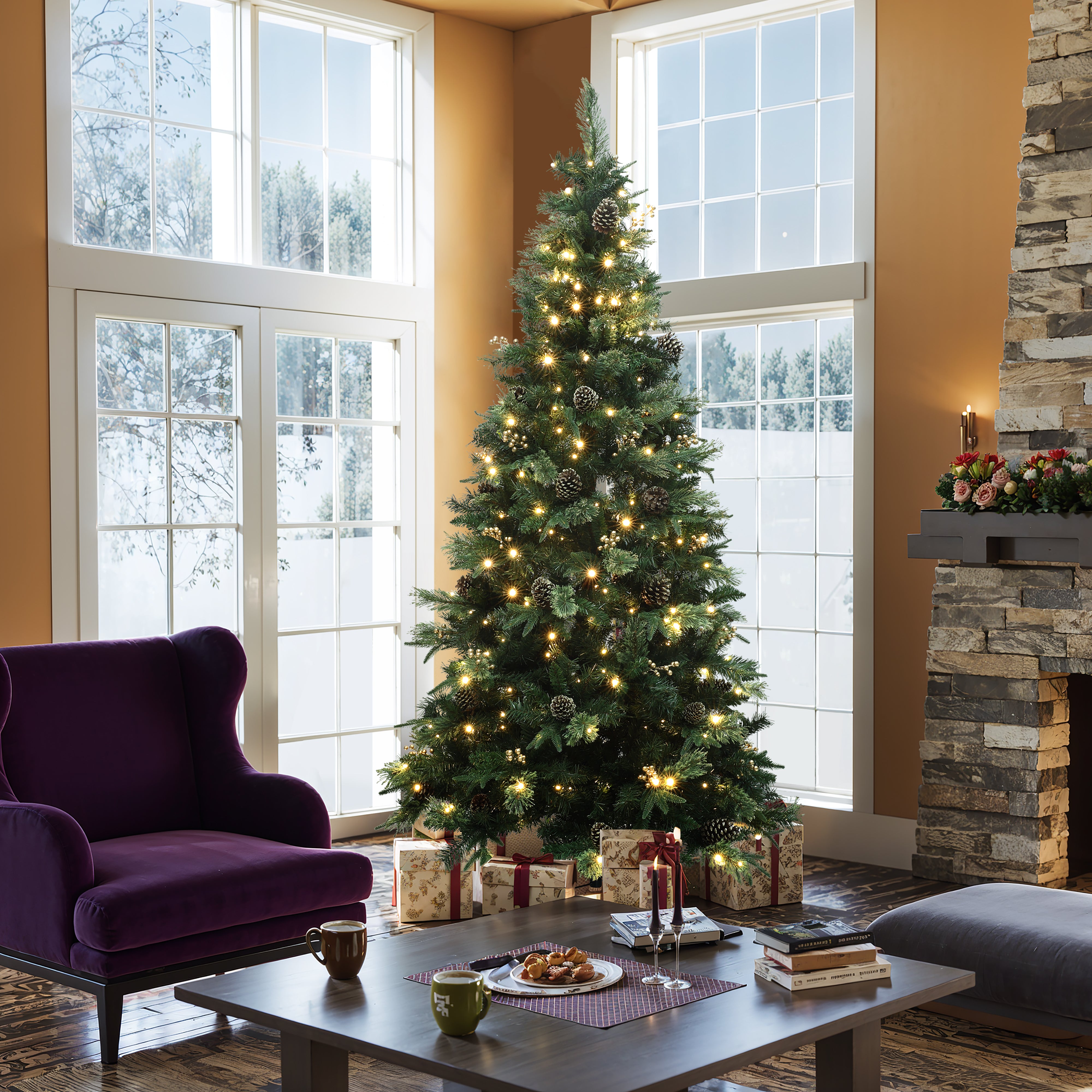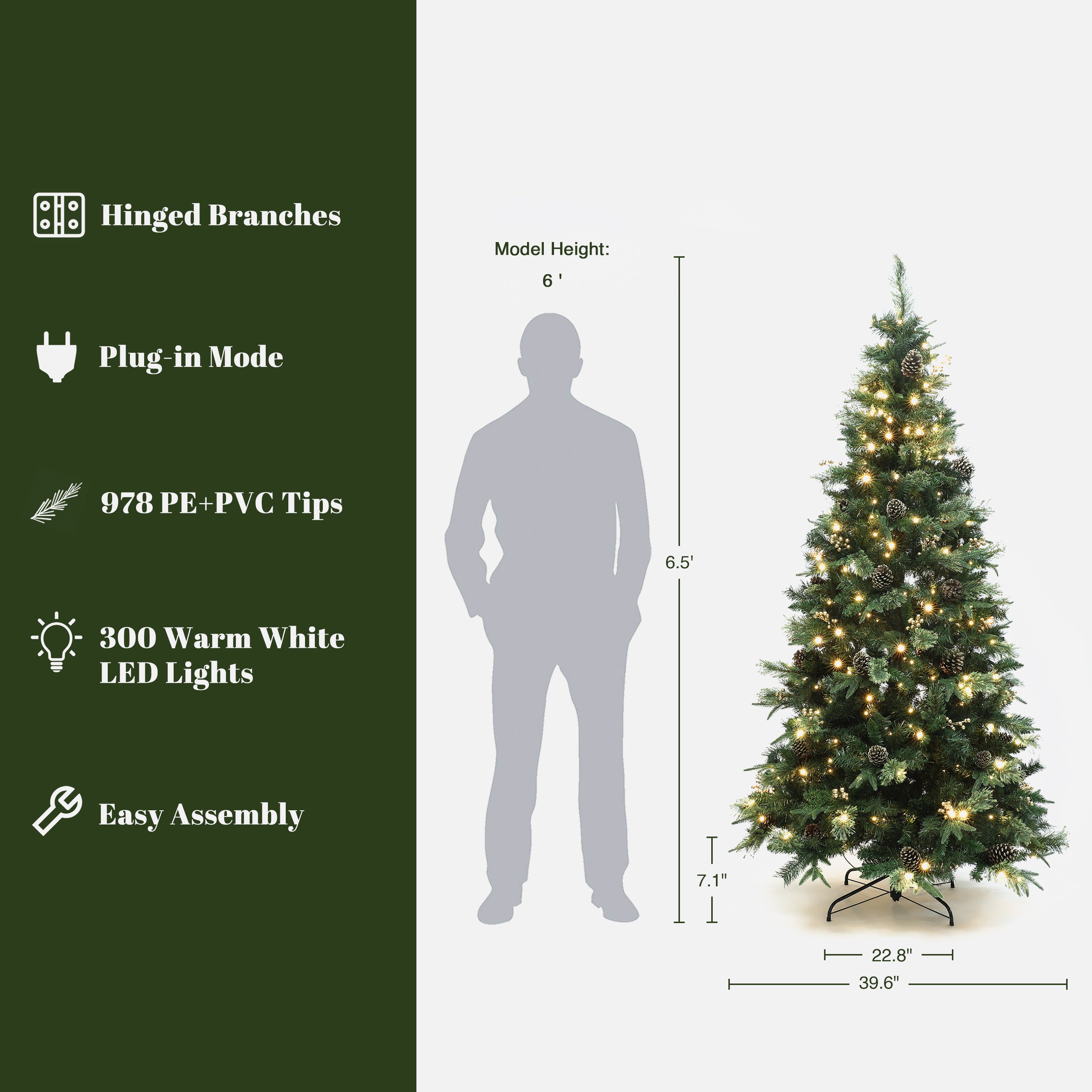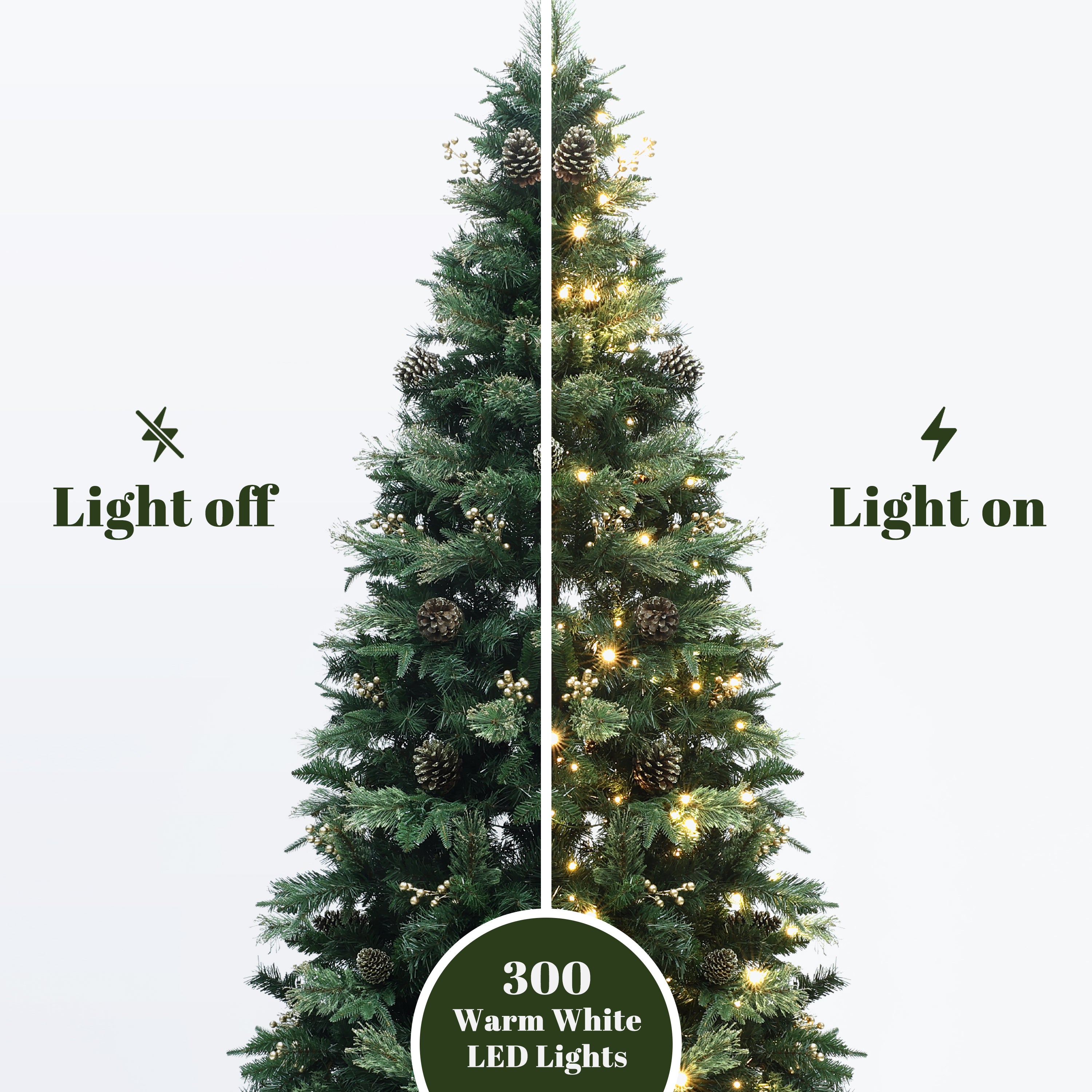 Crafted from high-quality PE and PVC for a lush, realistic look.Features 300 pre-lit warm LED lights, hinged branches, and a three-section design for quick setup and easy storage.