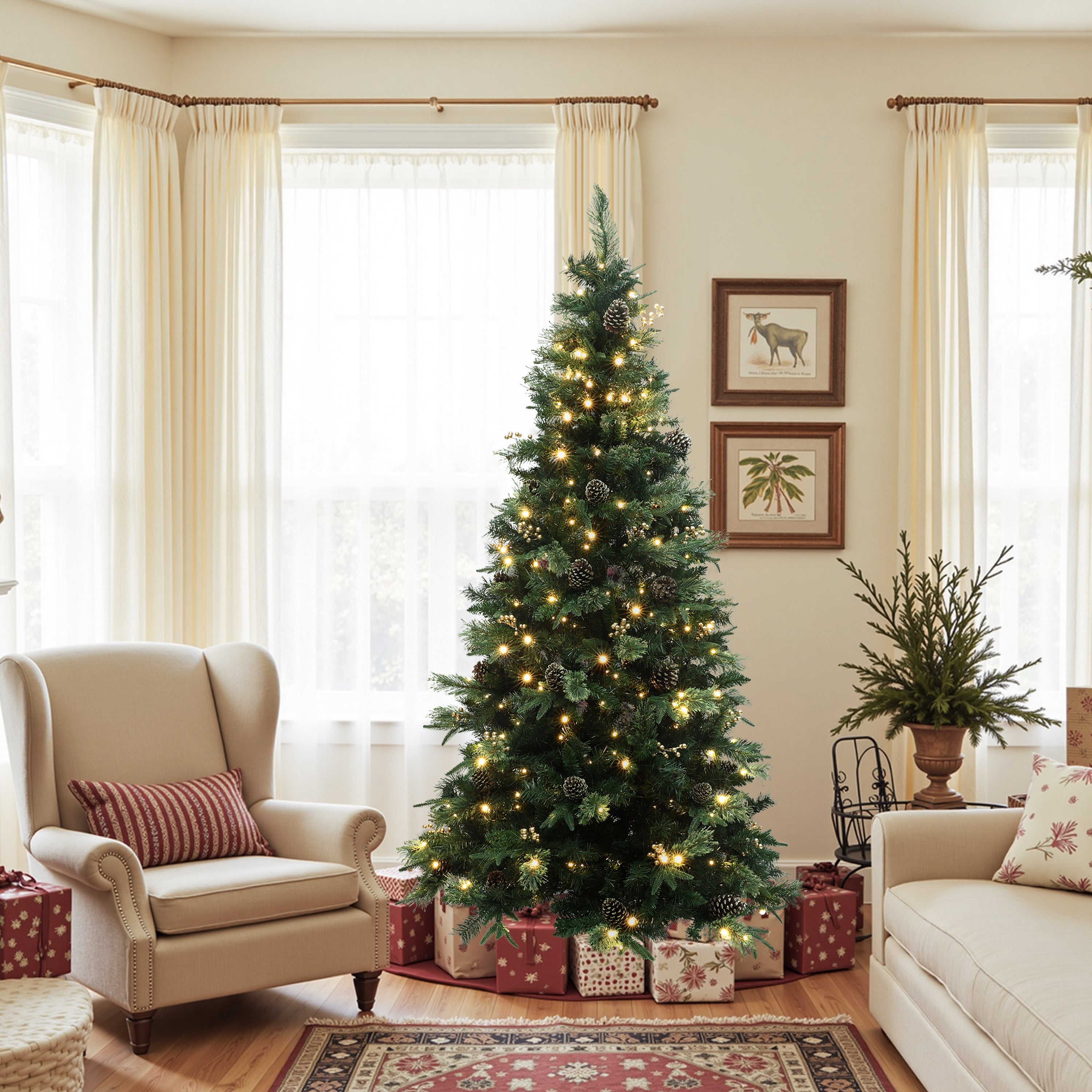 Add festive charm to your home with Artificial Pine Christmas Tree. Its full silhouette, accented with warm LED lights, pinecones, and golden berries, instantly creates a cozy holiday mood.