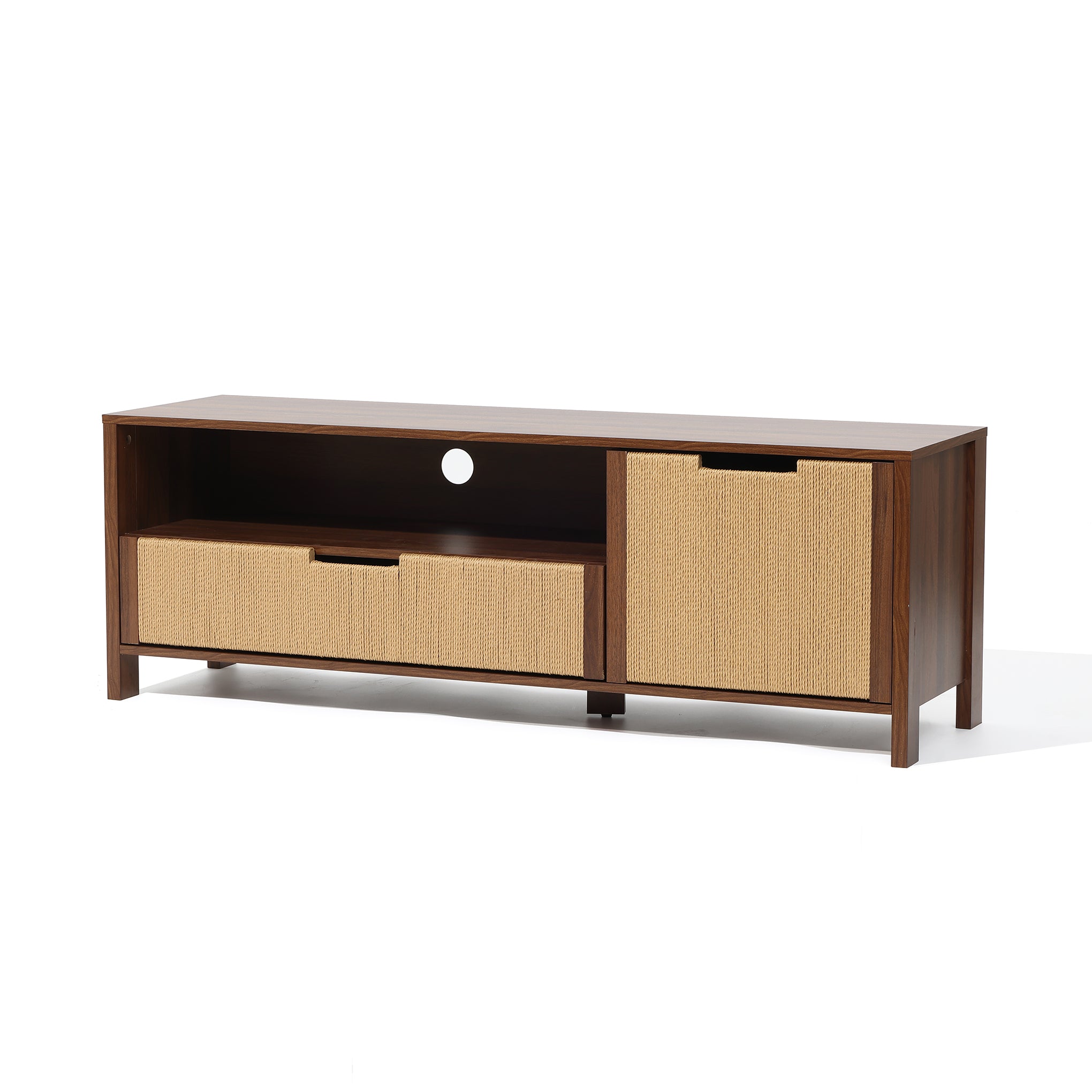 On a modern TV stand, use the cable holes like those on the Aria Tambour Door 62.6" TV Stand to thread cords out the back. The Casper’s open shelf fits a 10-lb cable box, keeping wires hidden for a clean, sleek look up to 65 inches.
