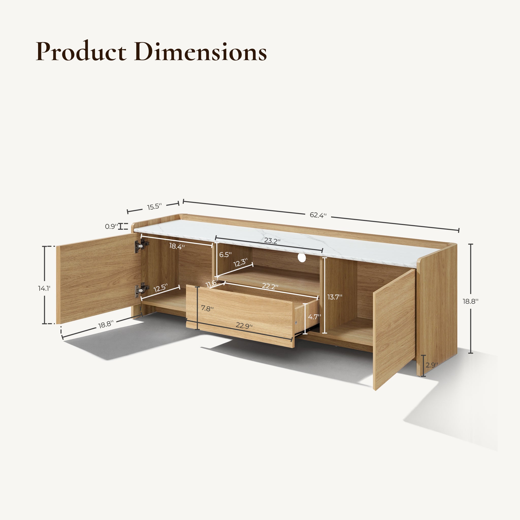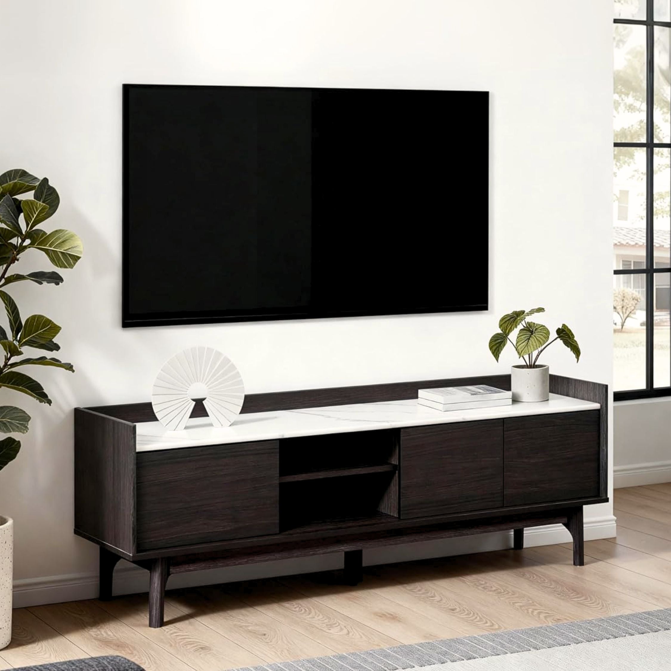 Measure Your Space and TV Size: Before shopping, measure your TV’s width and the available space. A stand slightly wider than your TV, like the Eric 70-inch Wide Credenza, ensures balance and stability.