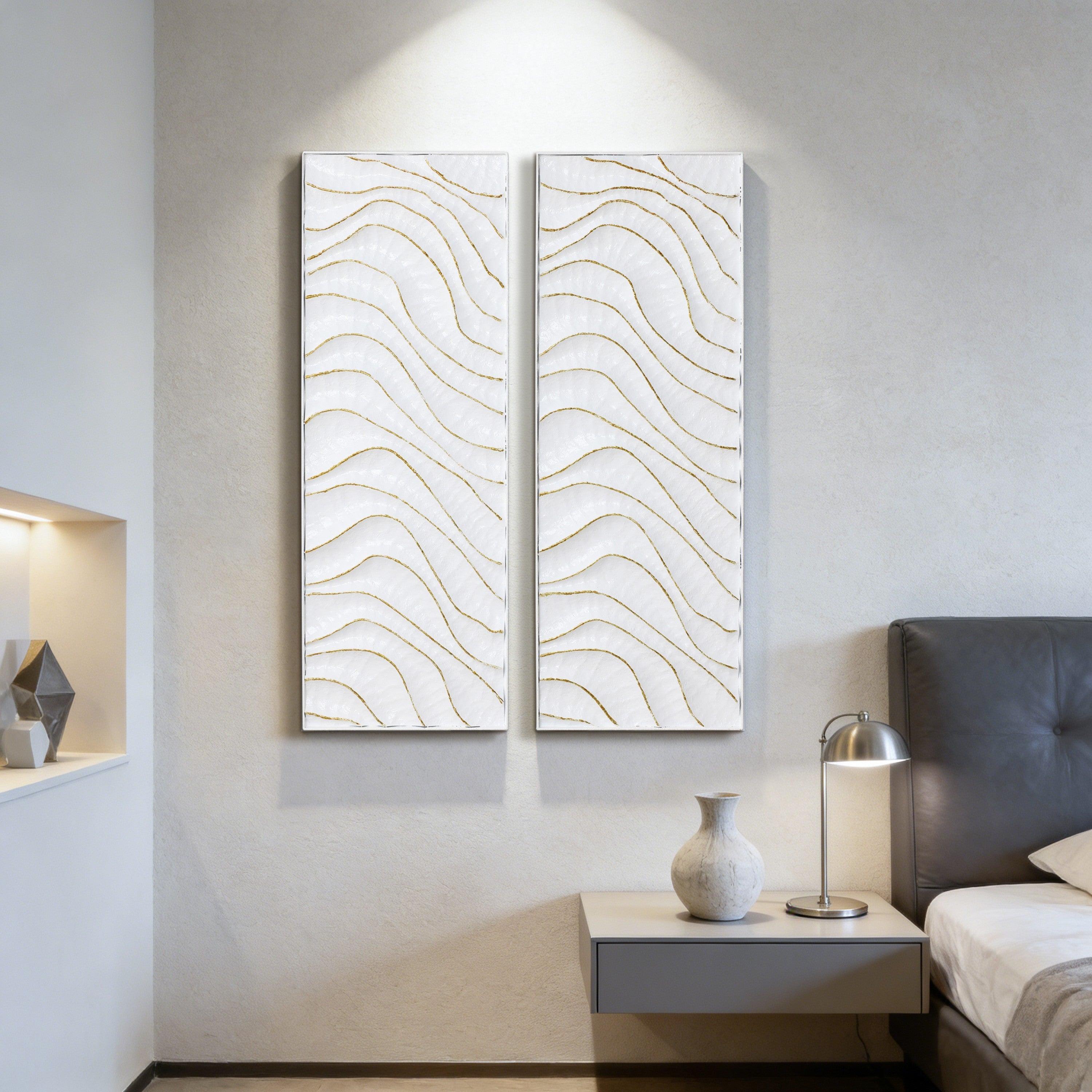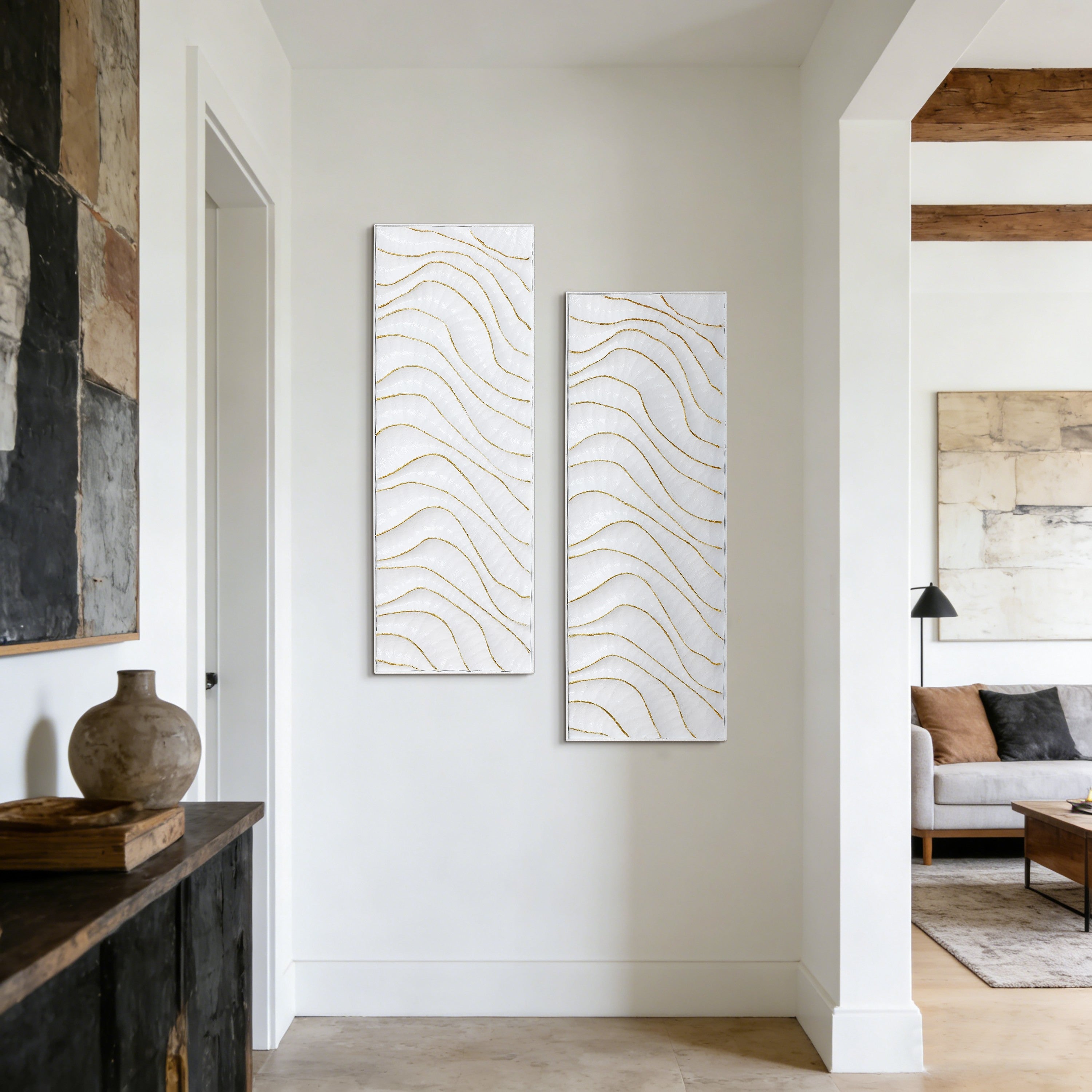 - Modern Abstract Wall Decor: Set of 2 abstract wall art features flowing gold lines on white.