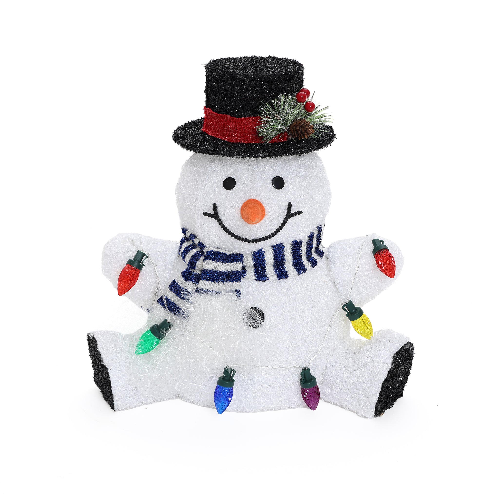 Bring joyful charm to your holiday setup with this Outdoor Snowman Decoration. Features a black top hat, blue-striped scarf, and bright orange nose.