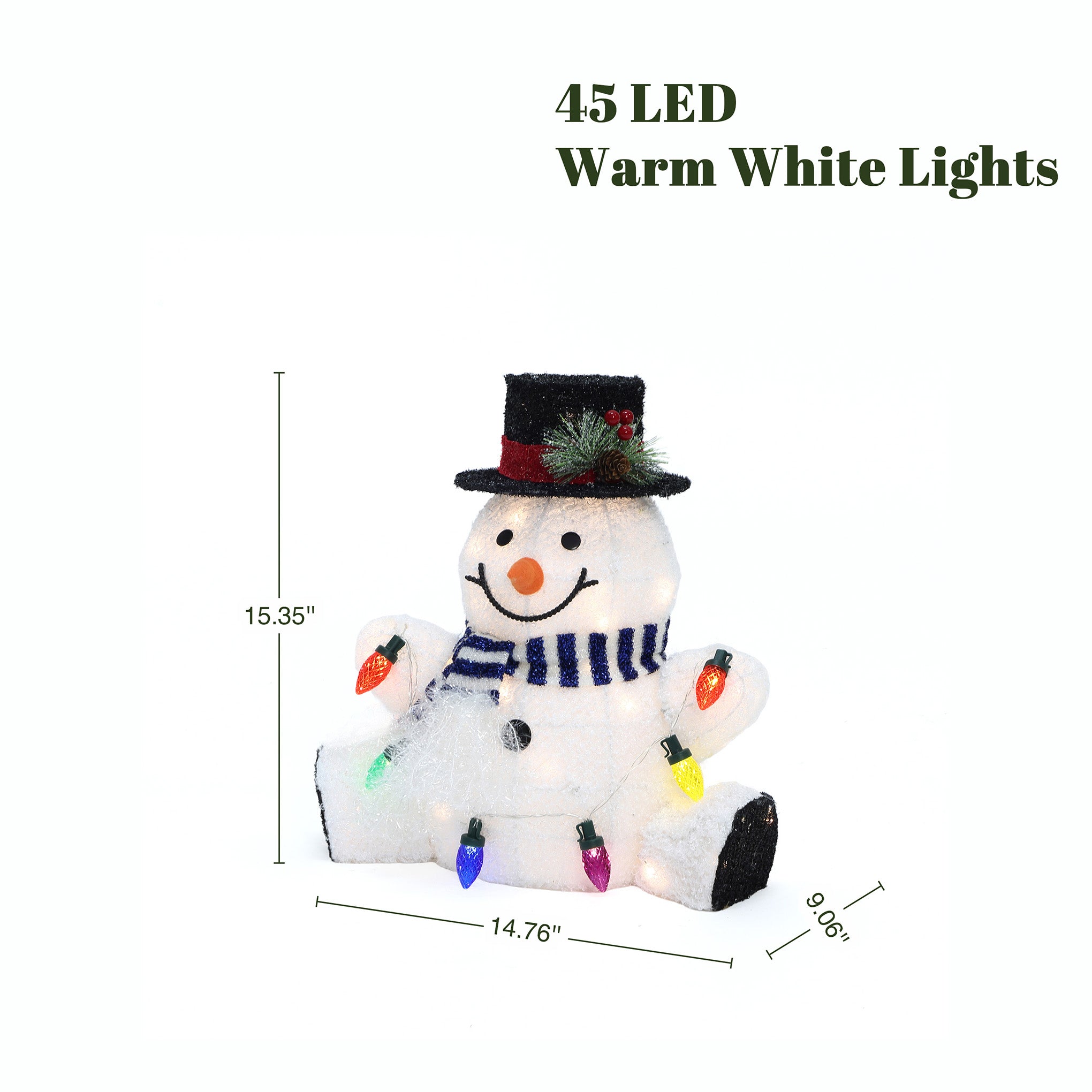 Crafted with a soft polyester finish and sturdy metal frame, with 45 warm white LED lights and holds a string of colorful bulbs for added cheer.