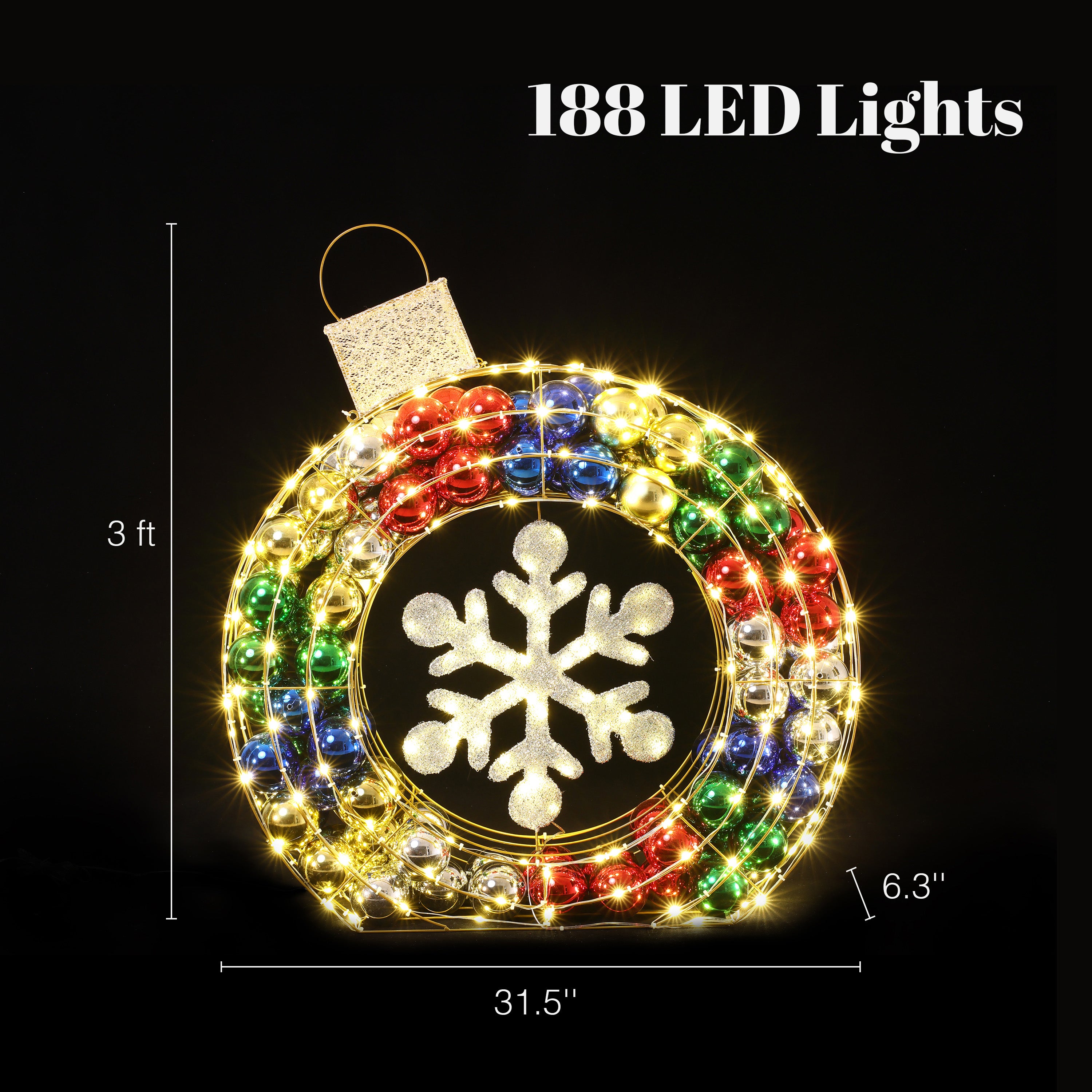 - Dimensions:32" W x 36" H x 6" D with glowing snowflake, vibrant baubles, creating a winter wonderland.