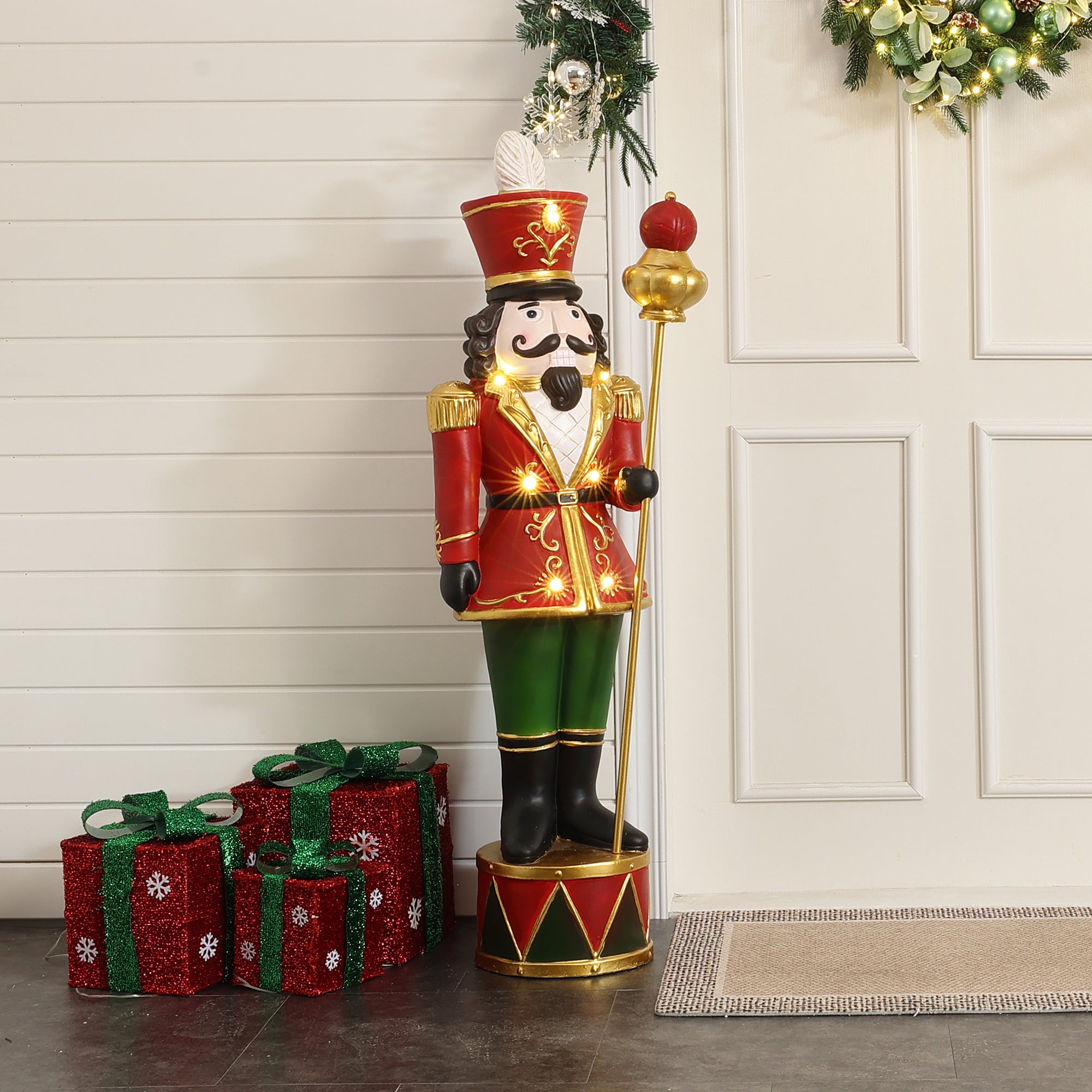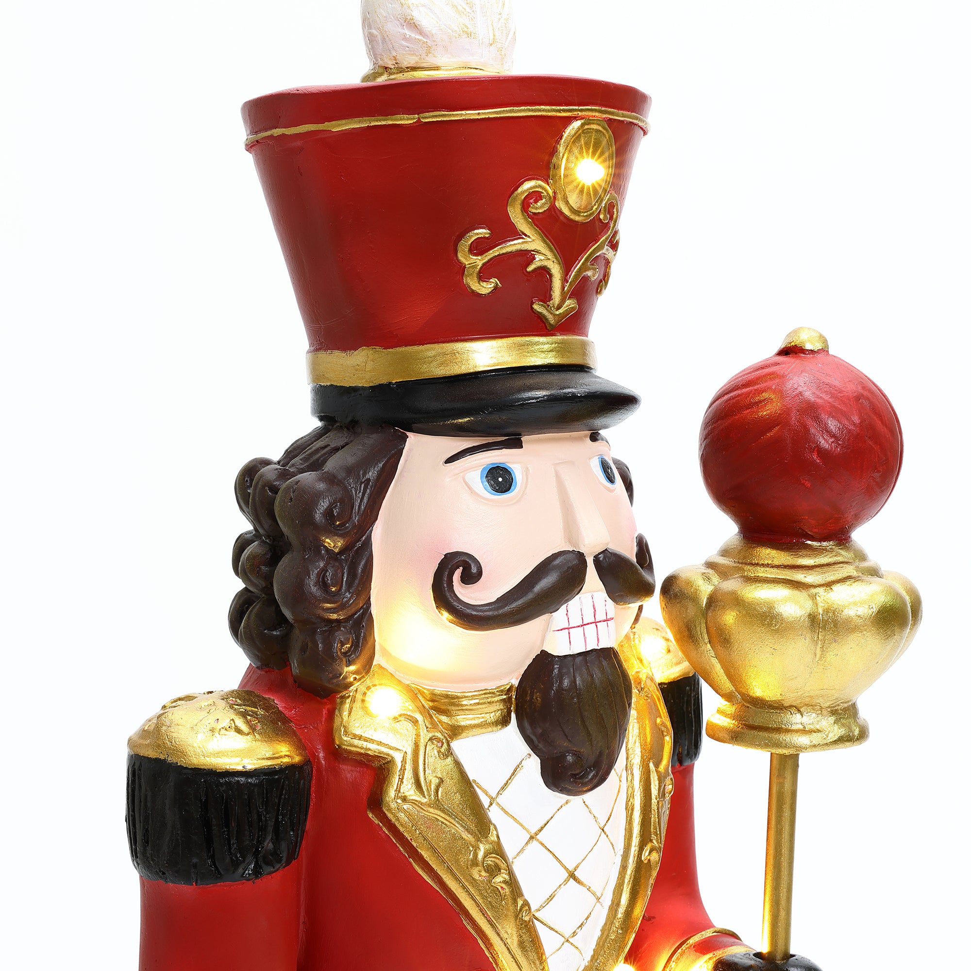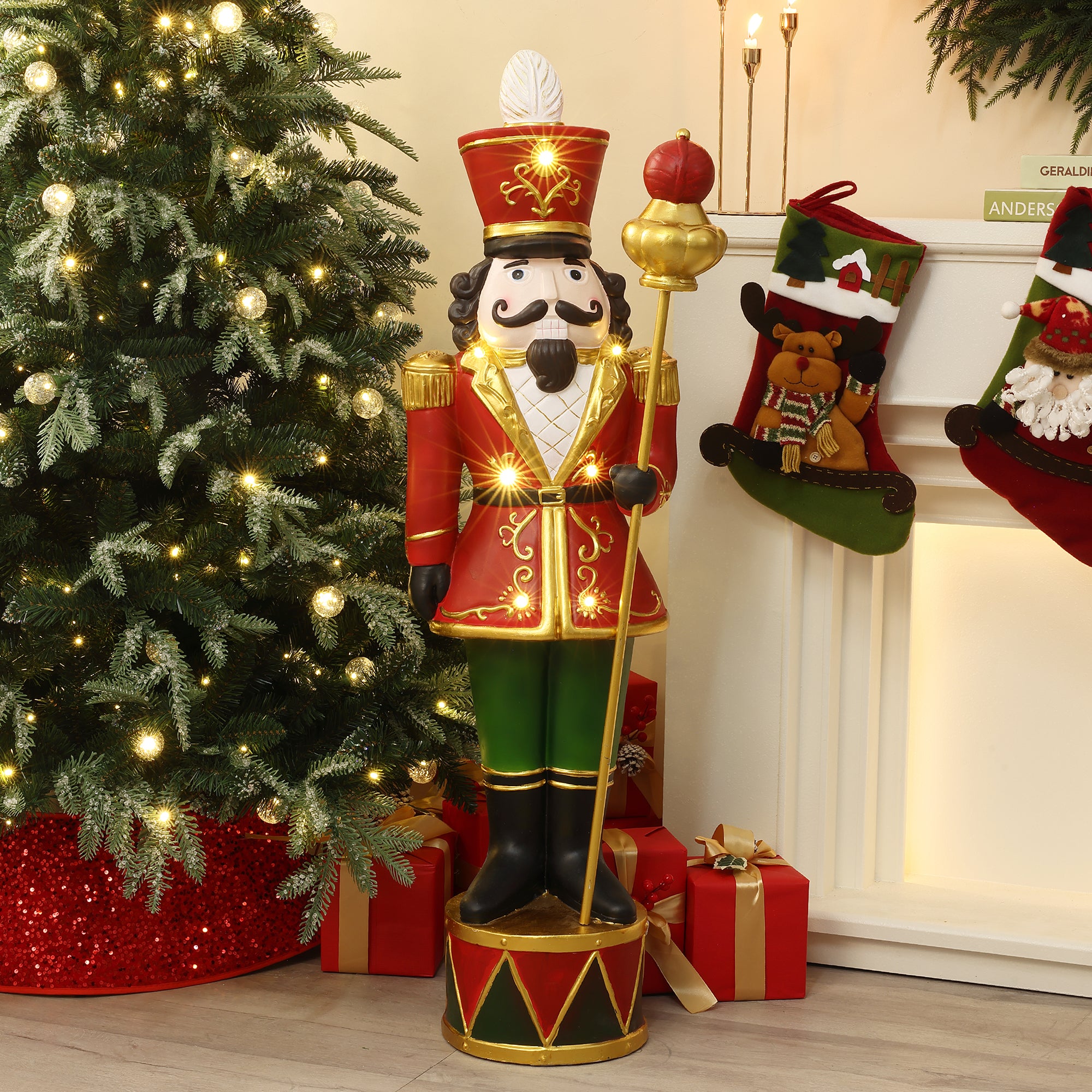 This 4ft Traditional Nutcracker King, dressed in regal red and green, holds a golden scepter and shines with festive LED lights.