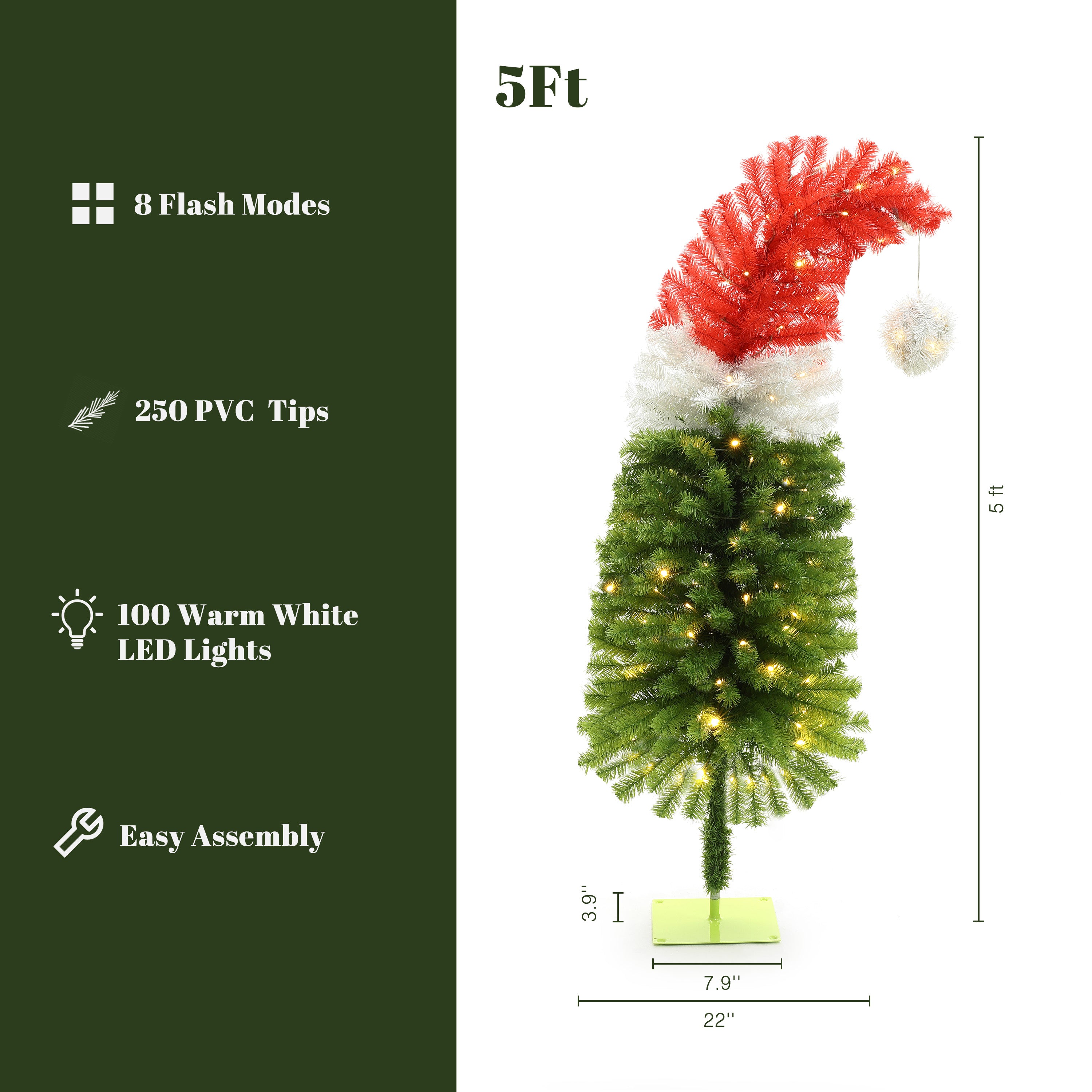 Are you ready to get into the festive spirit this Christmas season? The unique Christmas tree shaped like Santa's hat will catch everyone's eye. At 5-feet tall and pre-strung with 100 LED lights with eight light modes that feature bright lighting effects, make this charming tree the perfect festive accent decoration for your home this holiday. The branches and tips are made of premium, fire-resistant PVC material allowing you to decorate your home safely and with confidence. This tree is a lovely centerpiece for your holiday decorations, bringing joy and beauty to your home during this special season and for years to come.