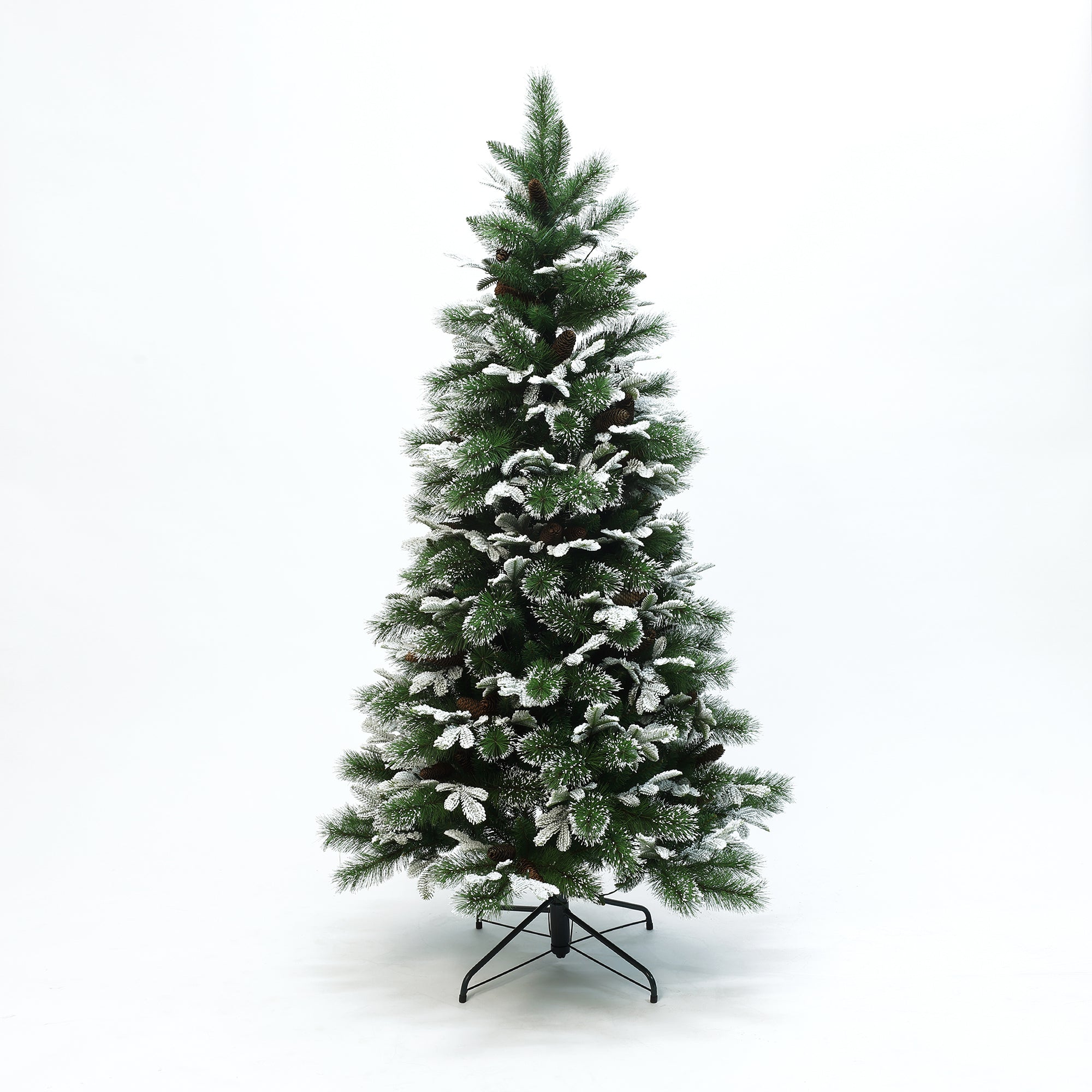 - Elegant Styles: 1,296 PE and PVC heads with light-colored flocking and natural pine cones for woodland holiday appeal.