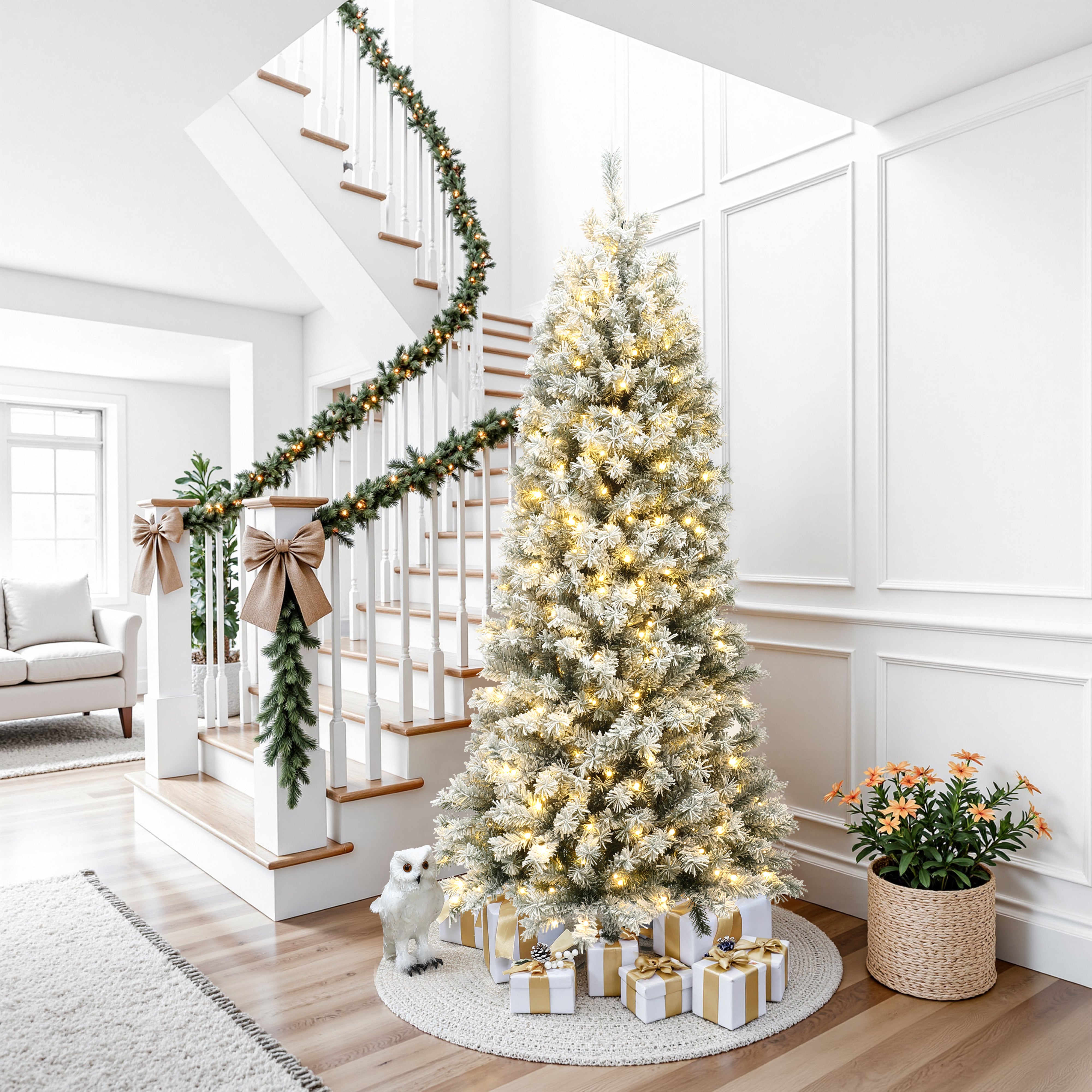 The 7 ft pre lit Christmas tree with snow flocked branches creates a festive holiday centerpiece with warm LED lighting. Its full pine silhouette brings the magic of winter indoors.This pre lit artificial Christmas tree includes 350 LED lights, pre-strung for hassle-free decorating. Crafted from high-quality PVC tips, it offers a realistic snowy texture and sturdy branches to hold ornaments with ease. Supported by a durable metal stand, it ensures stability throughout the season.Ideal for holiday living rooms, entryways, or office lobbies, this snow Christmas tree enhances any setting with a soft, glowing ambiance that welcomes family and guests alike.Enjoy a bright, festive holiday season with this 7 ft pre lit Christmas tree—set up quickly and start celebrating.