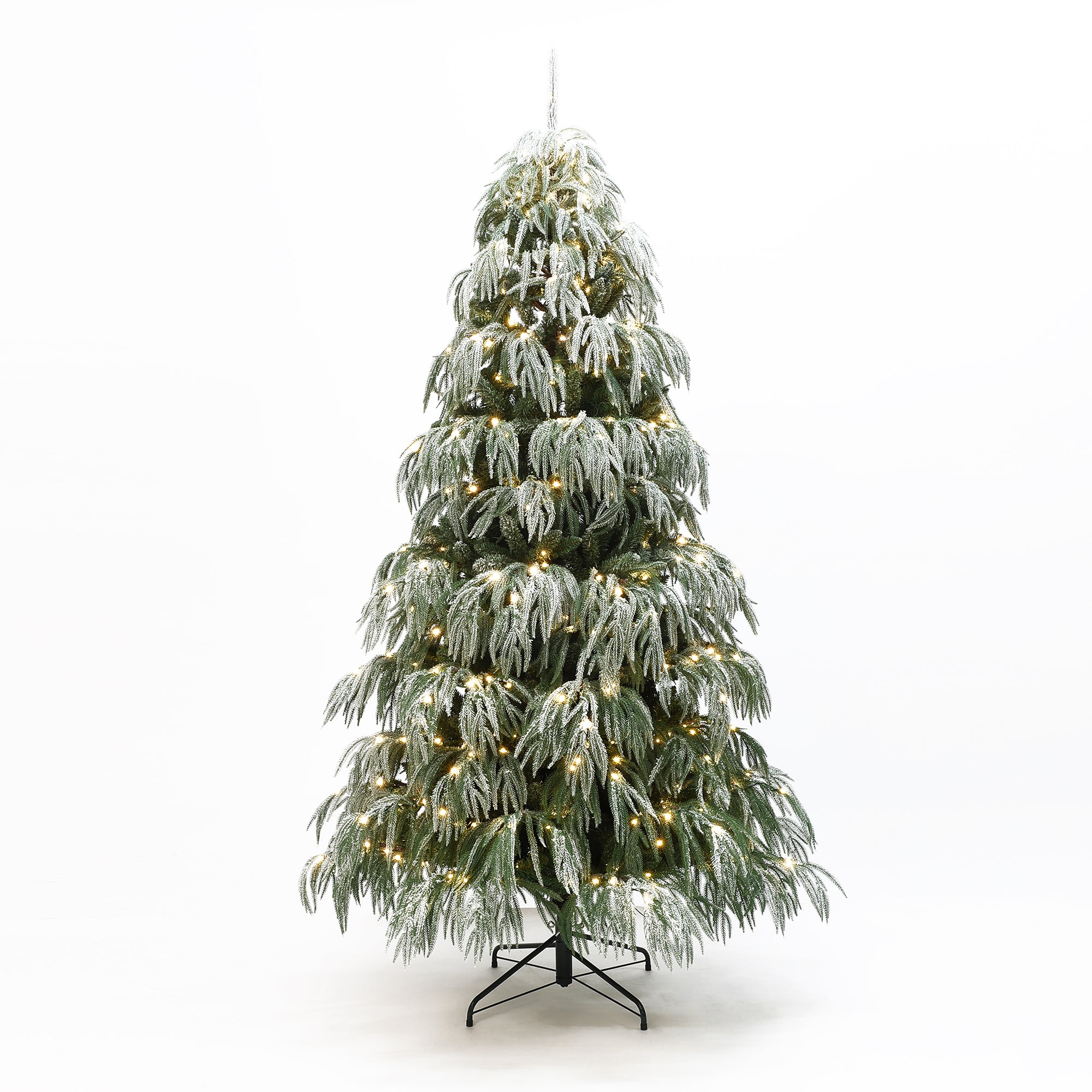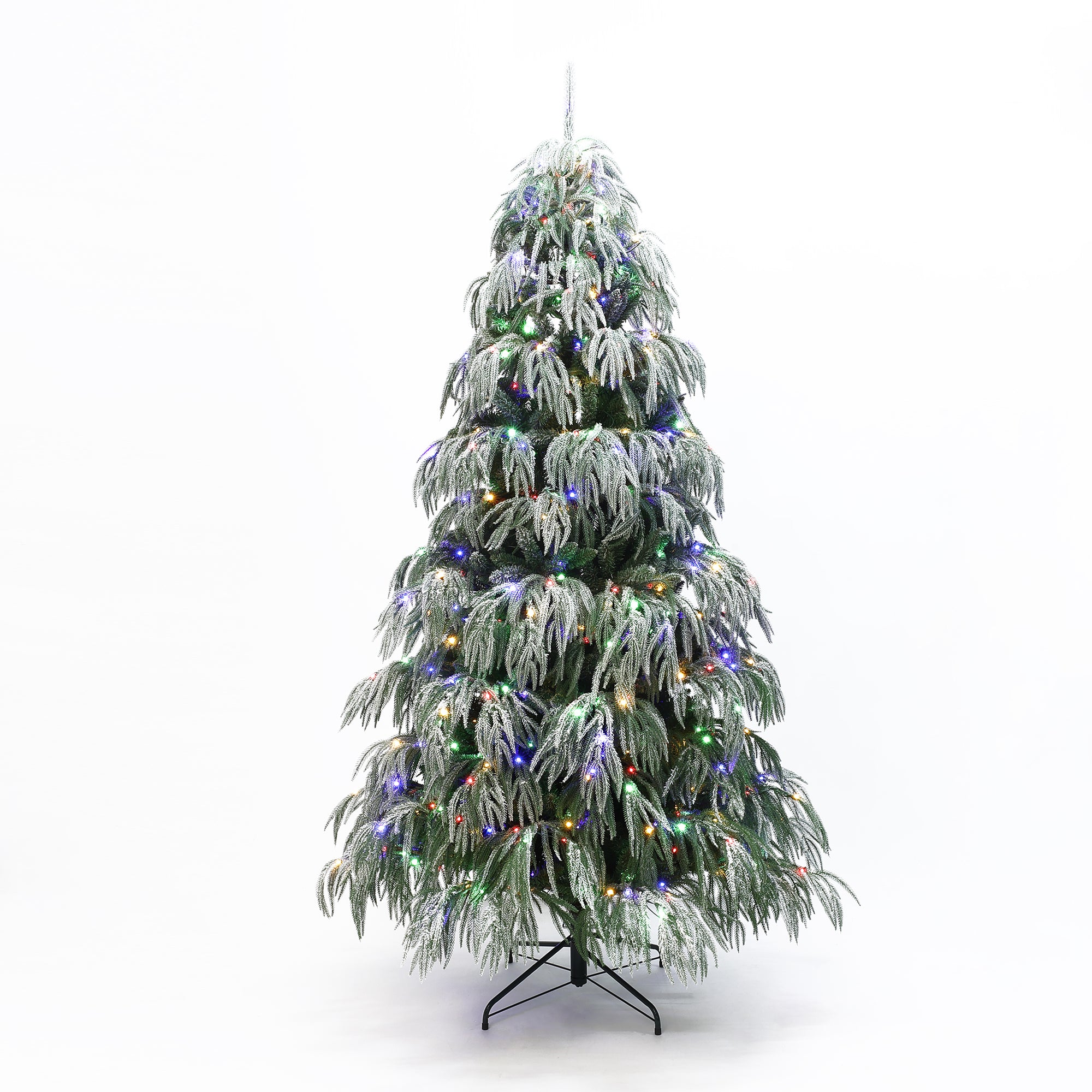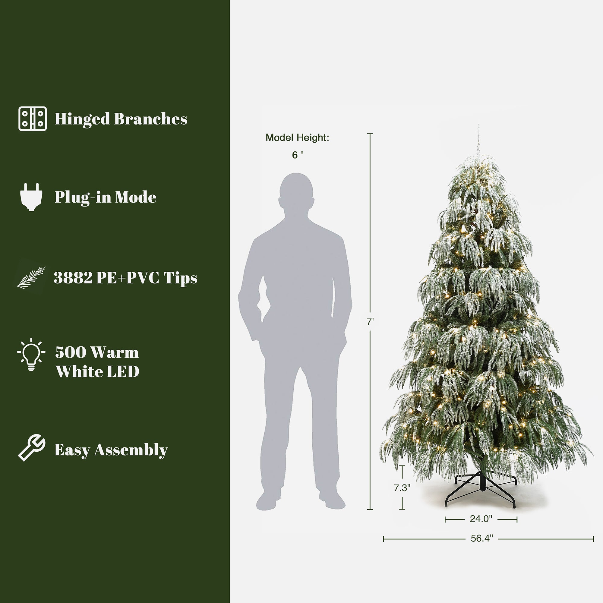 This 7-ft Snow-Flocked Christmas Tree. Designed with down-swept branches ,3,882 lifelike PE/PVC tips, The charming snow-flocked finish adds a frosted effect,offers full silhouette.