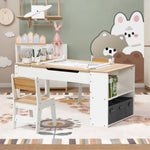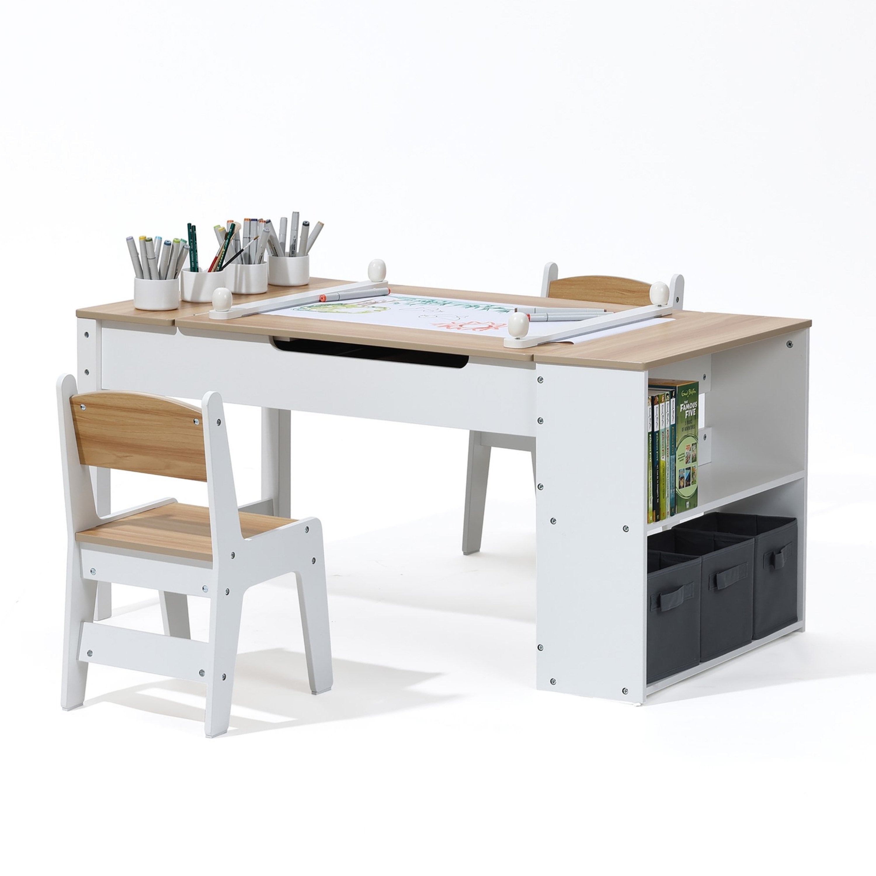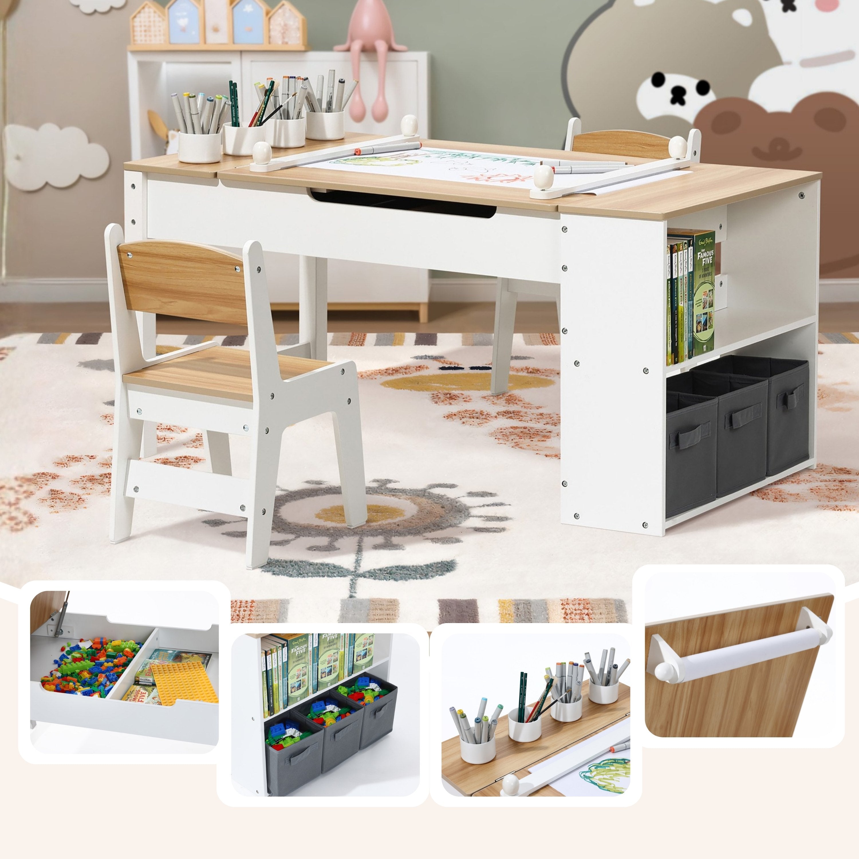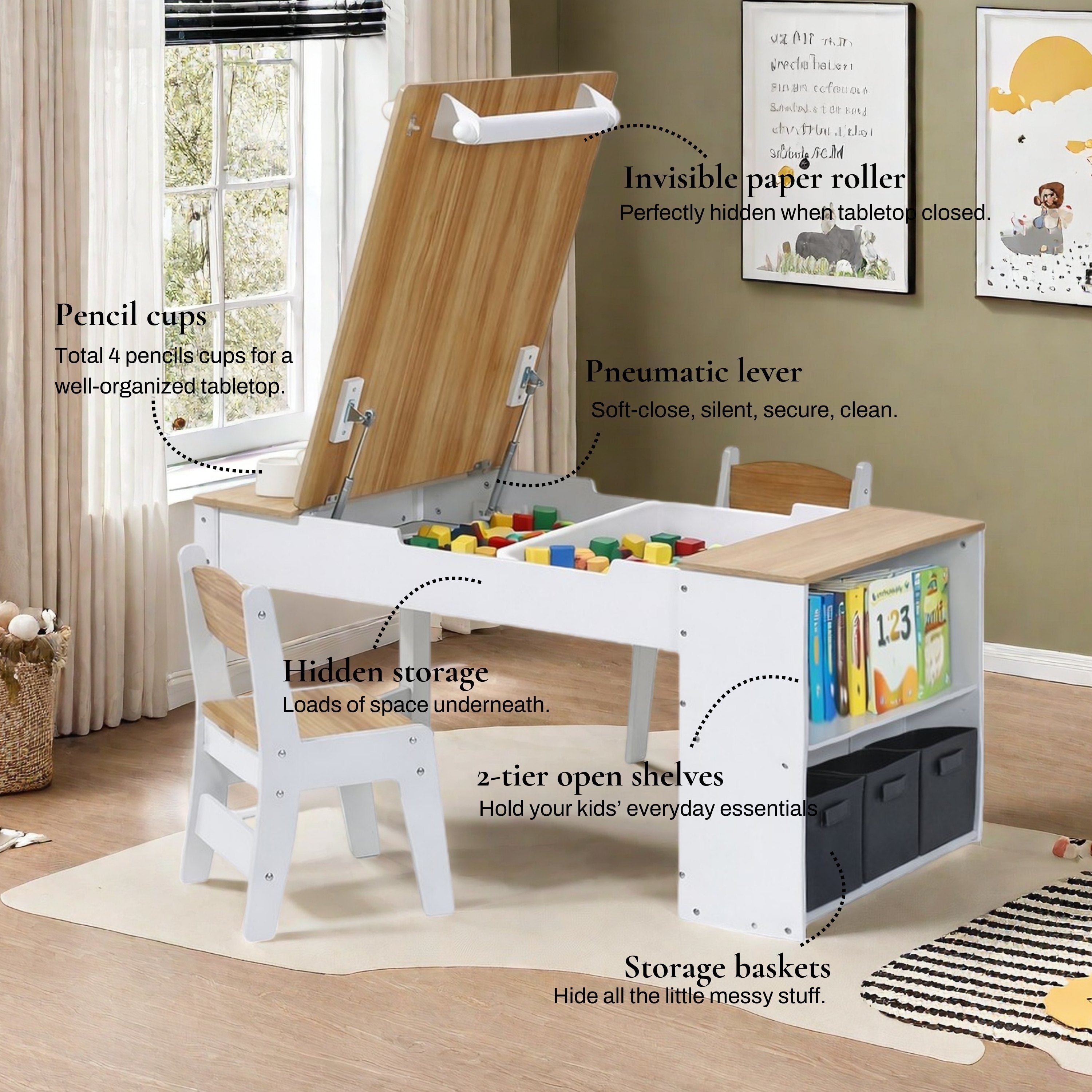 Lift-Top Kids Activity Table and Chairs Set with Storage Bookcase and Hidden Paper Roller