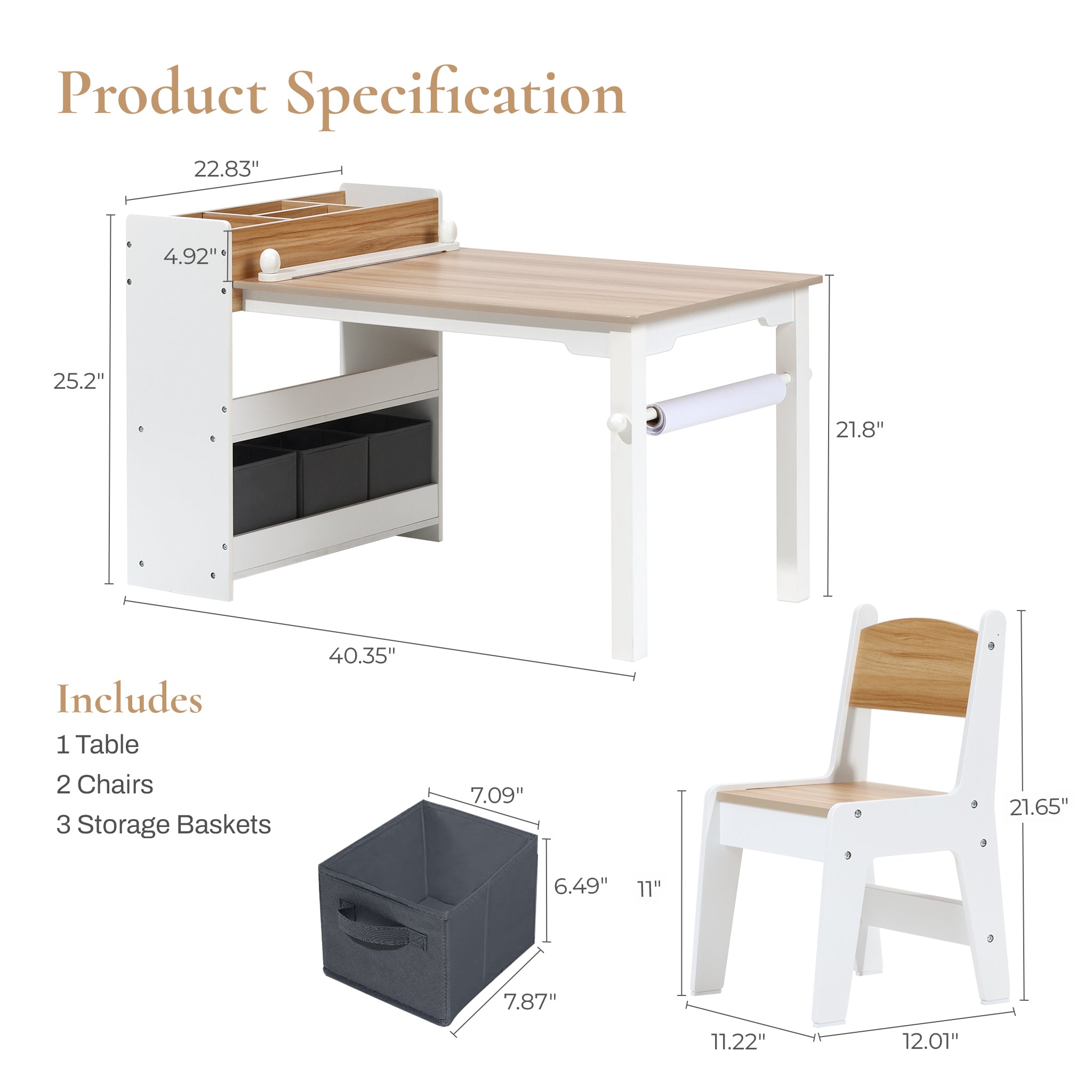 - Kids activity table and chairs set includes a table, 2 chairs, 2 removable canvas storage boxes and a paper roll holder