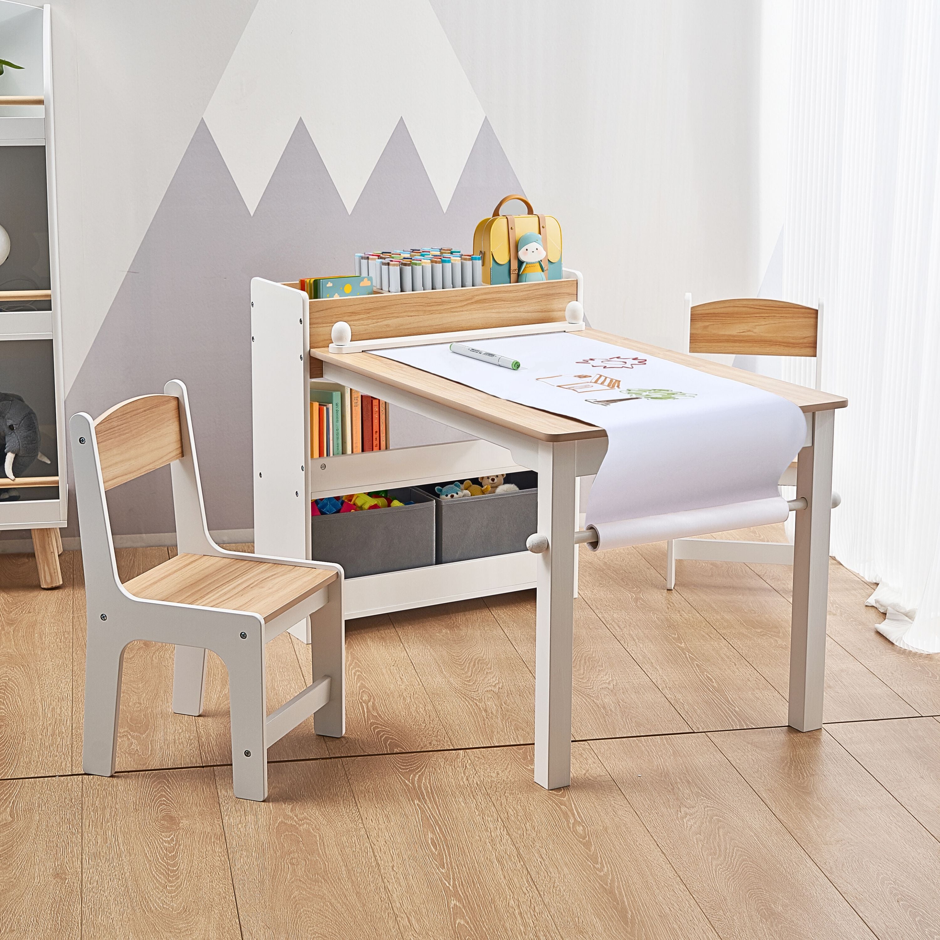Kids Activity Table and Chairs Set with Storage and Paper Roll Holder