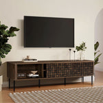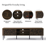 - Textured Design: Dark brown wood media console features basket-weave sliding doors.