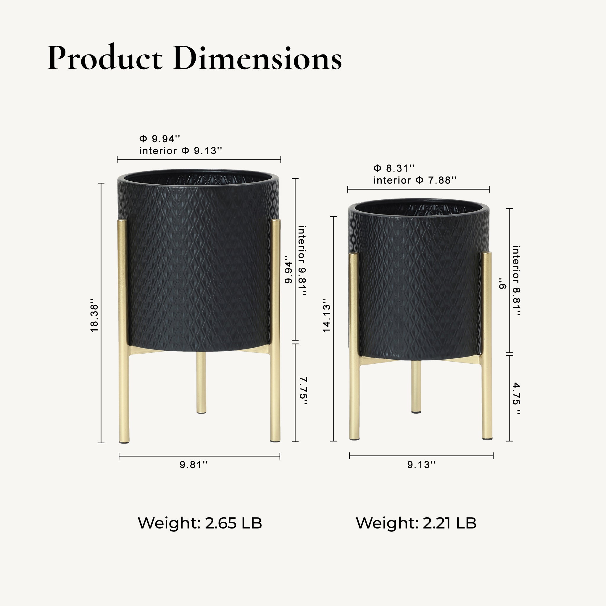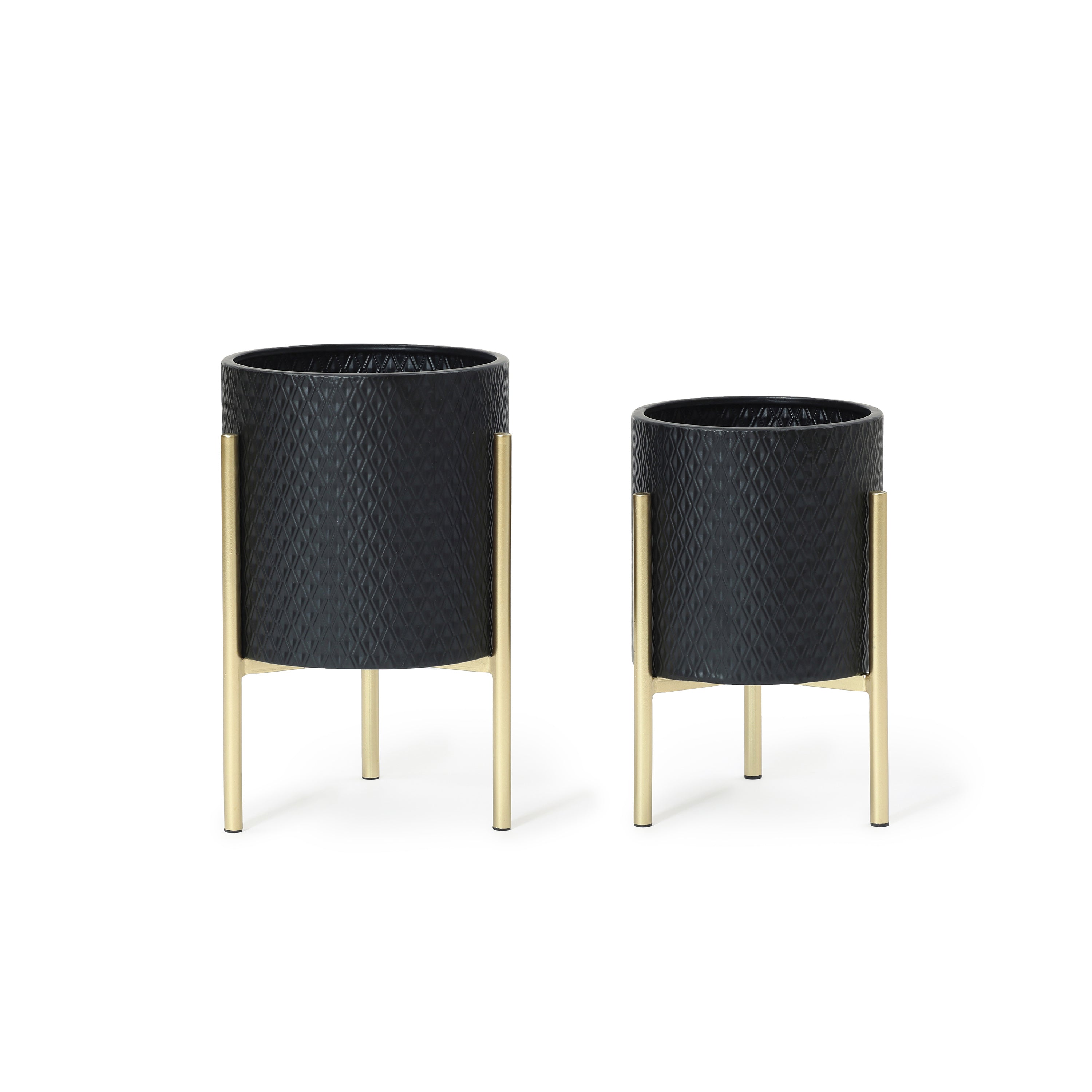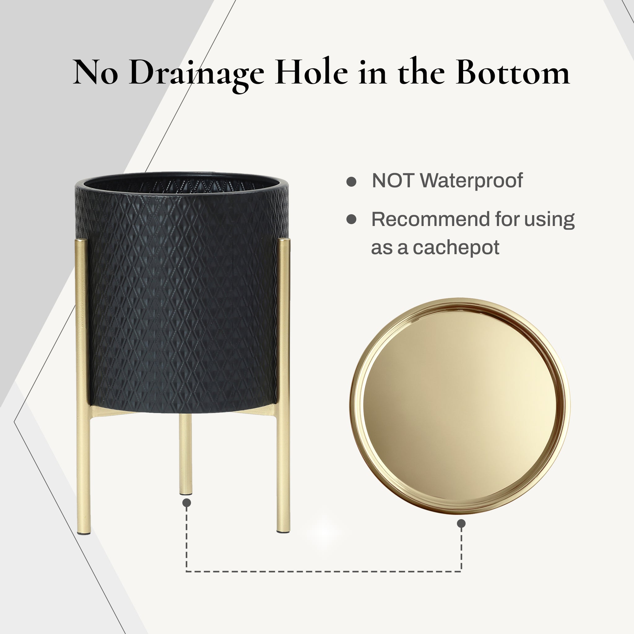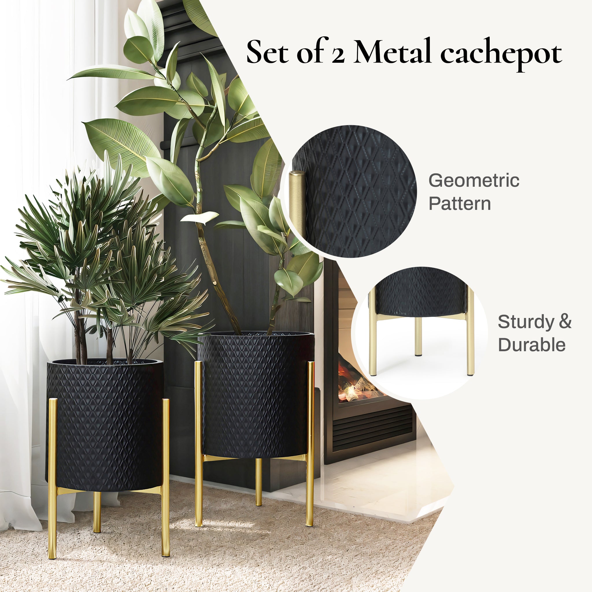 Enhance the look of your beloved plants by giving them a stylish place to sit with this 2-piece metal pot planter set. These planters have a contemporary modern style that is inspired by a minimalist design, making them the perfect choice to brighten up your decor. Each metal cachepot planter has a stamped diamond design with a black finish. The plant pots are made of durable iron to ensure they last for years. Each elegant pot sits on its sturdy gold metal stand, and the cachepots can be easily removed from their stand if needed. These display planters come with no bottom drainage holes, which means that you can leave your plants in their original growing pots and remove them for watering. This metal cachepot set is an excellent way to dress up your plants without disturbing their growth in their original planters.