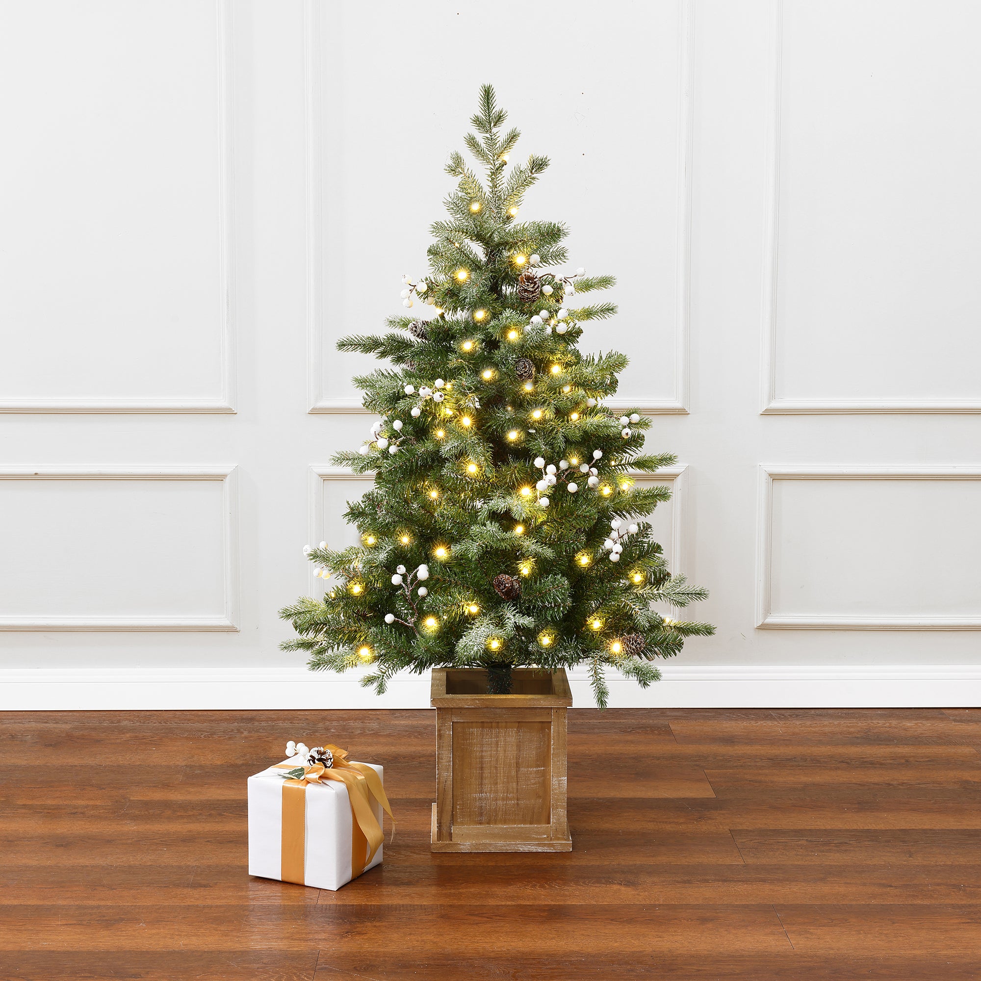Pre-Lit Green Christmas Pine Tree with Wood Pot,3.9Ft
