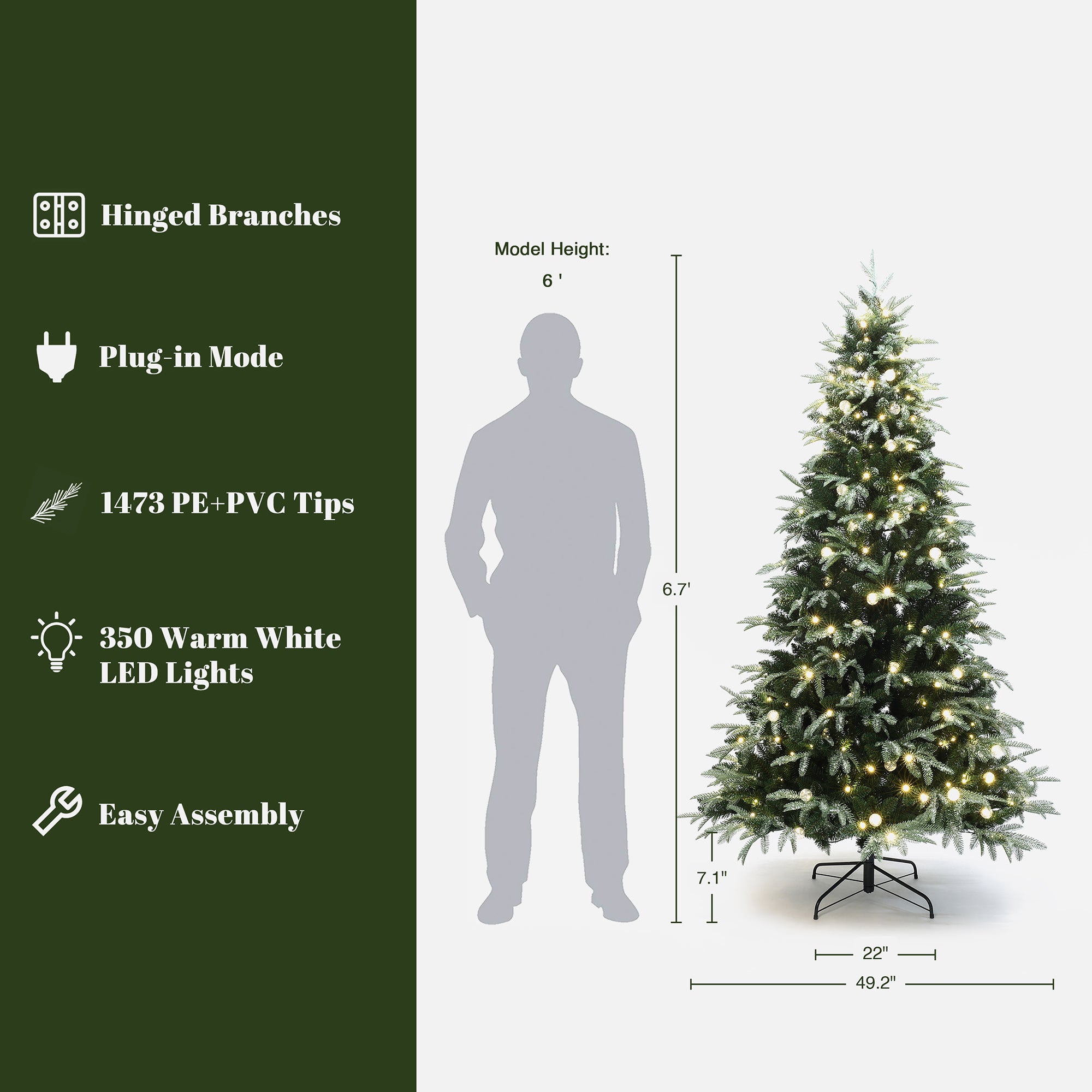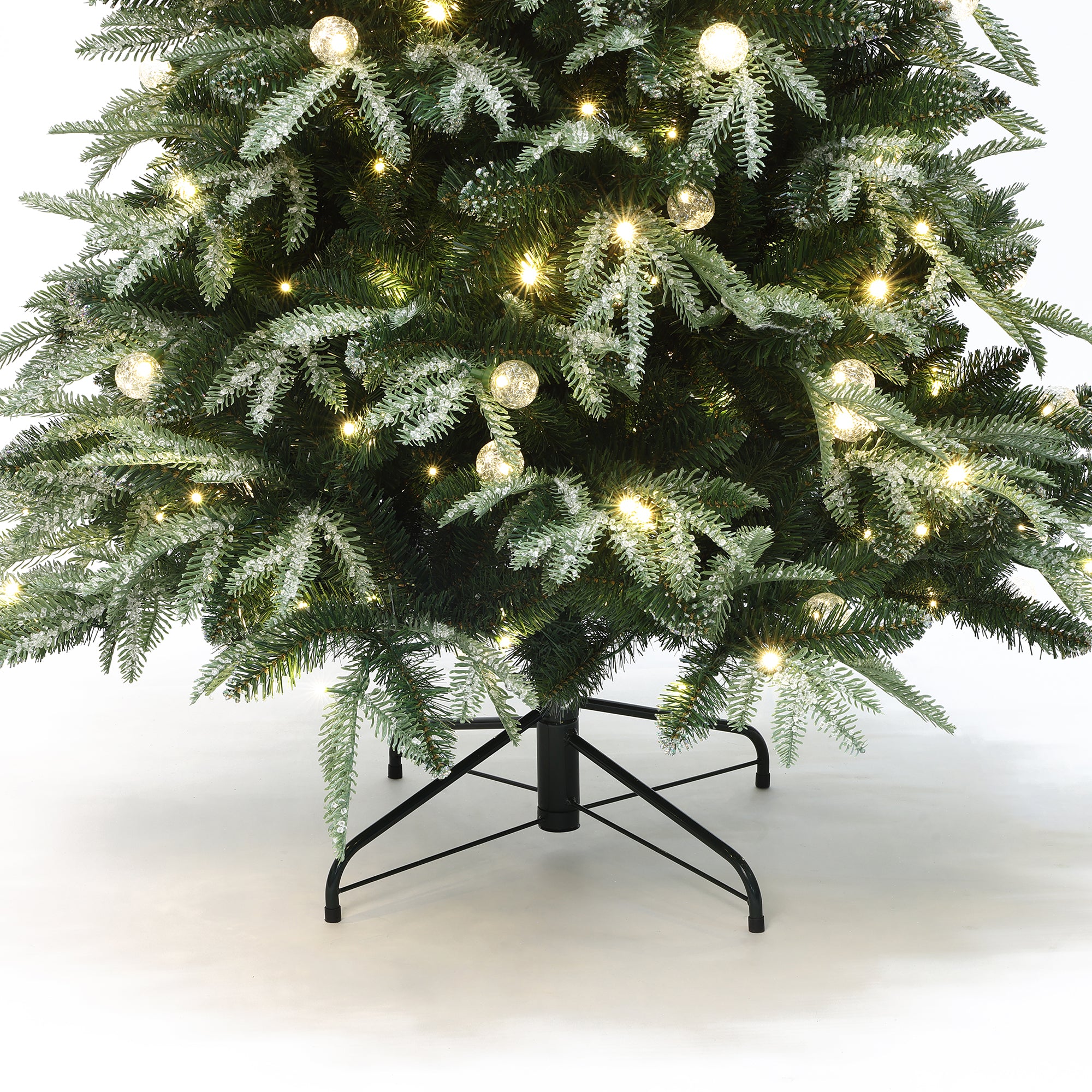 Made from premium PE and PVC materials. Featuring 350 warm white LED beads, vibrant sequins, and transparent ball lights. The hinged branch design and three-stage structure ensure quick, easy setup and long-lasting stability.