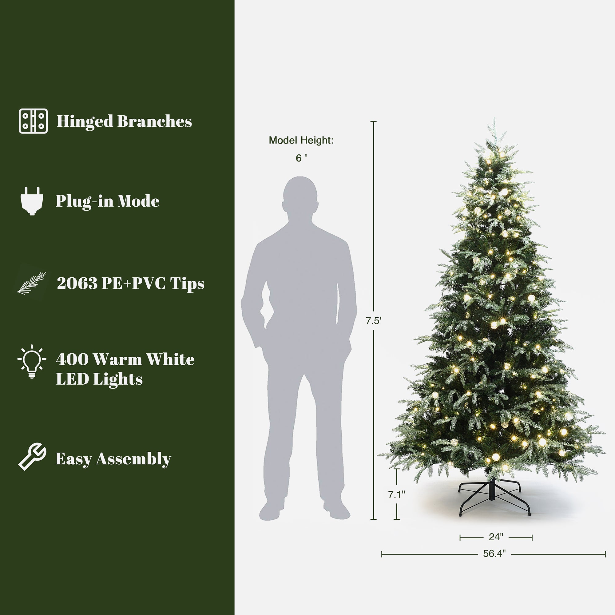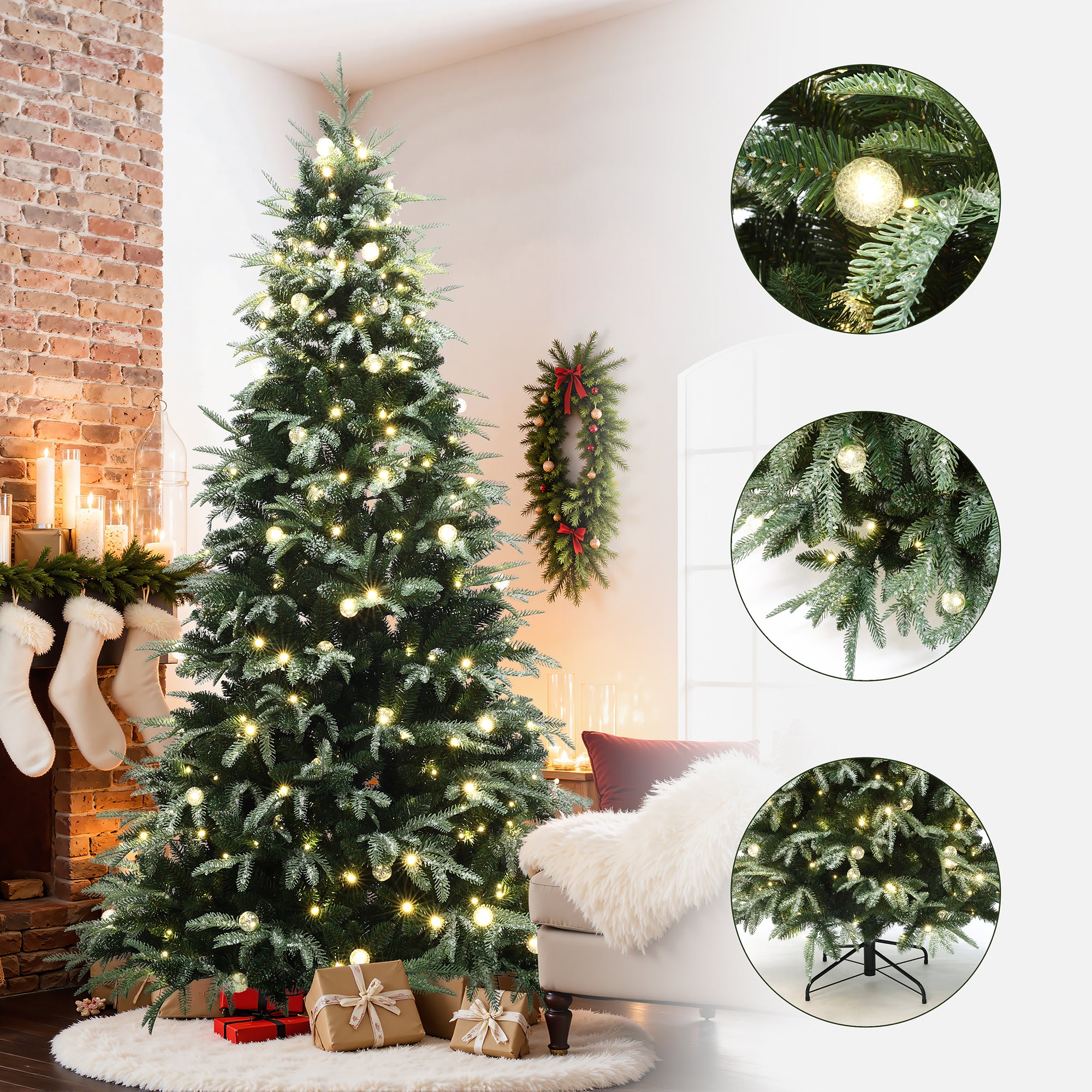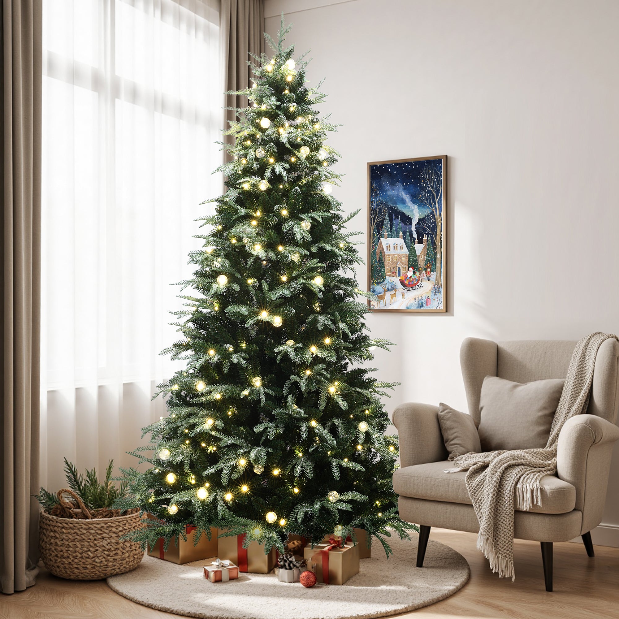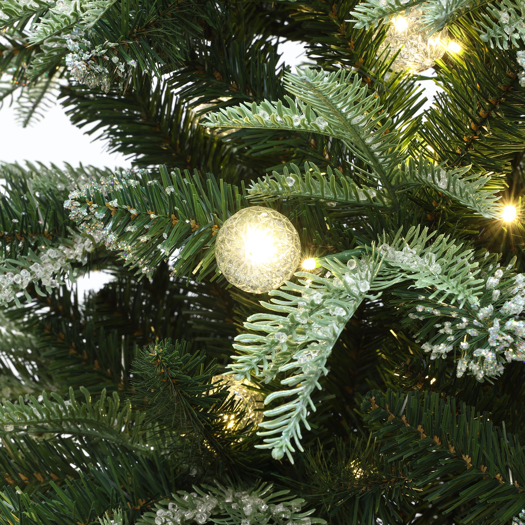 Crafted from high-quality PE + PVC materials,pre-lit with 400 warm white LEDs , adorned with colorful sequins, transparent ball lights, creates soft, warm glow. Its sturdy structure, hinged branch design make assembly quick,easy.