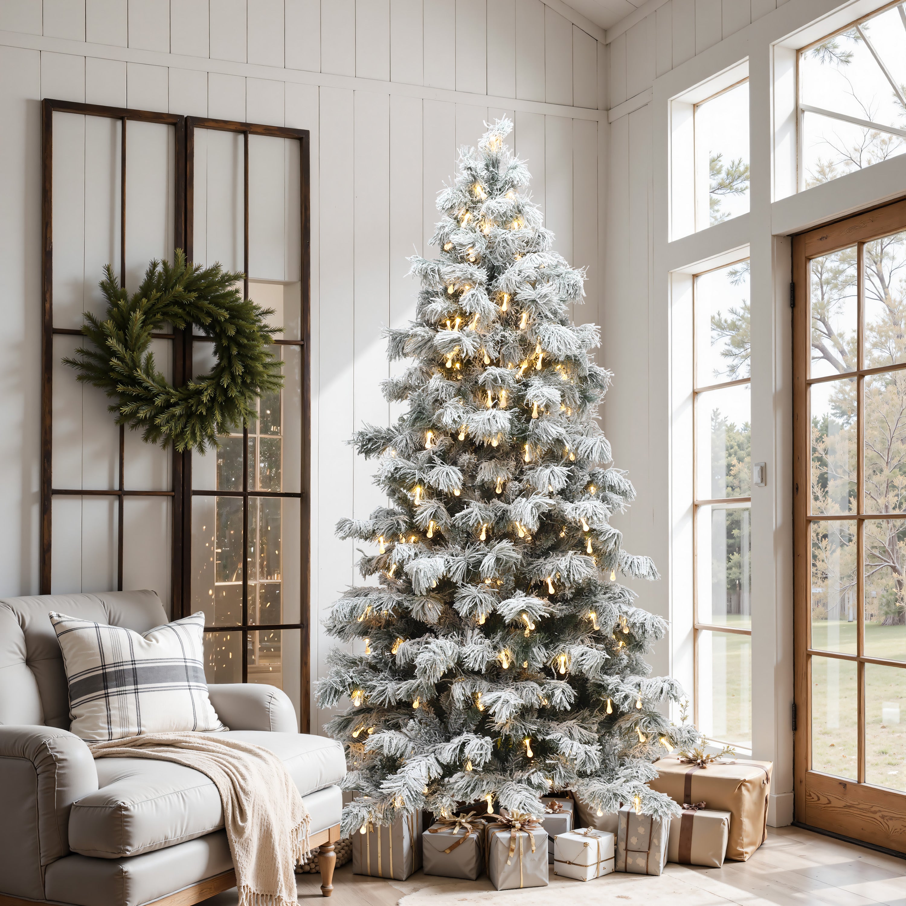 Transform your space into a serene winter escape with this Snow-Flocked Christmas Tree. Inspired by cedar trees and freshly fallen snow, its rich layering and lifelike appearance evoke the magic of a snowy forest.