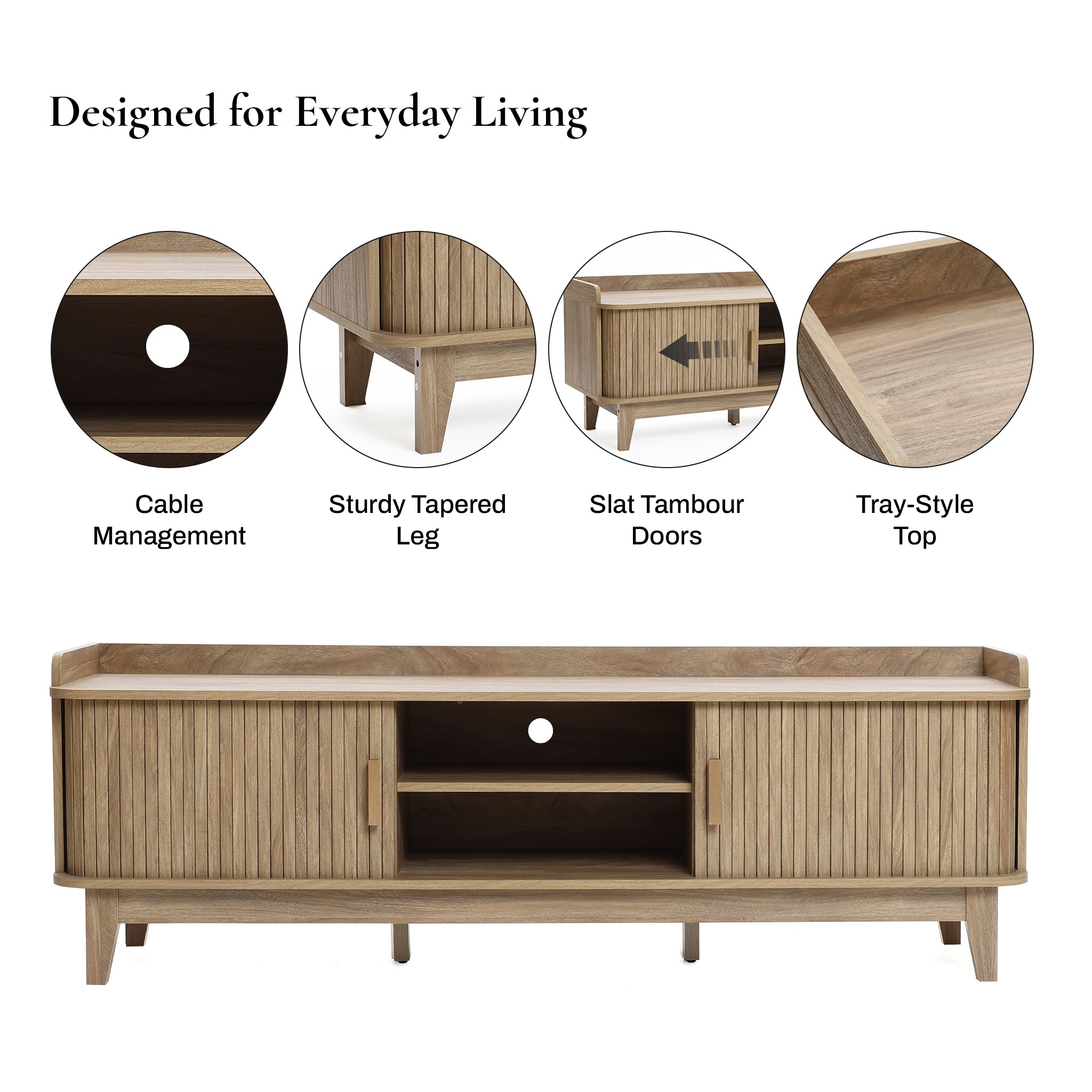 - Mid-Century Design: Entertainment center features a tray top and sliding tambour doors.