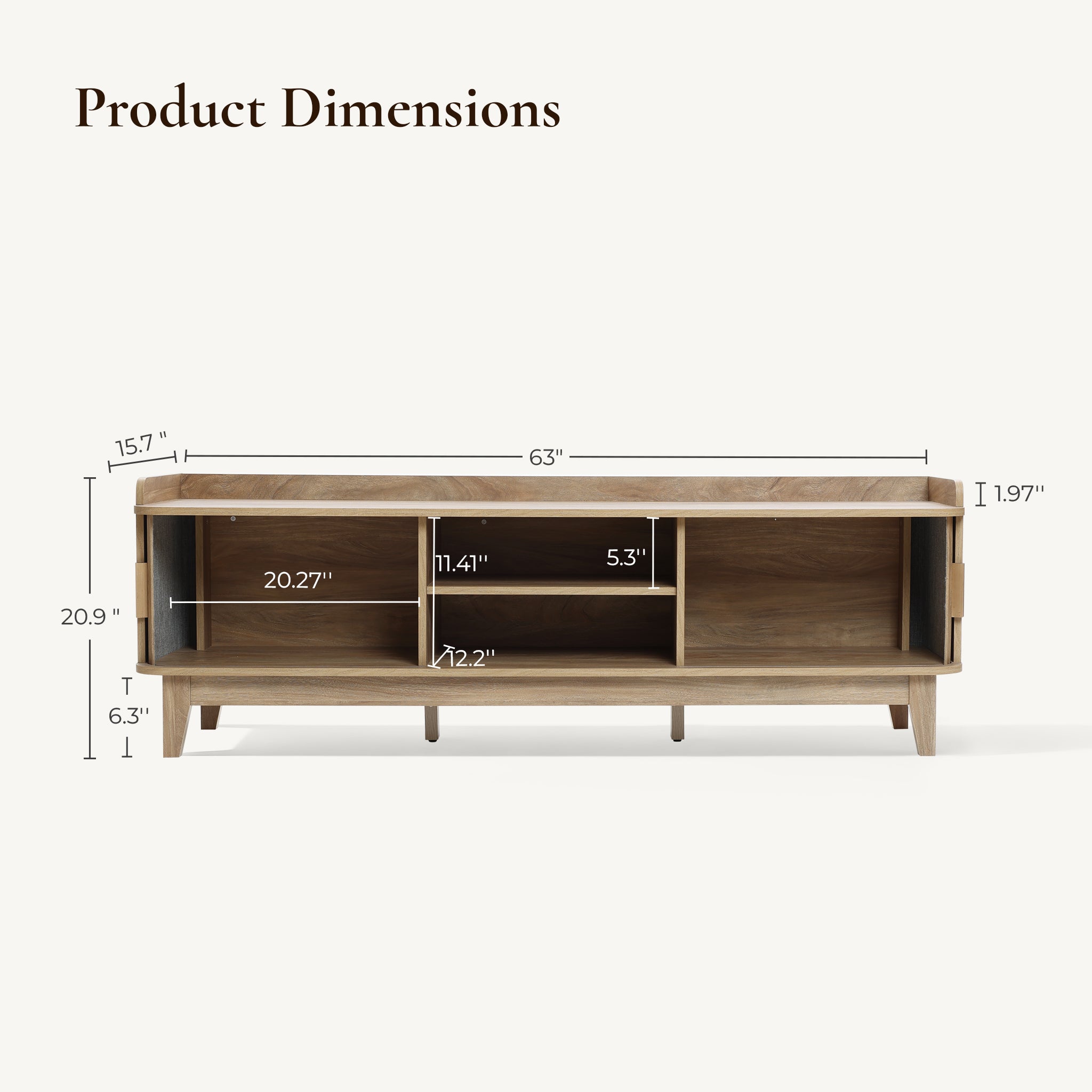 - Product Dimensions: Measures 63" W x 15.7" D x 20.9" H, supporting TVs up to 70".