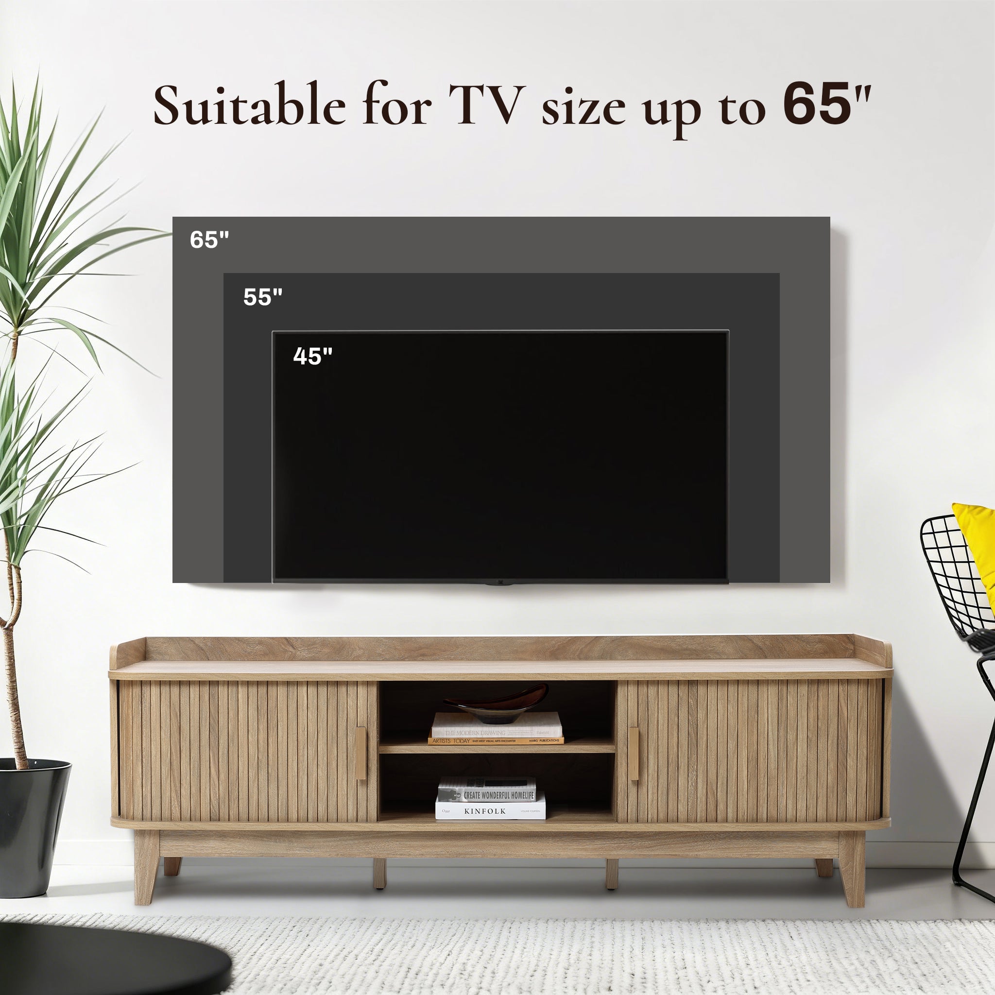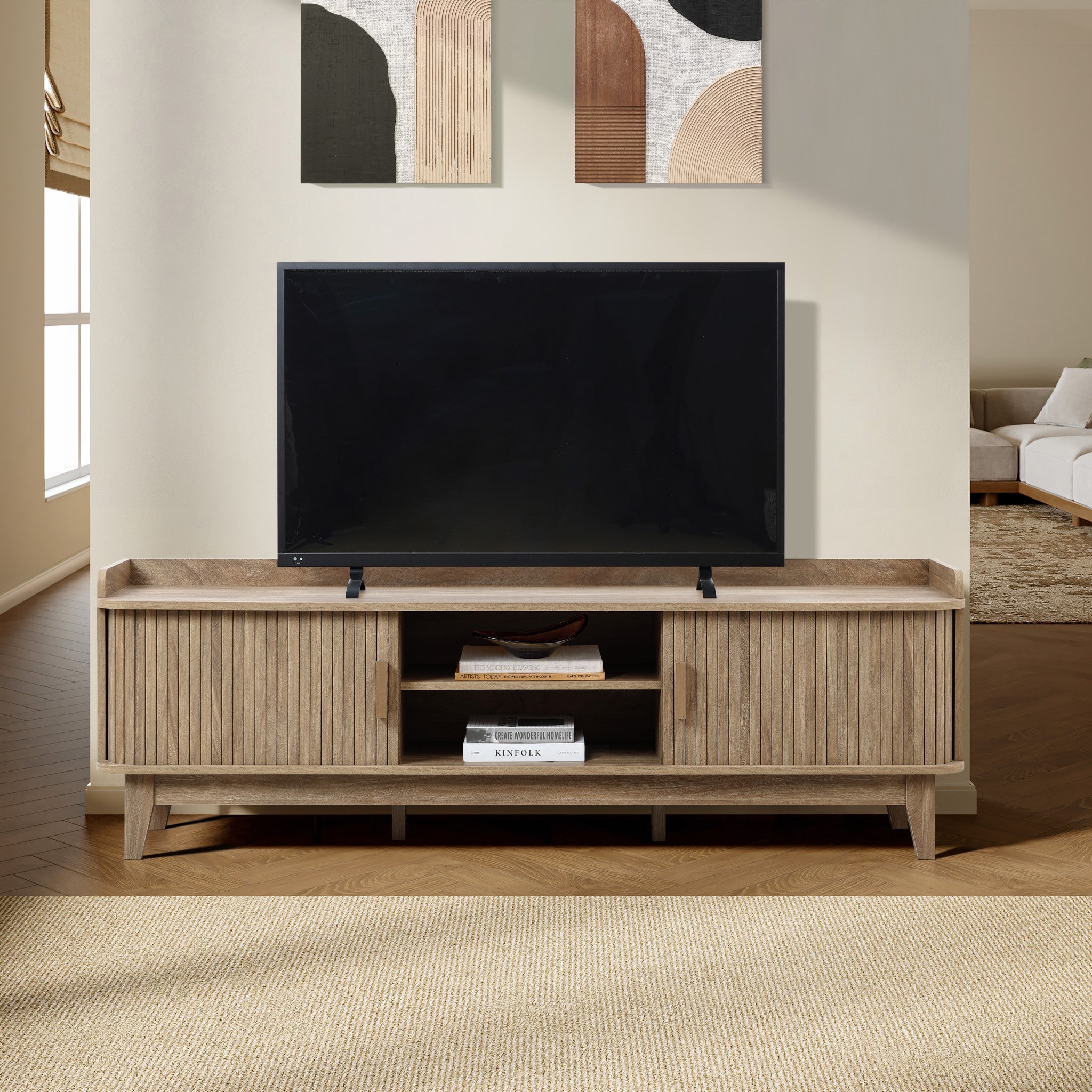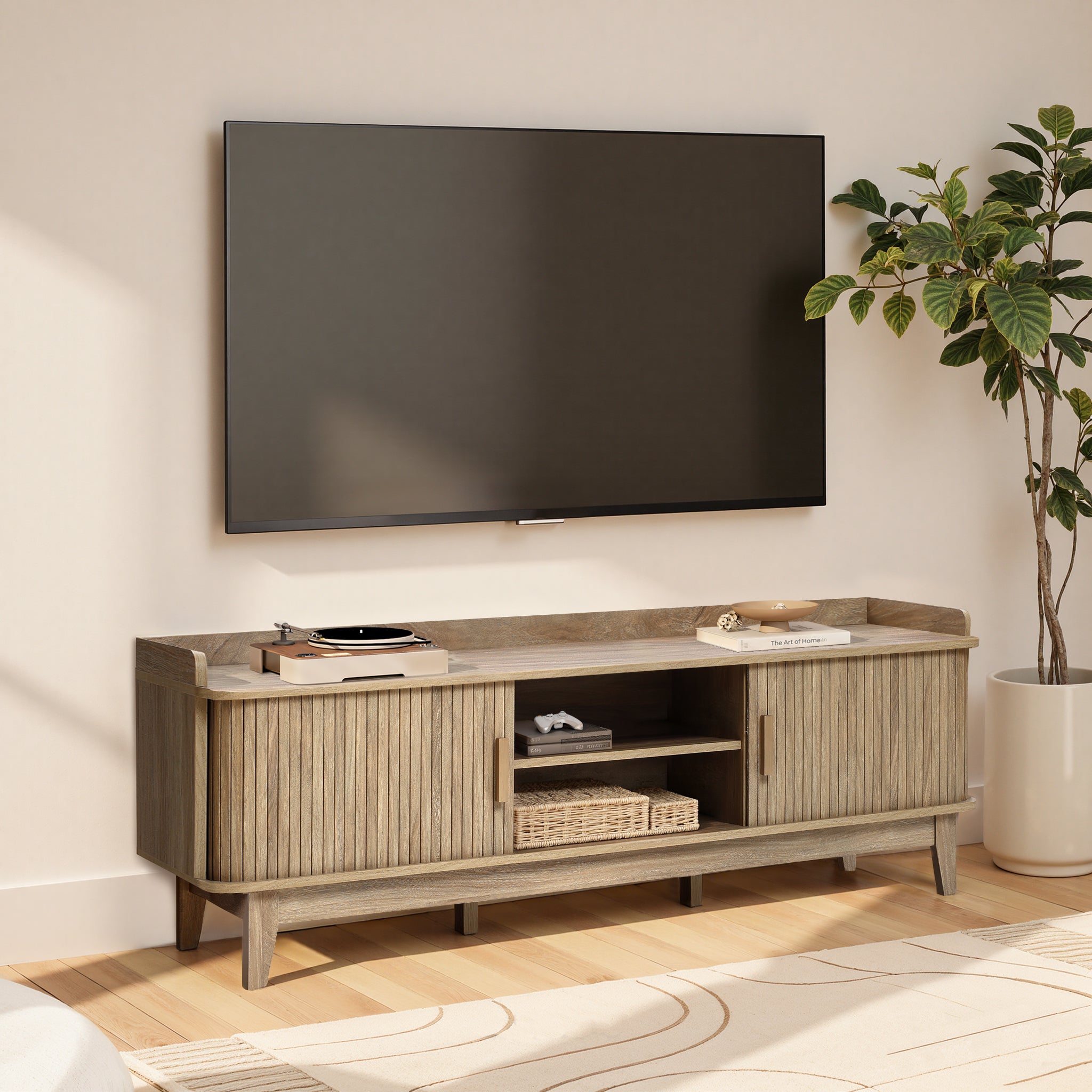 Mid-Century TV Stand with Sliding Tambour Doors for TVs up to 65''