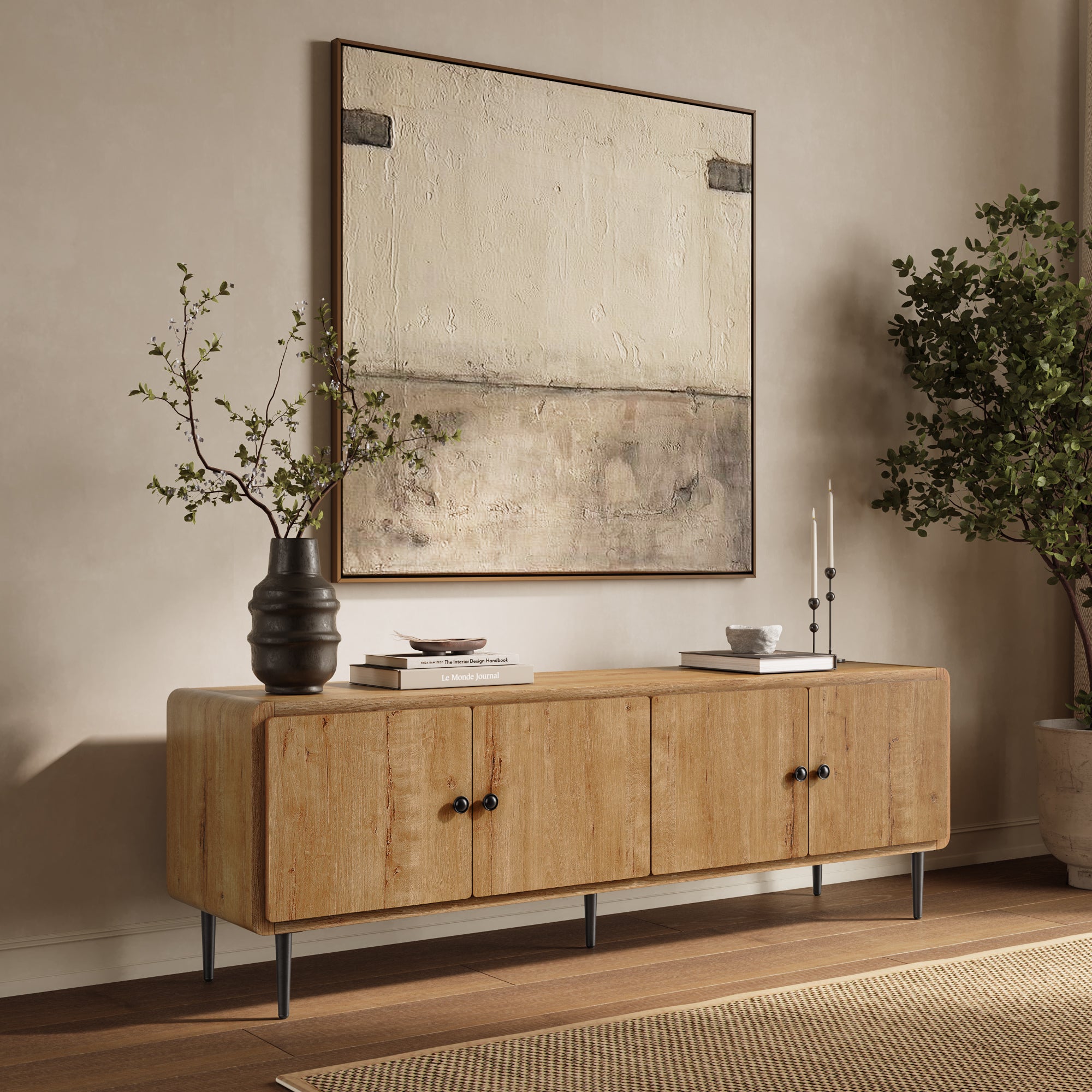 This modern TV stand crafted in a warm natural wood tone with rounded edges and a minimalist silhouette. Designed to declutter your space while elevating your décor.