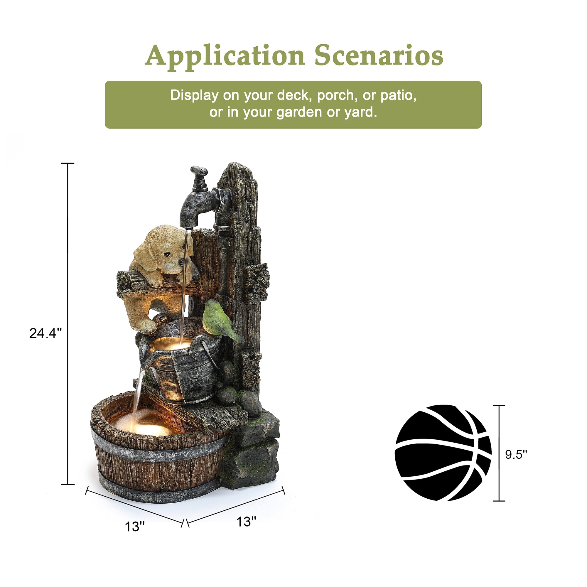 Add a touch of farmhouse charm to your patio with this adorable Puppy Patio Fountain. Designed with a playful puppy sitting beside a rustic farmhouse faucet, this fountain brings both personality and tranquility to your outdoor decor. Crafted from weather-resistant resin and enhanced with built-in LED lights, it creates a warm, inviting glow at night. This puppy fountain is perfect for patios, porches, or garden corners where you want to highlight whimsy and movement. Whether you're creating a dog-friendly retreat or a charming farmhouse look, this puppy outdoor fountain fits seamlessly into your style. A must-have farmhouse outdoor fountain for anyone who loves pets and peaceful water sounds.