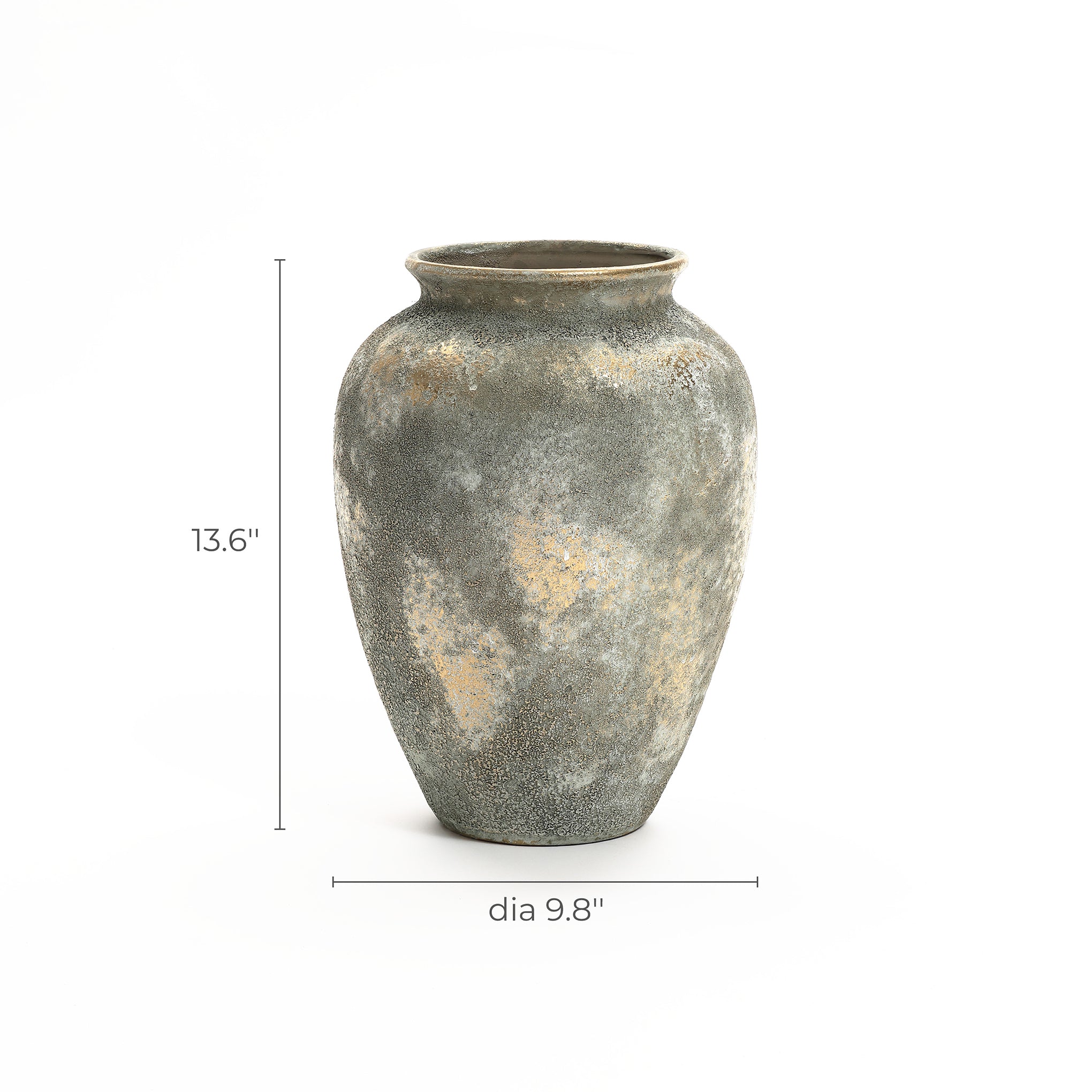 This stunning terracotta vase features a rustic gold and brown finish, which makes it a perfect statement piece for any room. Its earthy tones bring warmth and charm, complementing a wide range of interior styles from traditional to modern. With a height of 13.6", it offers a striking presence without overwhelming your decor, making it a versatile choice for your home.